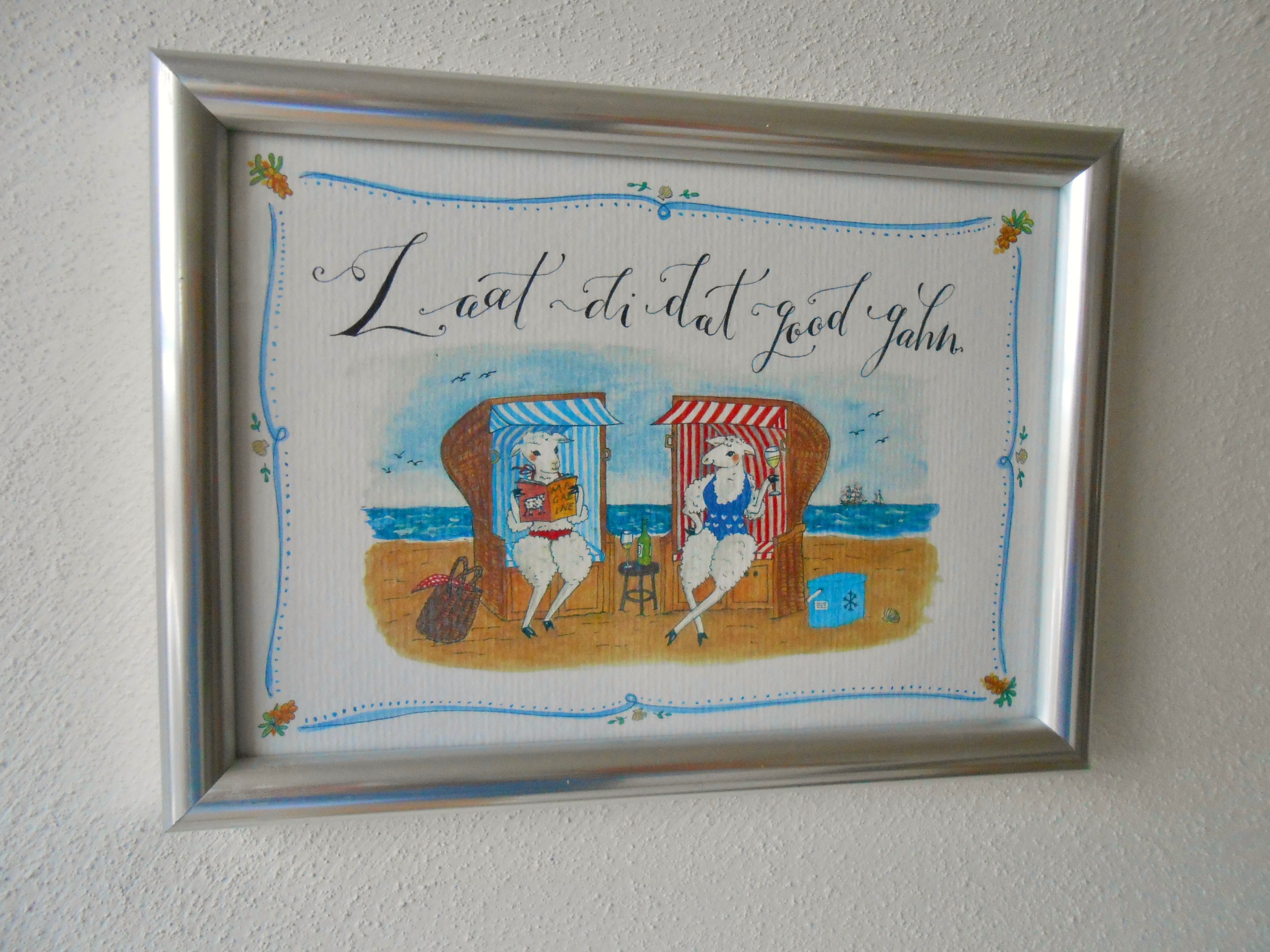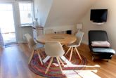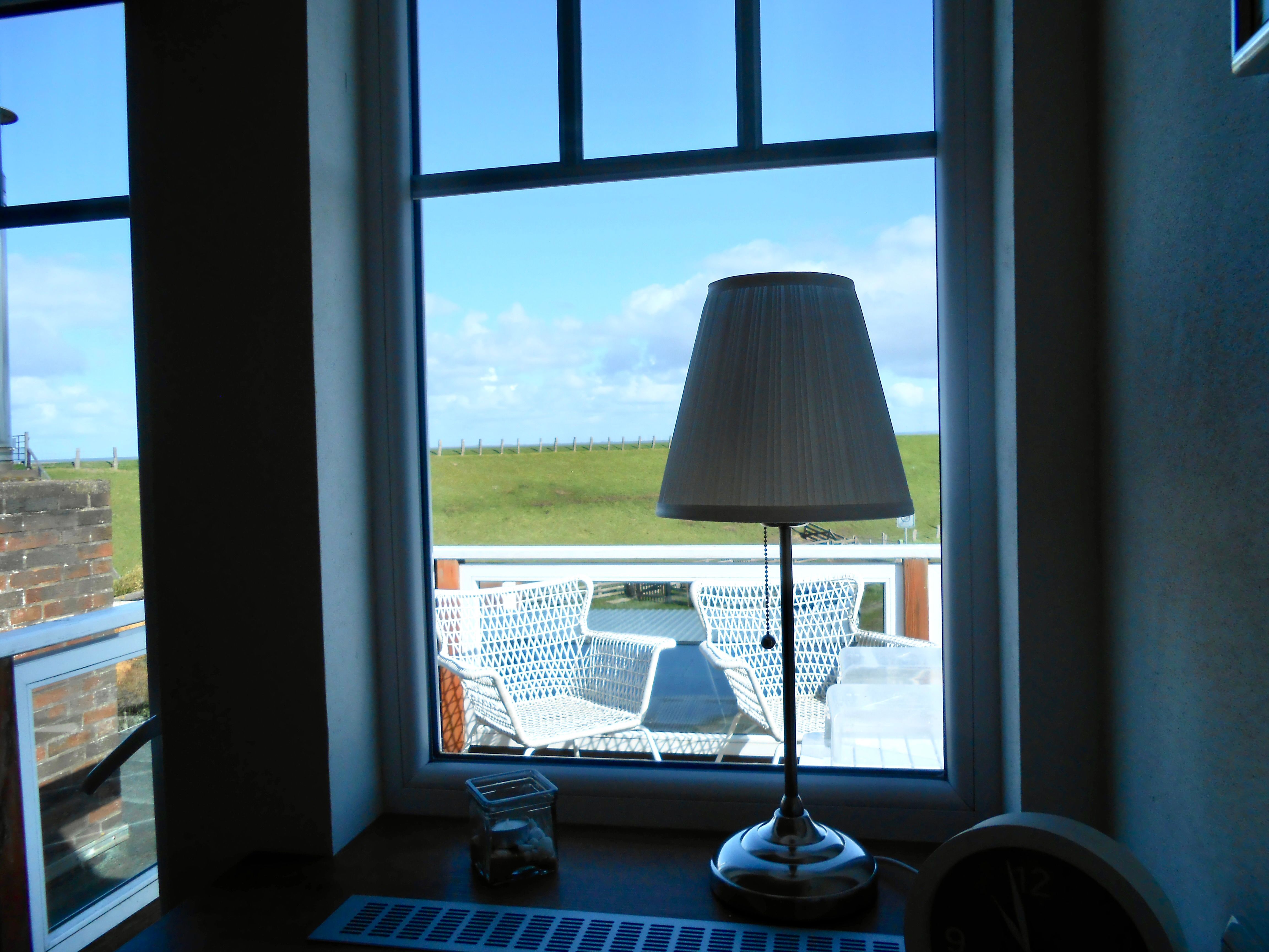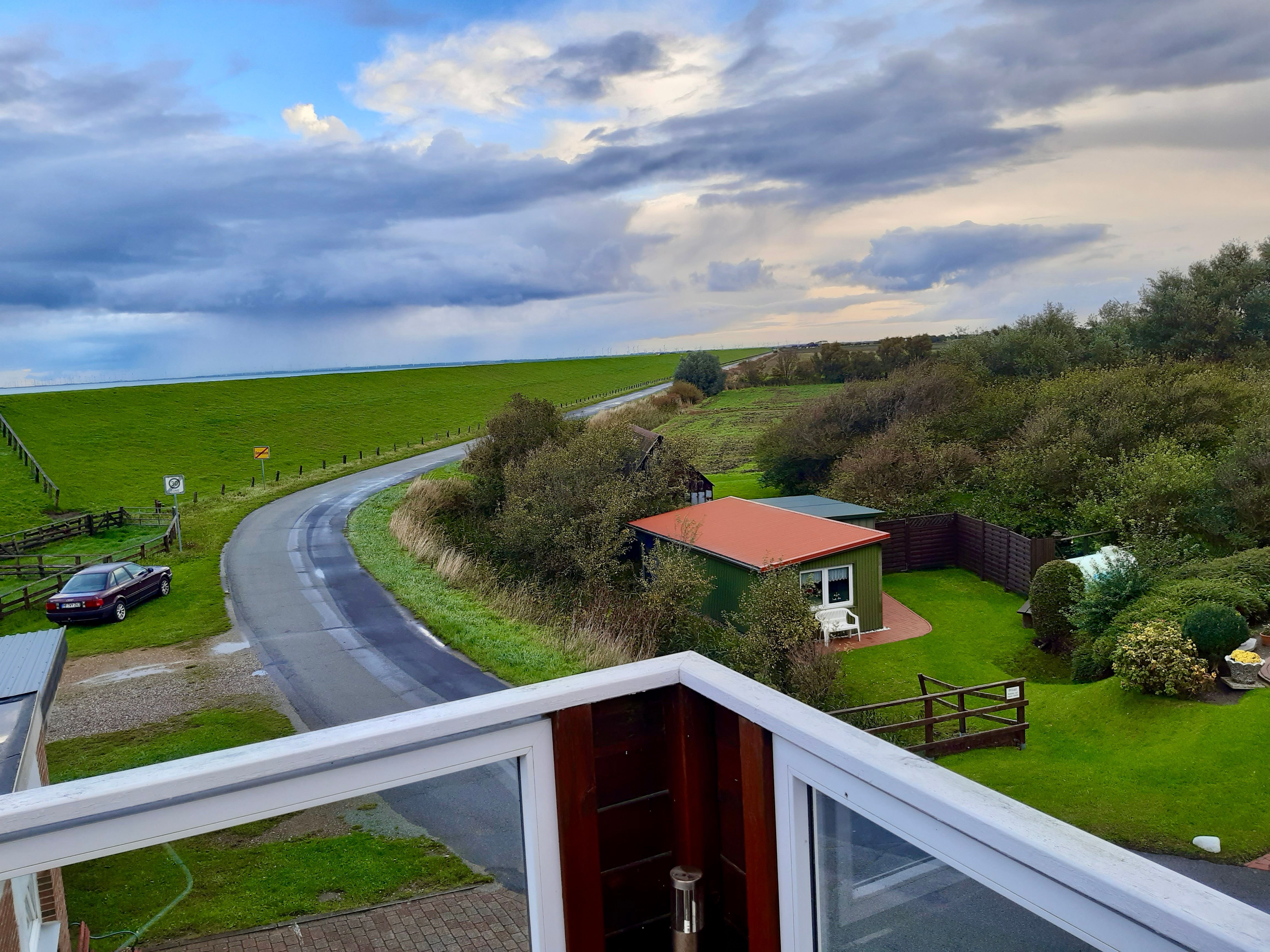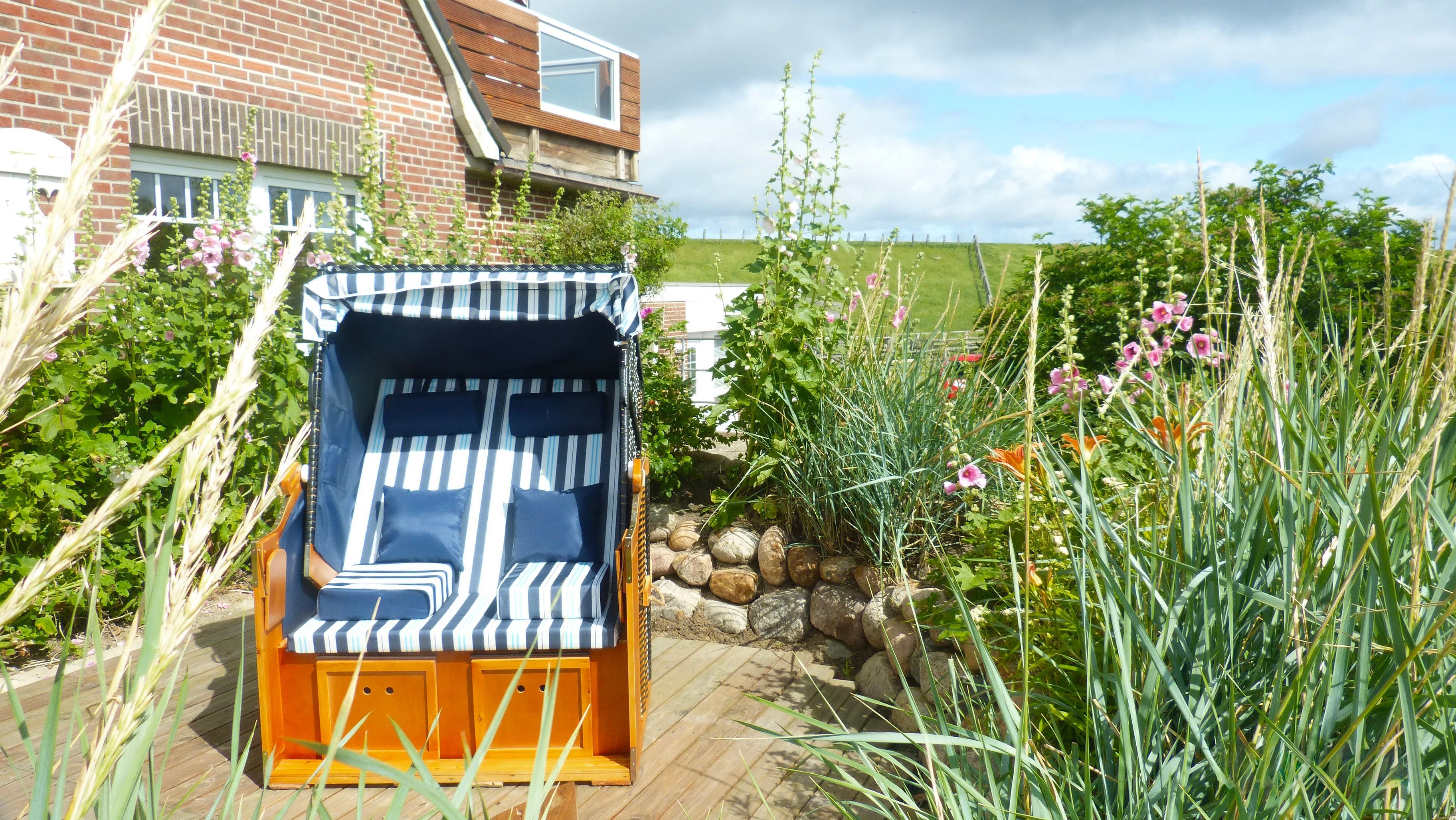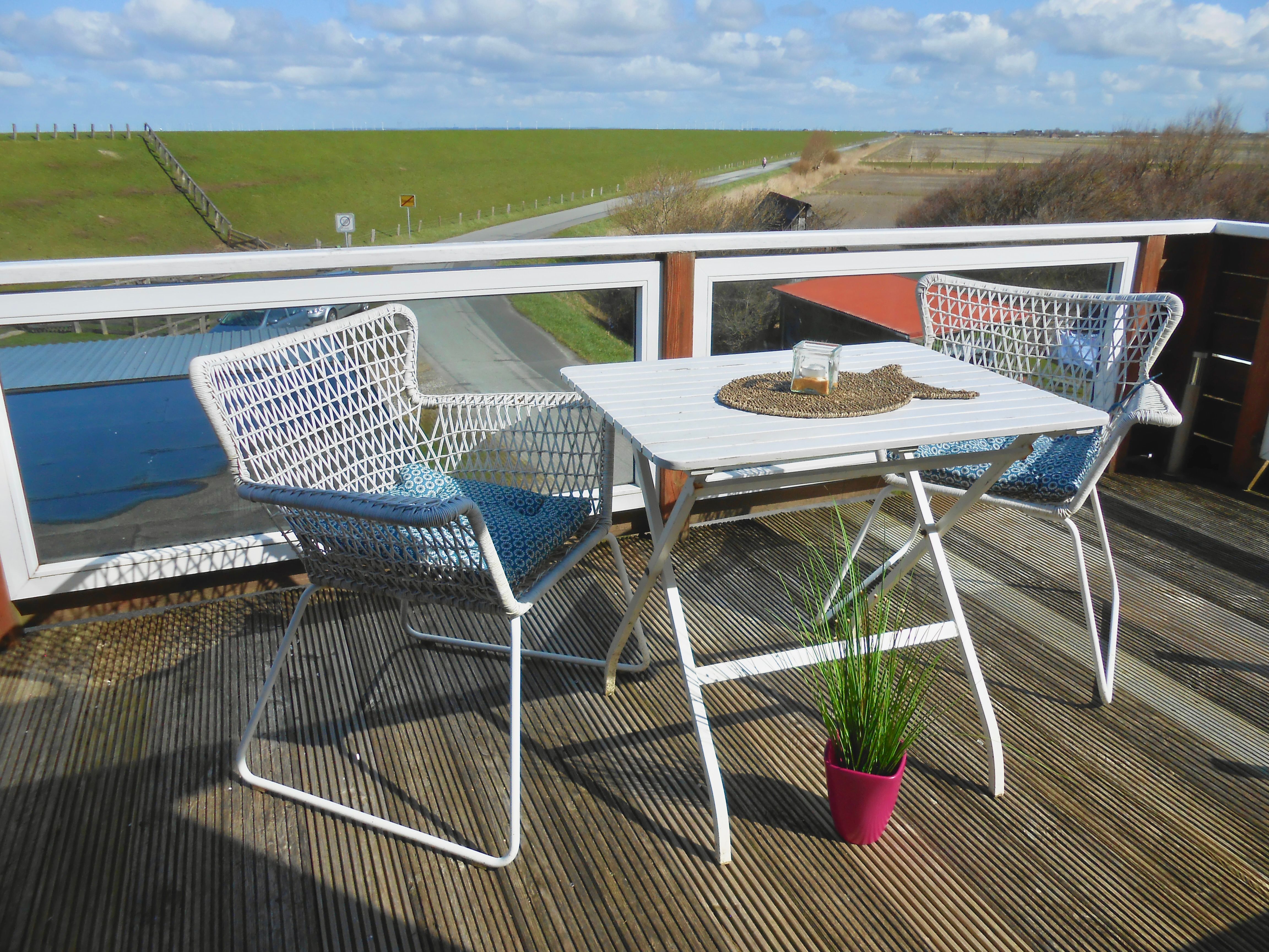 Der rund zehn Quadratmeter große Balkon ist das besondere Highlight der Wohnung. Sitzgelegenheiten und ein Strandkorb laden dazu ein, die frische Nordseeluft zu genießen und den Blick über Deich und Meer schweifen zu lassen. Bei guter Sicht reicht dieser bis zur Hamburger Hallig, ein Fernglas steht hierfür bereit.