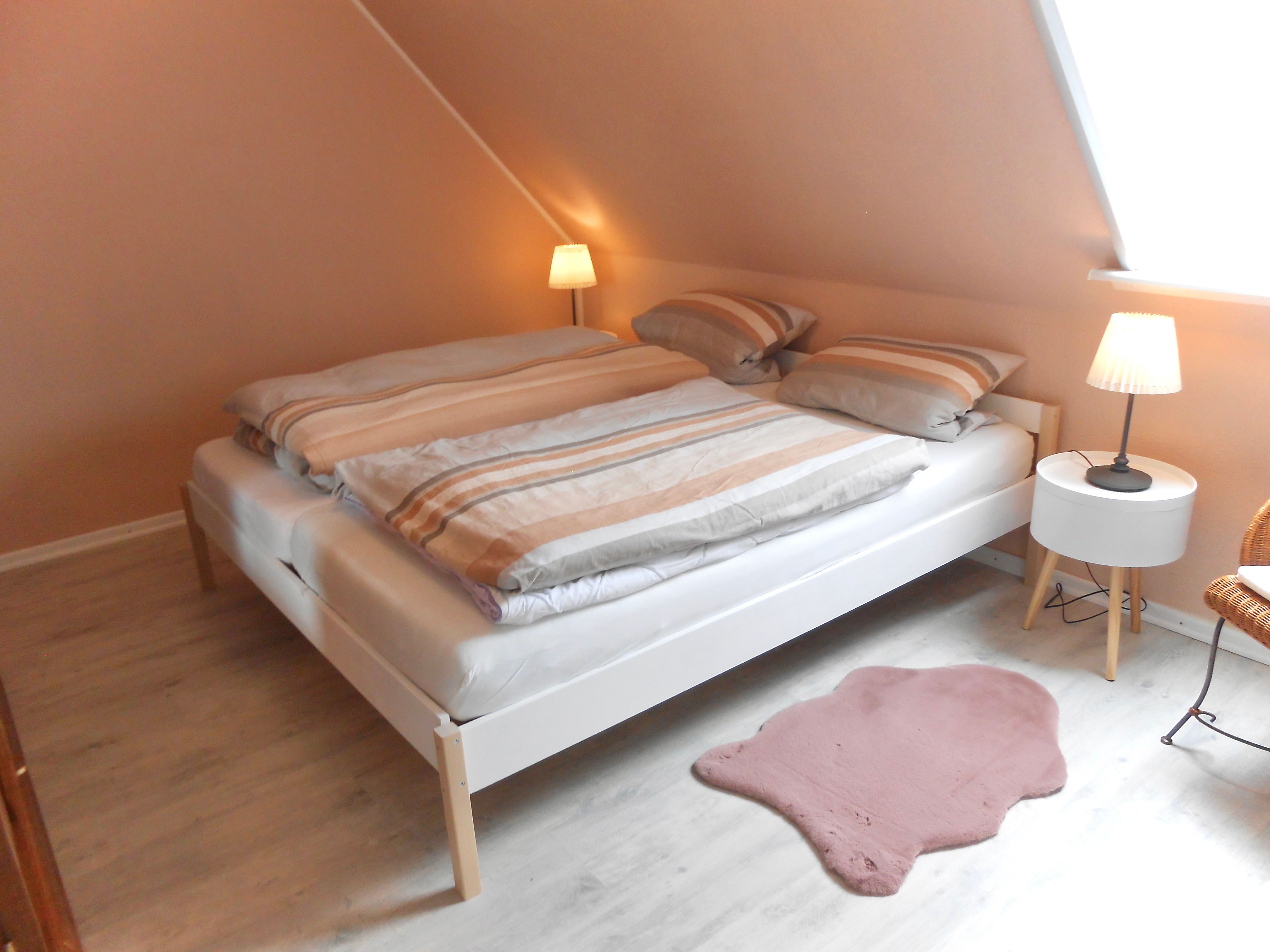 Die Wohnung verfügt über zwei Schlafzimmer. Eines ist mit einem Doppelbett ausgestattet, das zweite mit zwei Einzelbetten. Beide Schlafräume sind hell, warm gestaltet und klar eingerichtet. Holzakzente unterstreichen die wohnliche Atmosphäre und schaffen ruhige Rückzugsorte für erholsame Nächte.