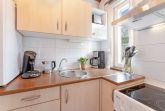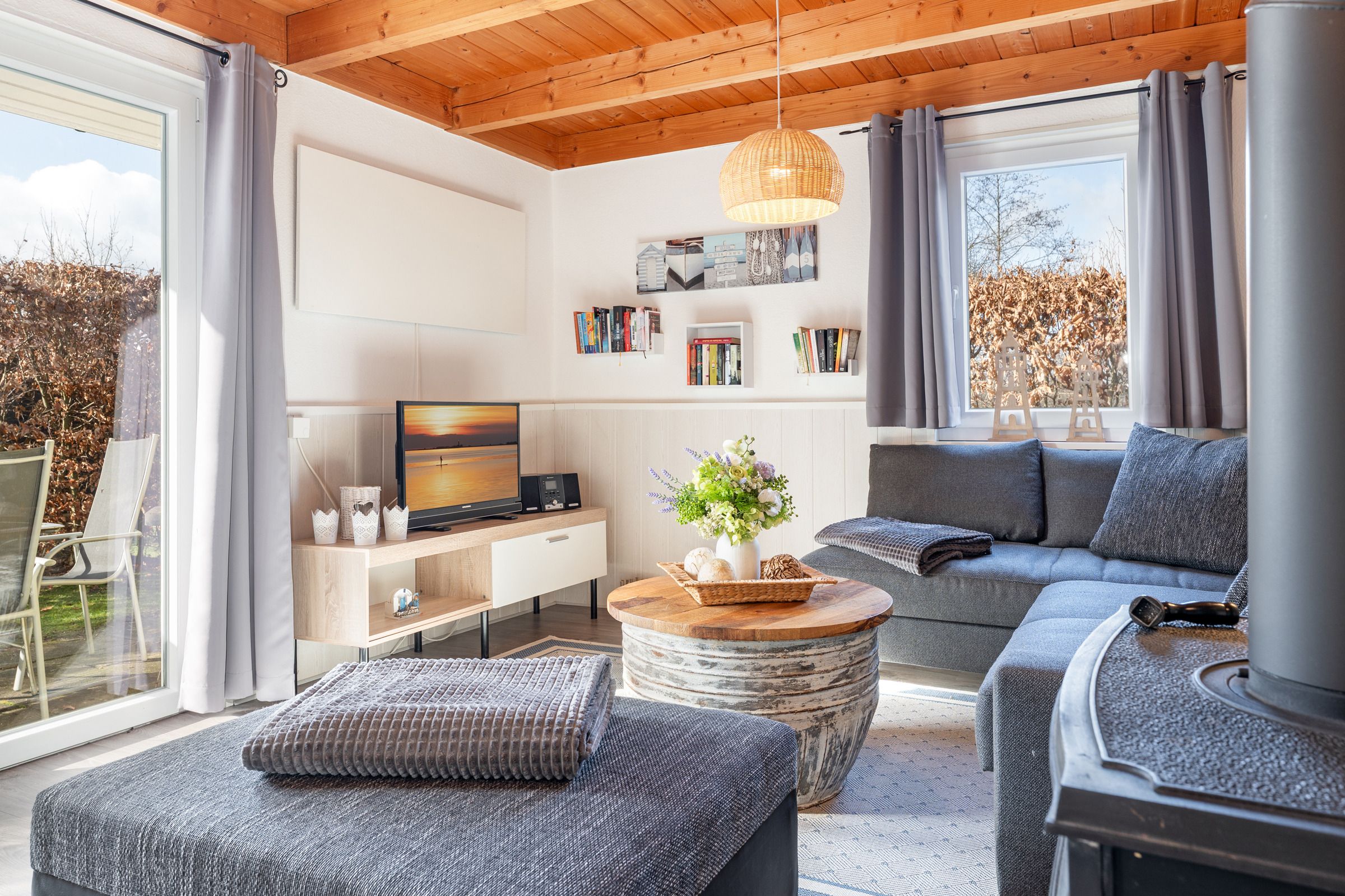 Der Rundgang beginnt im gemütlichen Wohnbereich, der mit einem Fernseher, Kamin und CD-Player ausgestattet ist und eine behagliche Atmosphäre schafft. Ihnen stehen zwei Terrassen zur Verfügung. Eine mit West- und eine mit Ost-Ausrichtung, jeweils mit 12cm Schwelle, die mit Gartenmöbeln, Sonnenschirm und Sonnenliegen zum Entspannen einladen. Das Grillen ist erlaubt. Weiter geht es in die voll ausgestattete Küche, in der sie sich optimal in Ihrem Urlaub versorgen können. Im angrenzenden Essbereich genießen Sie gemeinsame Mahlzeiten.