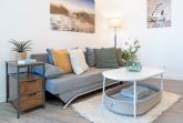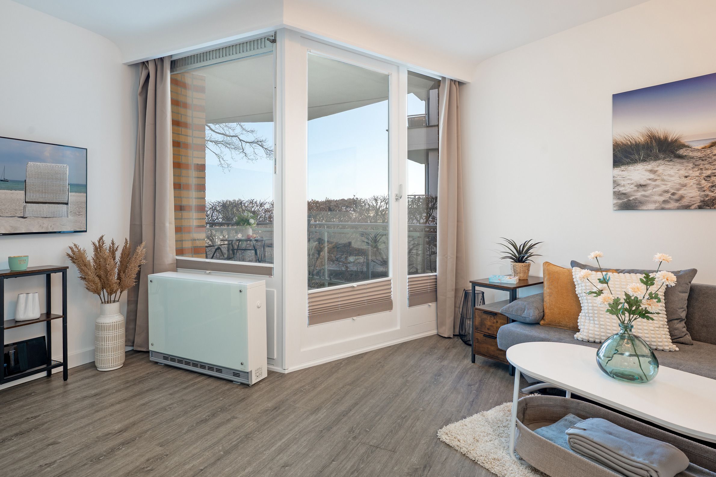 Willkommen in Ihrer Auszeit an der Ostsee! Der helle Wohnbereich lädt mit einem gemütlichen Sofa, welches sich auch als Schlafsofa (140 x 190 cm) eignet und einem TV-Gerät zu entspannten Stunden ein. Große Fenster sorgen für eine freundliche Atmosphäre und führen direkt auf den möblierten Balkon mit Ost-Ausrichtung, auf dem Sie die Sonne genießen können – bitte beachten Sie, dass das Grillen hier nicht gestattet ist.