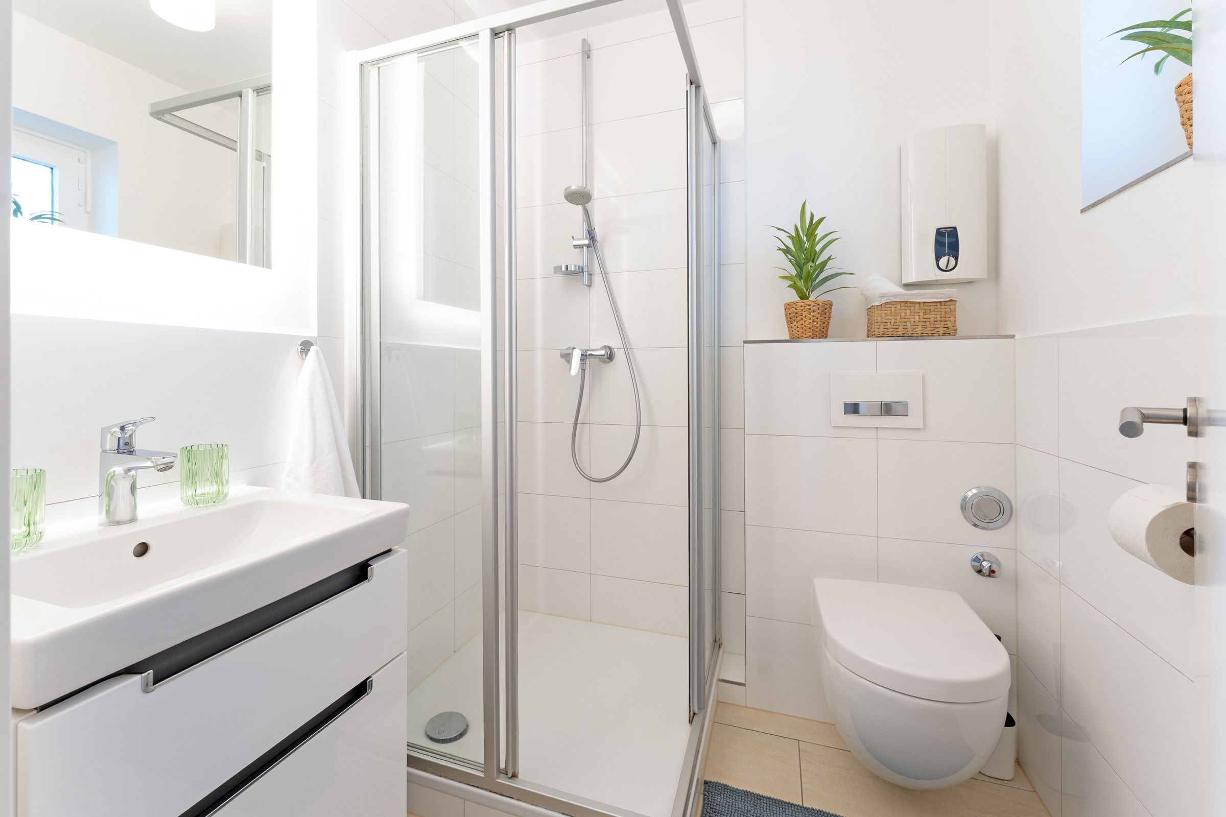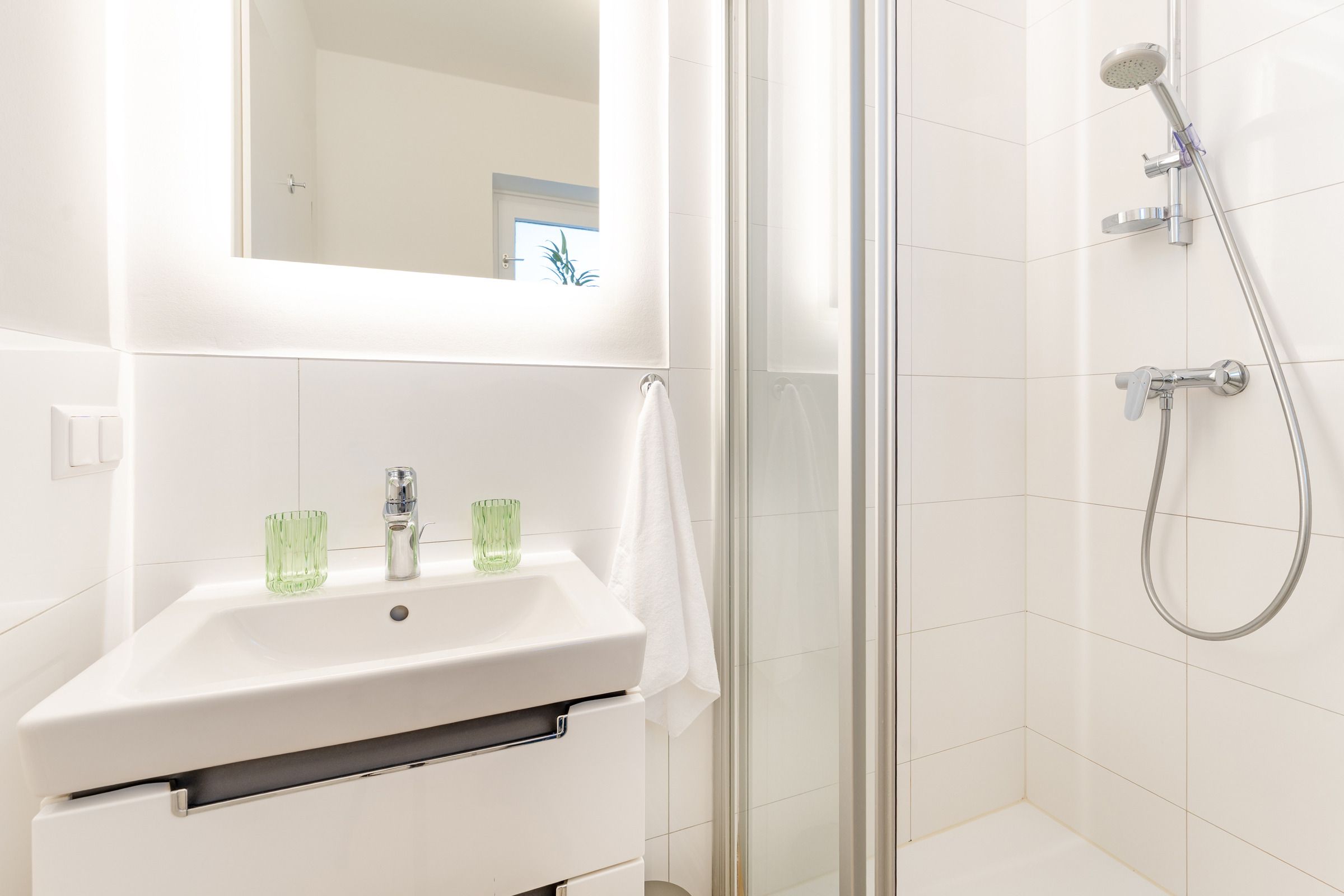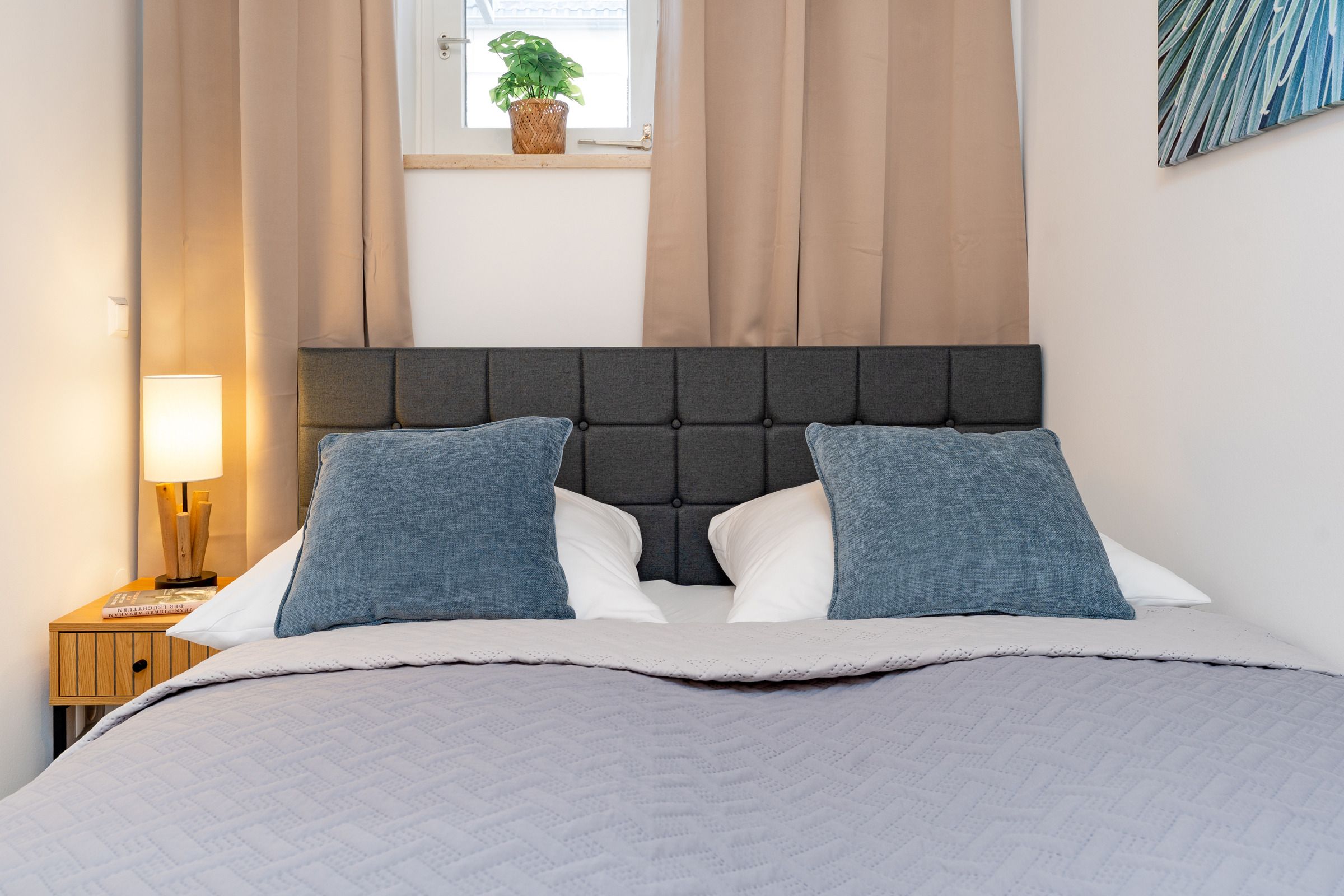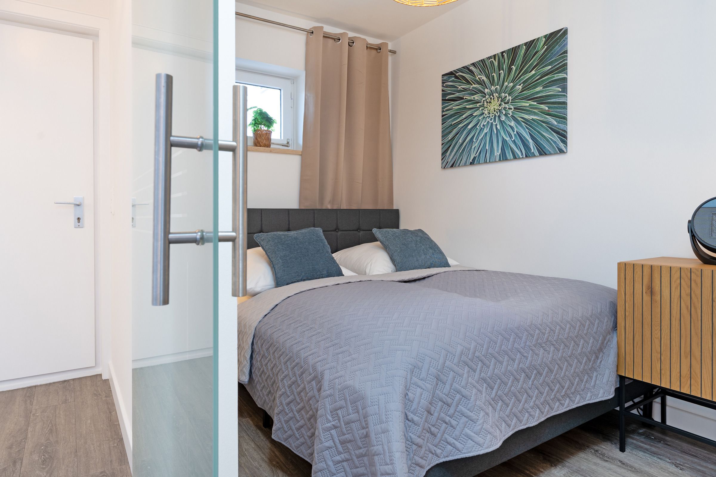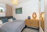 Im Schlafzimmer erwartet Sie ein komfortables Doppelbett sowie ein Sideboard mit Stauraum. Verdunklungsmöglichkeiten sind vorhanden und sorgen für erholsamen Schlaf. Das moderne Badezimmer ist mit Dusche/WC, Handtuchheizkörper und Föhn ausgestattet.