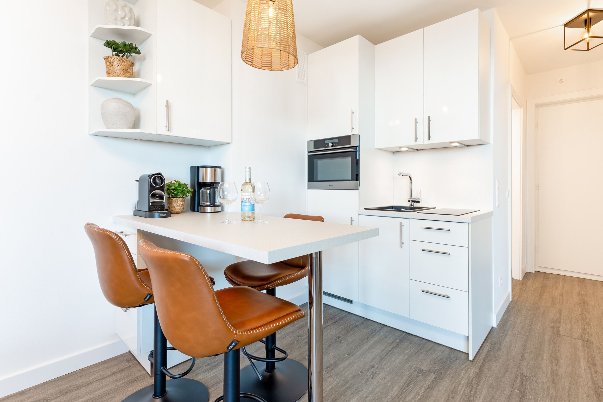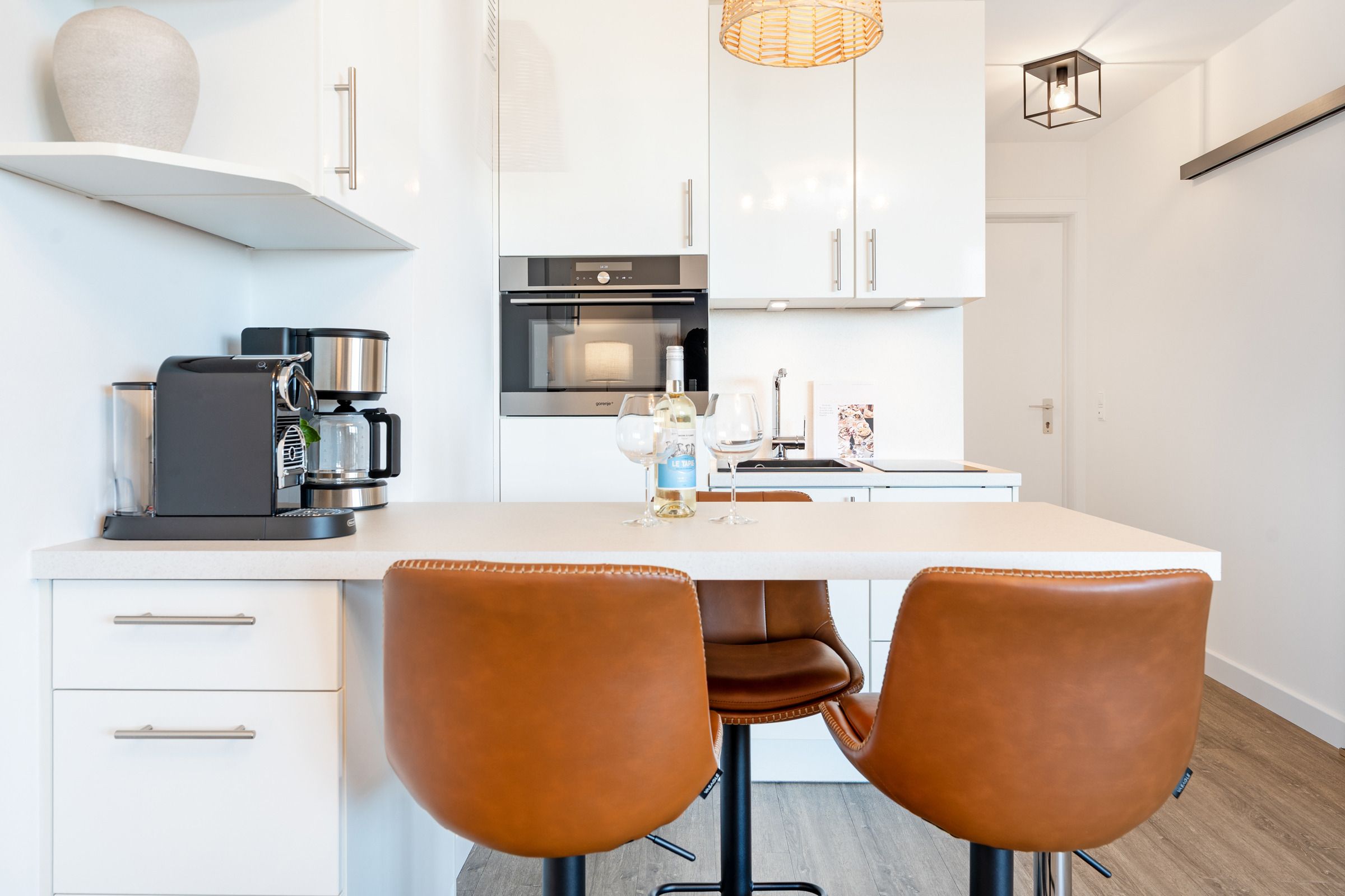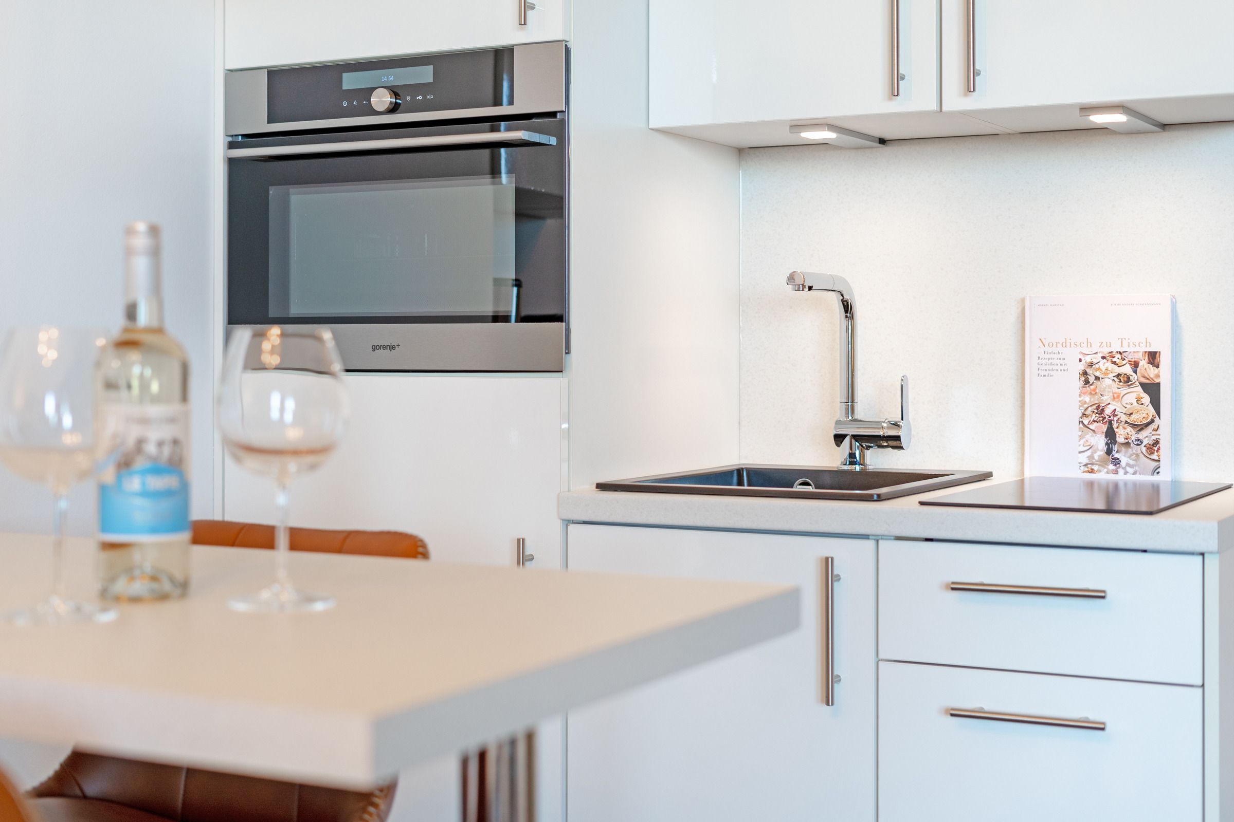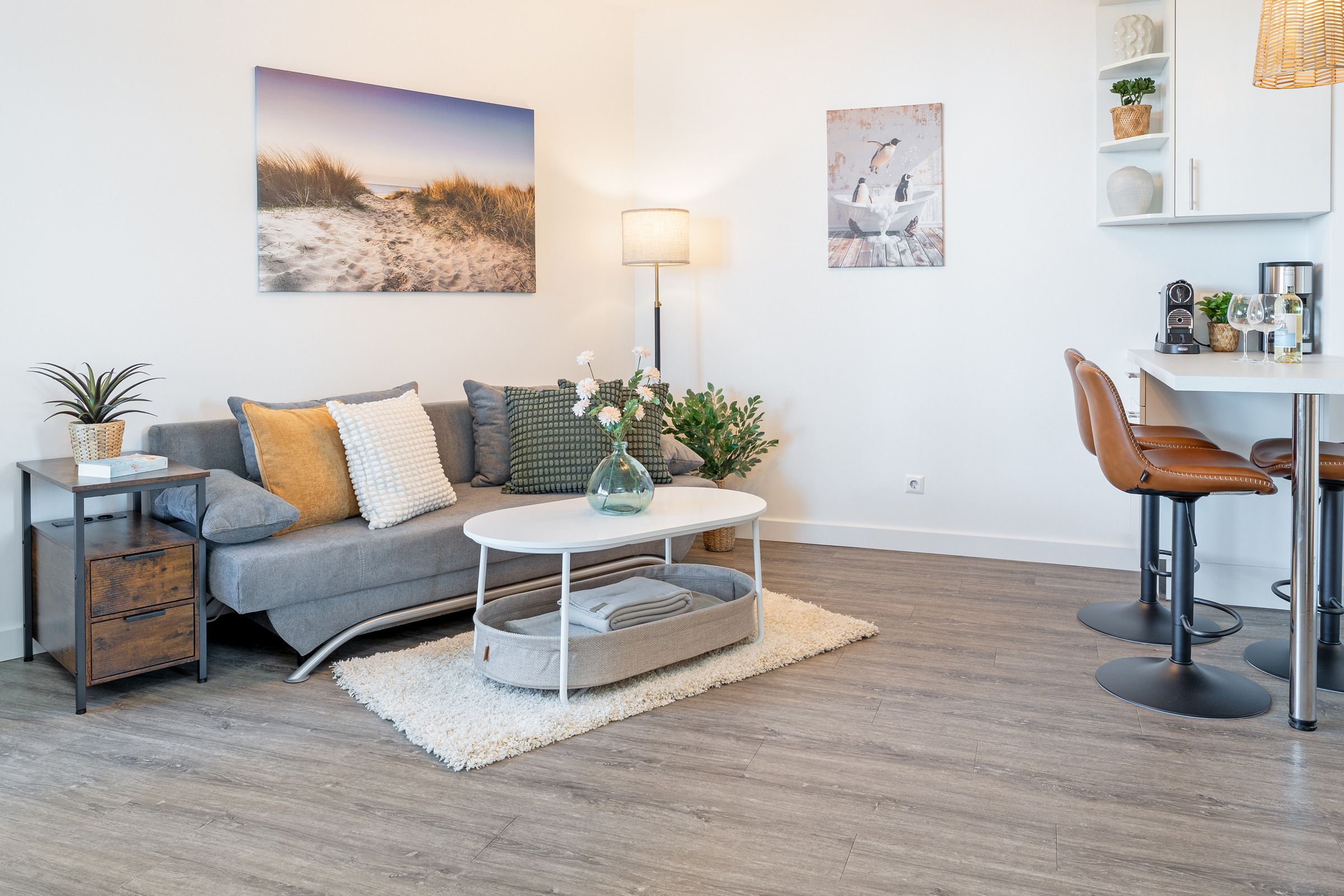 Die offene, modern ausgestattete Küche ist harmonisch in den Wohnraum integriert und verfügt über einen Herd, Kühlschrank mit Gefrierfach, Kaffeemaschinen (Filter & Kapsel), Mikrowelle, Toaster und Wasserkocher – ideal, um gemeinsame Mahlzeiten zuzubereiten. Der Essbereich bietet ausreichend Platz für gesellige Abende.