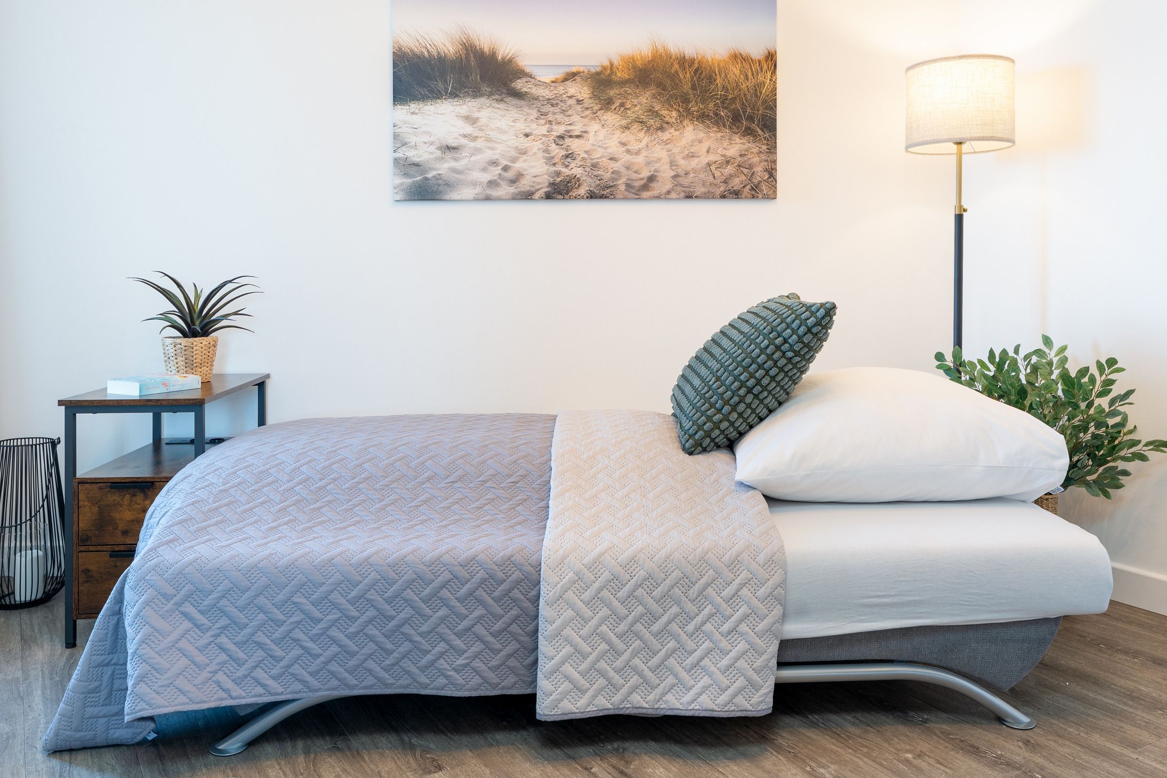 Wohn-/Schlafzimmer: 1 Schlafsofa (140 x 190 cm), Verdunkelung: Plissee, Vorhänge, Platz für ein Babybett vorhanden