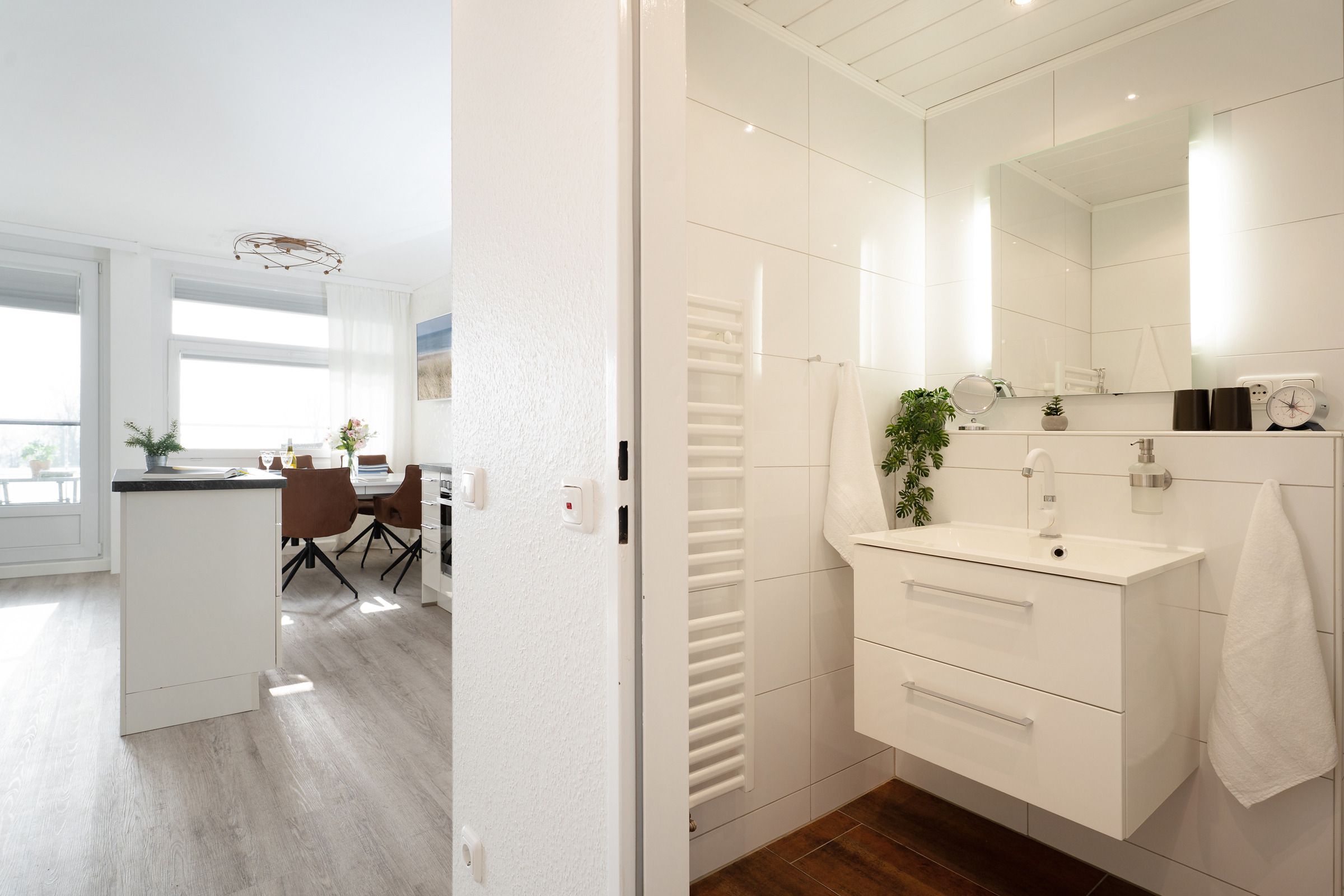Die Ferienwohnung empfängt Sie mit einem hellen Wohnbereich, der Wohnen, Schlafen und Entspannen harmonisch miteinander verbindet. Ein bequemes Doppelbett sowie eine gemütliche Schlafsofa mit TV laden zu erholsamen Stunden ein. Vom Wohnraum aus gelangen Sie auf den Balkon, auf dem Sie die frische Ostseeluft genießen können. Die integrierte Küchenzeile ist gut ausgestattet und bietet mit Ceranfeld, Backofen, Kühlschrank, Kaffeemaschine, Wasserkocher und weiteren Küchenutensilien alles, was Sie für die Selbstverpflegung benötigen; ein Essplatz ergänzt den Raum ideal. Der Schlafbereich ist offen integriert und sorgt für komfortable Nächte. Das Badezimmer verfügt über Dusche und WC und ist funktional gestaltet.
