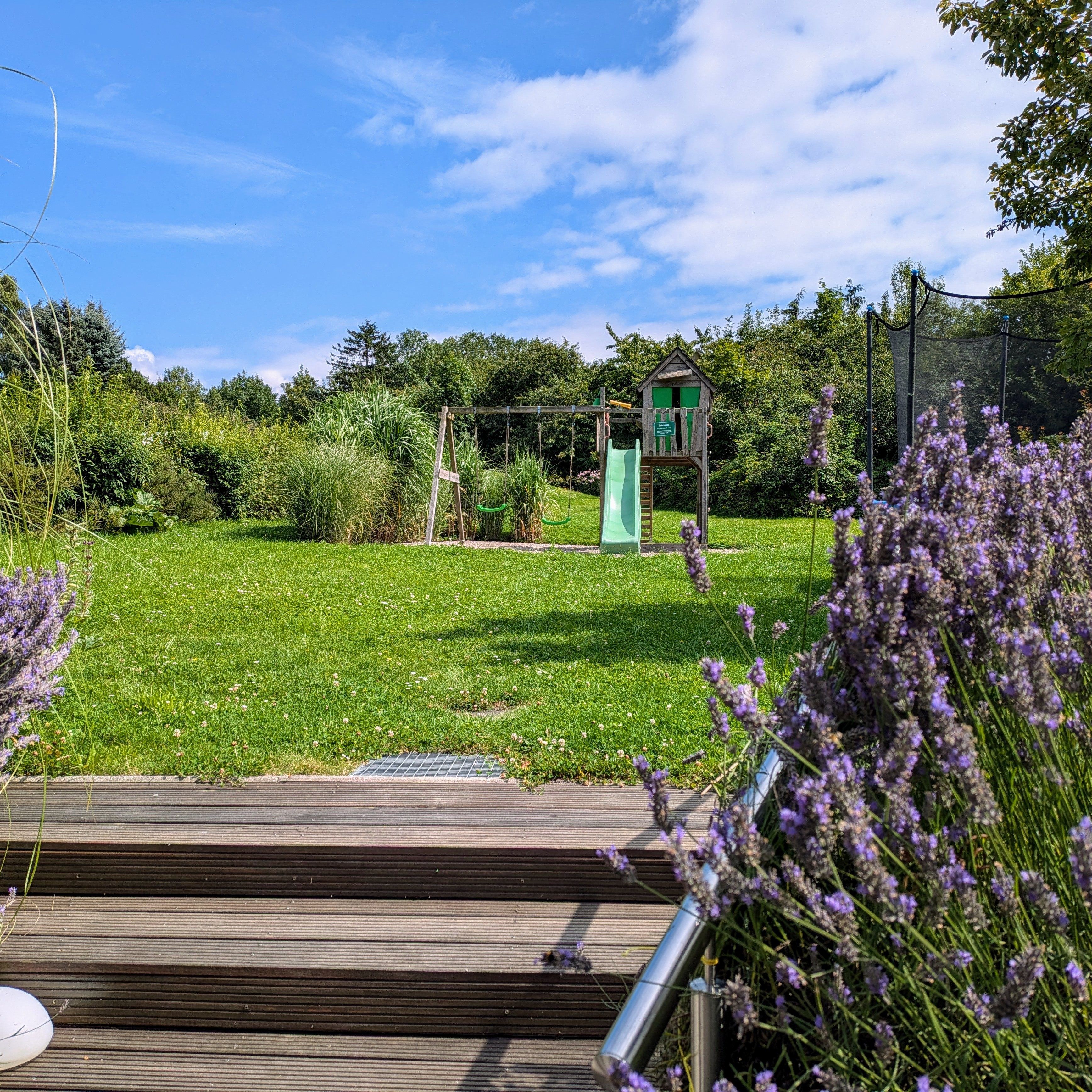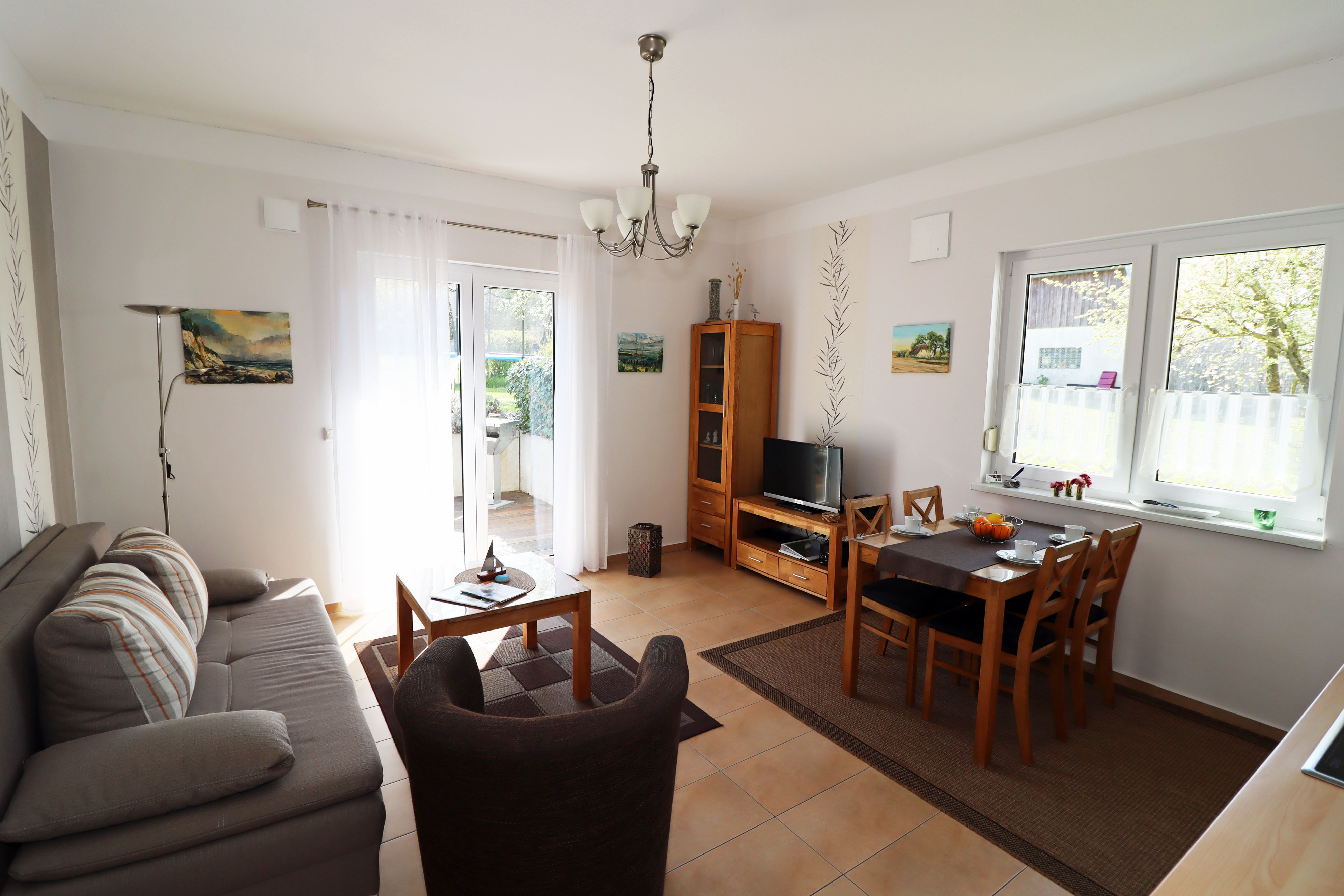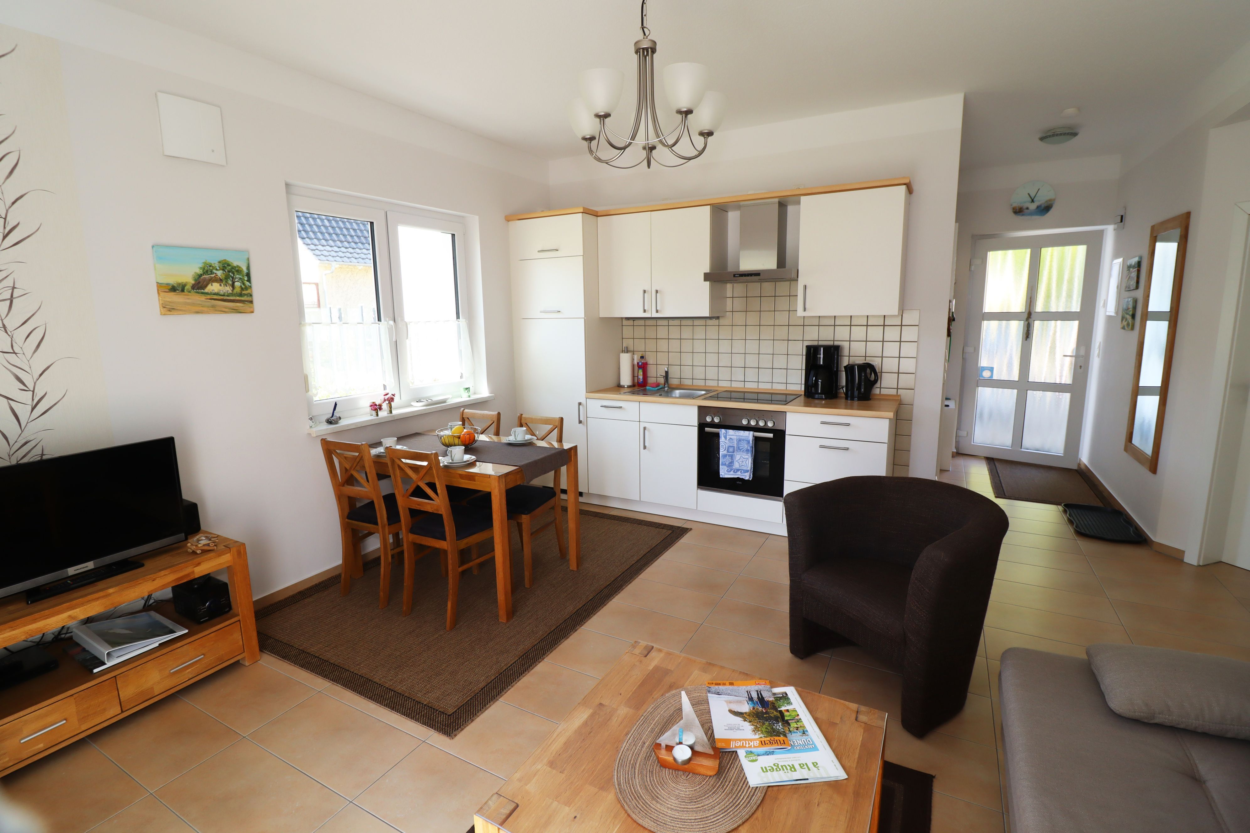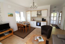 Das im Jahr 2013 erbaute altersgerechte Ferienhaus hat eine Größe von 53 m² und ist ausgestattet mit Fußbodenheizung, kontrollierter Be- und Entlüftungsanlage, es ist umweltbewusst durch Photovoltaik und Geothermie. Alle Fenster haben Außenjalousien. Die Einbauküche enthält einen Herd mit Backofen, einen Geschirrspüler und eine Mikrowelle, eine Kaffeemaschine sowie einen Wasserkocher. Im Ferienhaus erwartet Sie neben dem kombinierten Küchen-/Wohnbereich ein Schlafzimmer mit zwei Betten, die als Doppelbett oder auf Wunsch als zwei Einzelbetten genutzt werden können. Die Betten haben eine komfortable Höhe. Das zweite Schlafzimmer verfügt über ein Bett, welches bei Bedarf ausgezogen werden kann und als weitere Schlafgelegenheit dient (0,80 x 1,70m). Für Babys und Kleinkinder werden ein Kinderreisebett und ein Kinderhochstuhl zur Verfügung gestellt. Der helle und gemütliche Wohnbereich umfasst eine Couch mit Tisch, einen Fernseher, DVD-Player, Bücher und Spiele, weiterhin befindet sich hier der Esstisch mit vier Stühlen. Das Bad ist ausgestattet mit Dusche, Waschmaschine, Fön und Fenster. Ein Parkplatz am Haus, Bettwäsche und Handtücher sind inklusive. Genießen Sie die Morgensonne auf der Terrasse und lassen den Urlaubstag mit einem Grillabend ausklingen, die Kinder spielen auf dem Spielplatz und dem Trampolin.