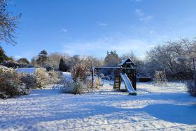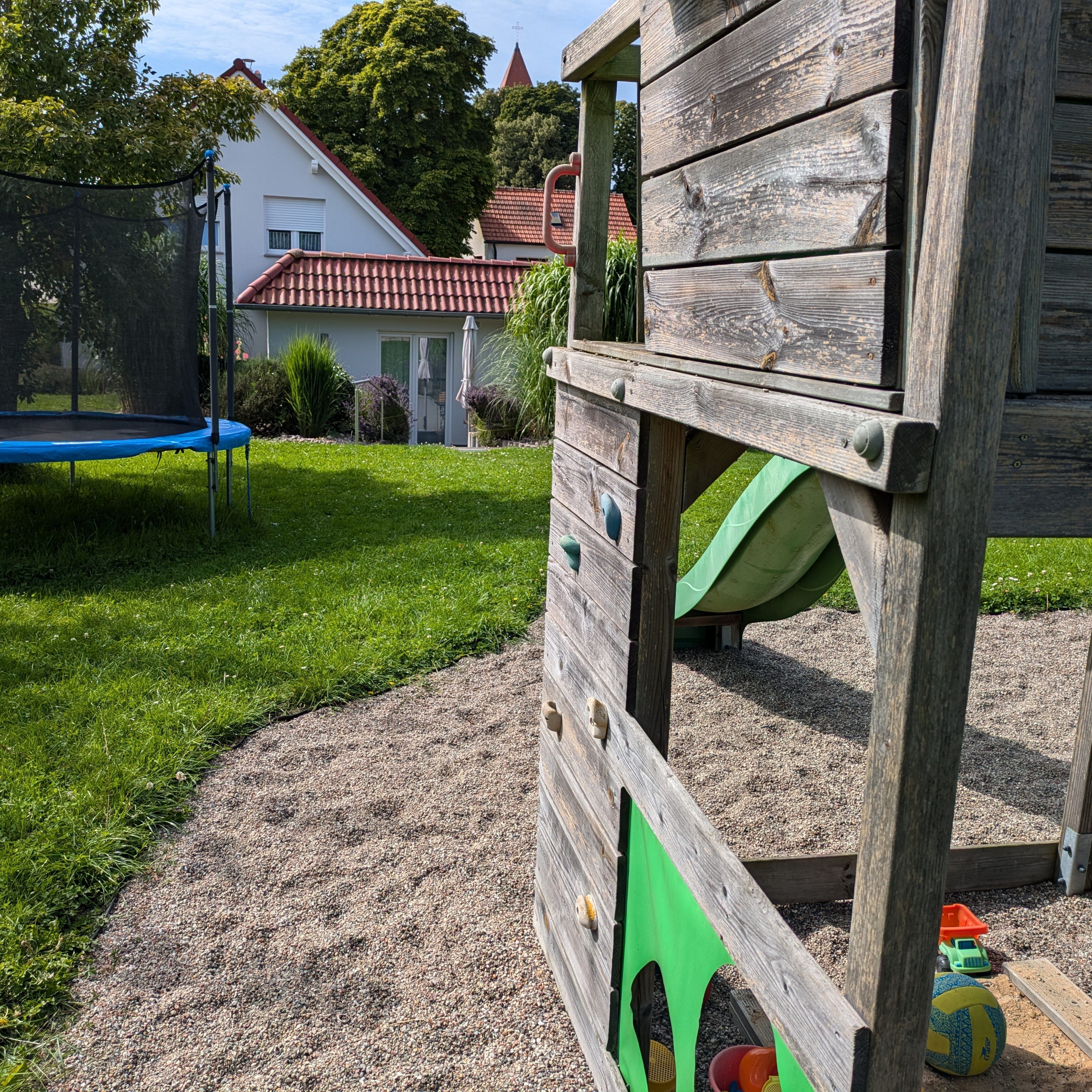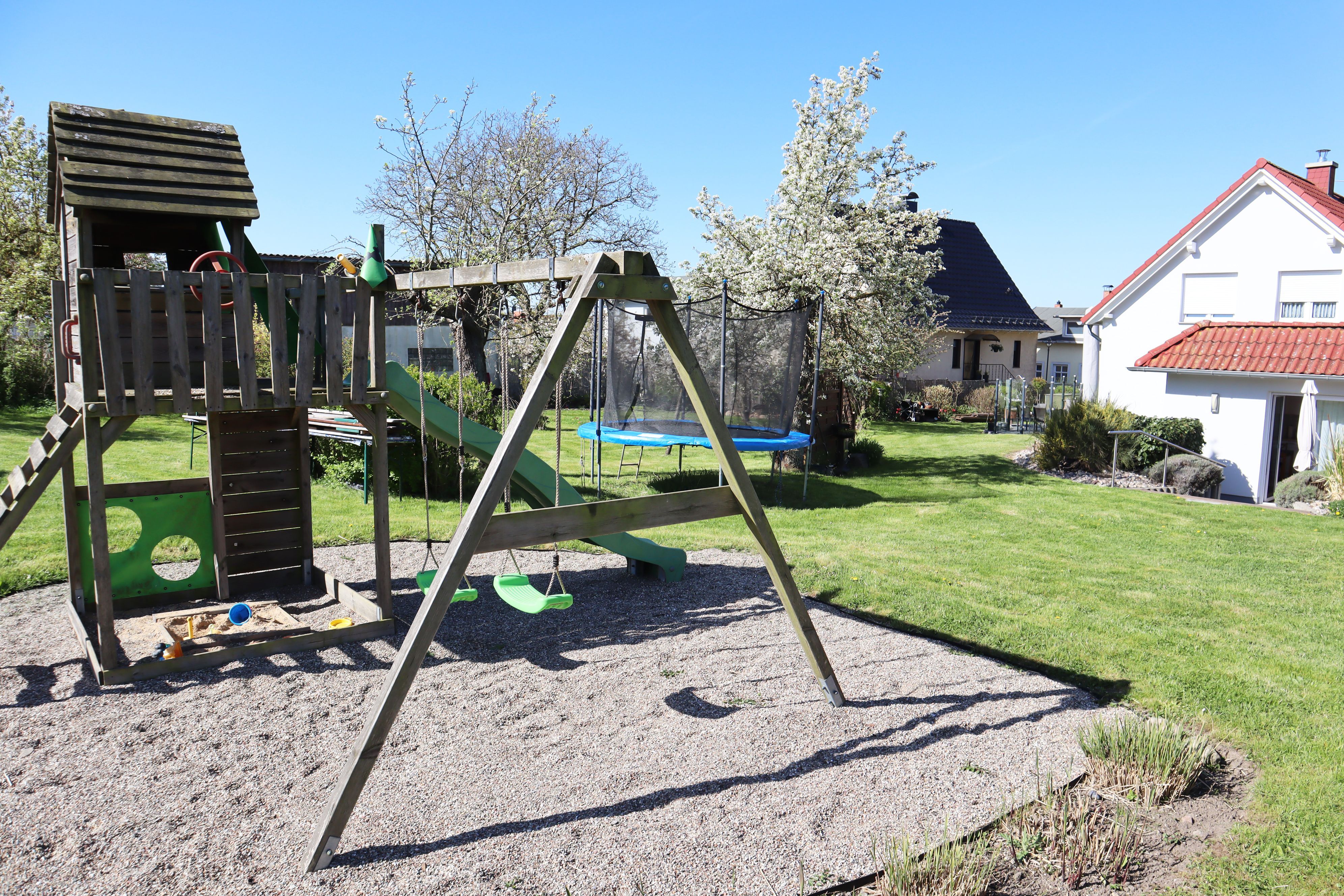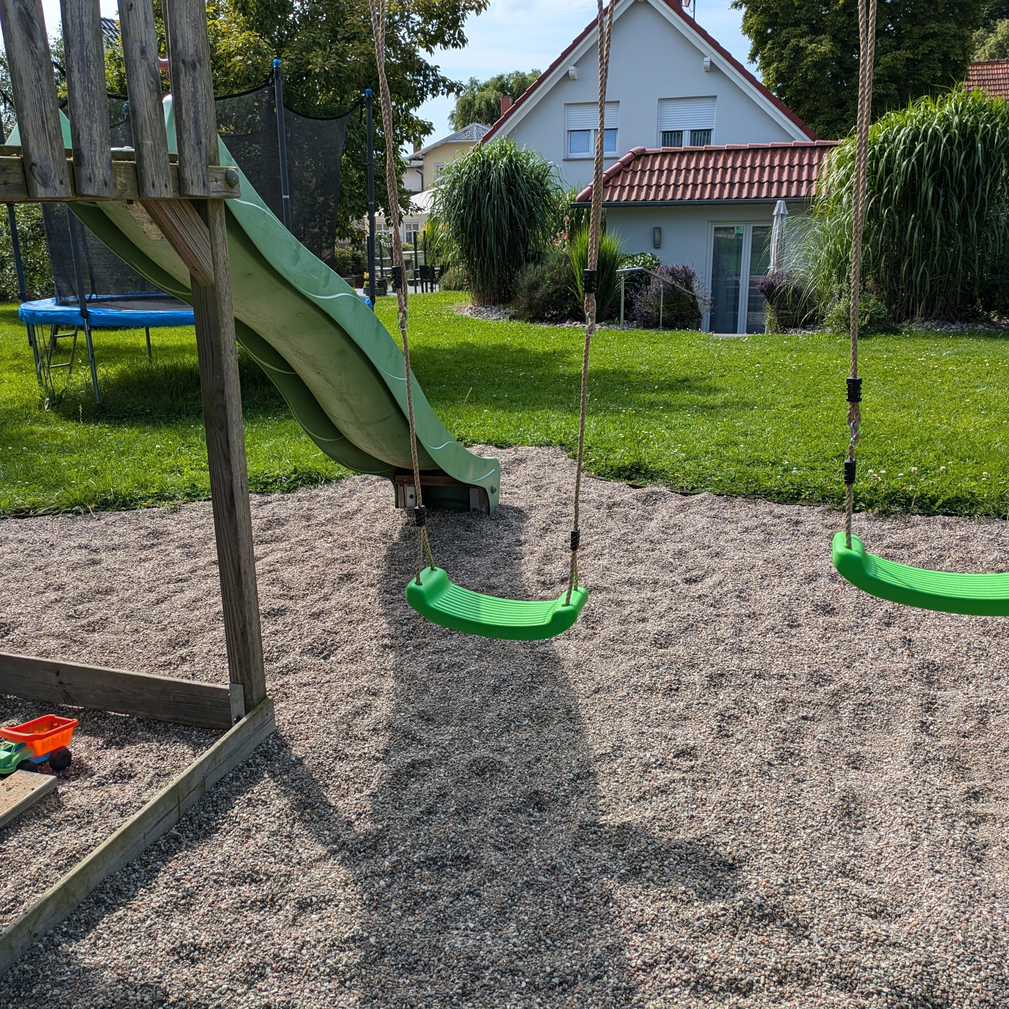 Das im Jahr 2013 erbaute altersgerechte Ferienhaus hat eine Größe von 53 m² und ist ausgestattet mit Fußbodenheizung, kontrollierter Be- und Entlüftungsanlage, es ist umweltbewusst durch Photovoltaik und Geothermie. Alle Fenster haben Außenjalousien. Die Einbauküche enthält einen Herd mit Backofen, einen Geschirrspüler und eine Mikrowelle, eine Kaffeemaschine sowie einen Wasserkocher. Im Ferienhaus erwartet Sie neben dem kombinierten Küchen-/Wohnbereich ein Schlafzimmer mit zwei Betten, die als Doppelbett oder auf Wunsch als zwei Einzelbetten genutzt werden können. Die Betten haben eine komfortable Höhe. Das zweite Schlafzimmer verfügt über ein Bett, welches bei Bedarf ausgezogen werden kann und als weitere Schlafgelegenheit dient (0,80 x 1,70m). Für Babys und Kleinkinder werden ein Kinderreisebett und ein Kinderhochstuhl zur Verfügung gestellt. Der helle und gemütliche Wohnbereich umfasst eine Couch mit Tisch, einen Fernseher, DVD-Player, Bücher und Spiele, weiterhin befindet sich hier der Esstisch mit vier Stühlen. Das Bad ist ausgestattet mit Dusche, Waschmaschine, Fön und Fenster. Ein Parkplatz am Haus, Bettwäsche und Handtücher sind inklusive. Genießen Sie die Morgensonne auf der Terrasse und lassen den Urlaubstag mit einem Grillabend ausklingen, die Kinder spielen auf dem Spielplatz und dem Trampolin.