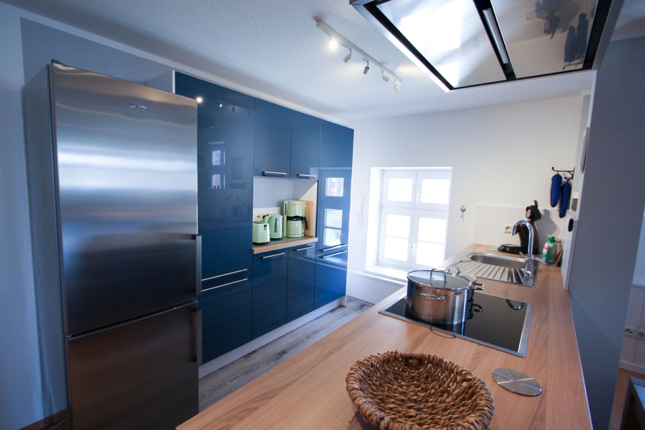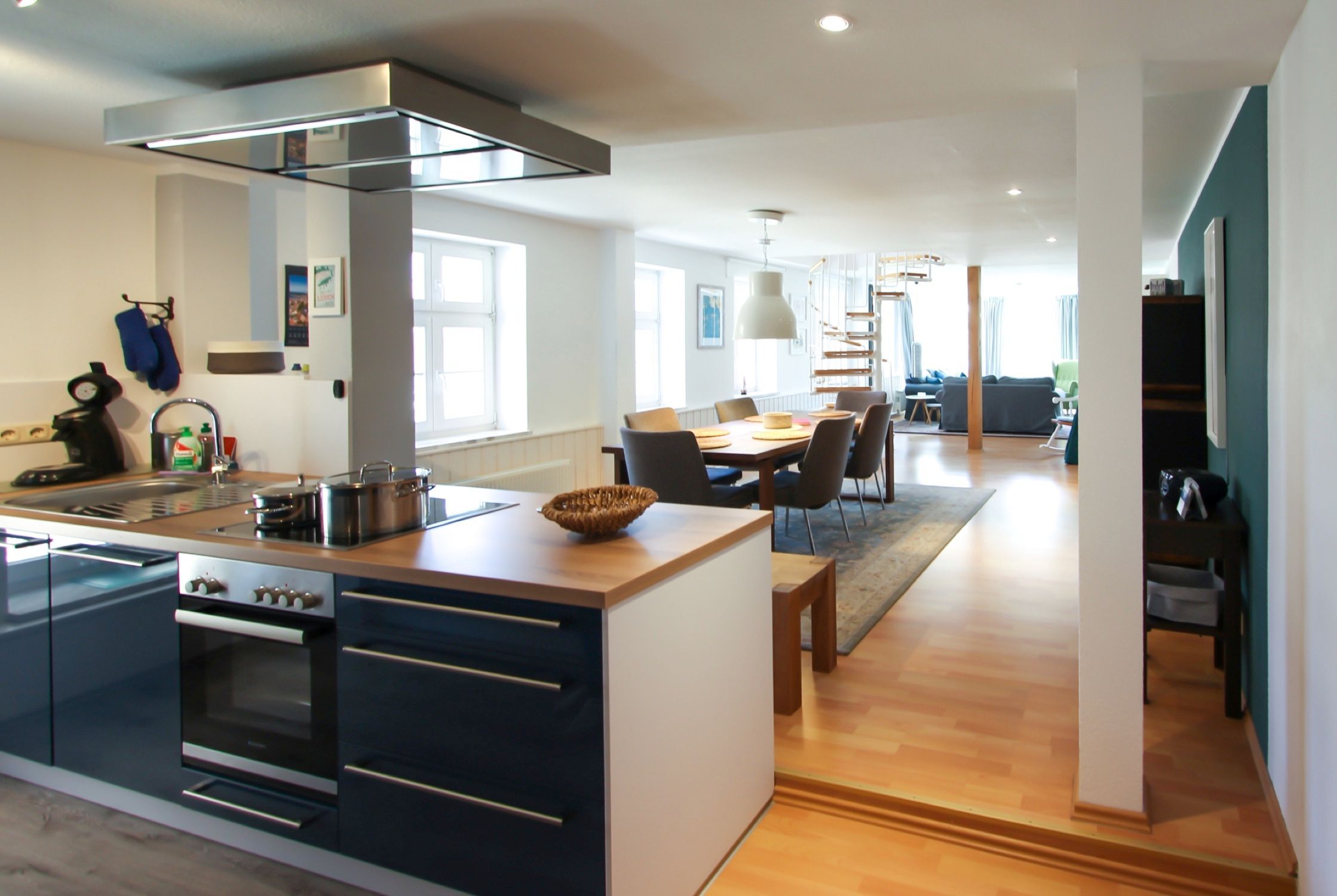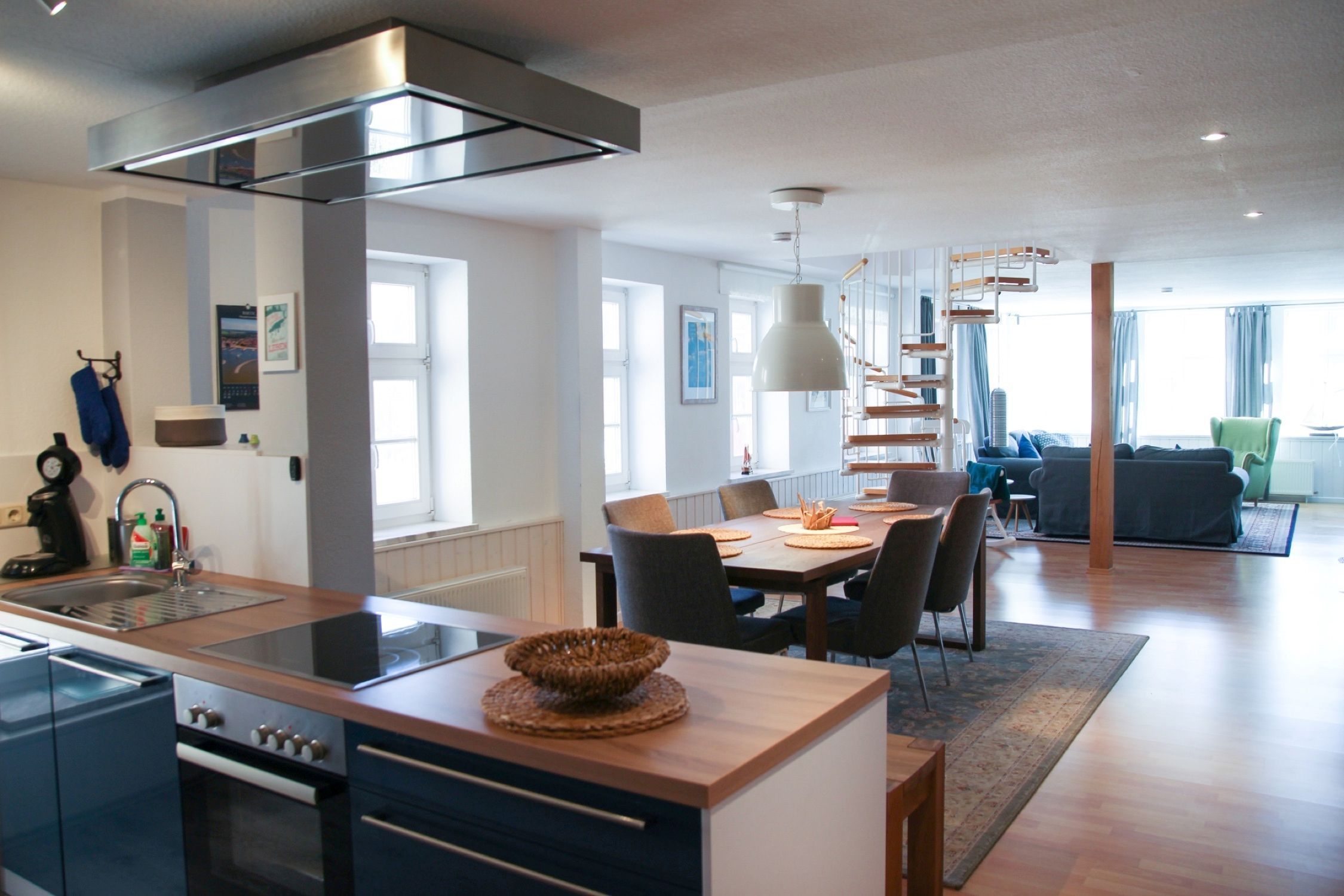 Die Ferienwohnung Boddensegler empfängt ihre Gäste auf einer großzügigen Wohnfläche von rund 125 m², die sich über zwei Etagen eines liebevoll restaurierten Stadthauses erstreckt. Im ersten Obergeschoss entfaltet sich ein weitläufiger Wohnbereich mit modernem Loft-Ambiente, der viel Raum für gemeinsame Stunden bietet. Die offen gestaltete und voll ausgestattete Küche geht fließend in den einladenden Essbereich über und schafft so das ideale Zentrum für gesellige Abende. Ein Badezimmer mit einer geräumigen Dusche sowie ein praktischer Hauswirtschaftsraum inklusive Waschmaschine ergänzen das Raumangebot auf dieser Ebene. Über eine Treppe gelangt man in das zweite Obergeschoss, welches die privaten Rückzugsorte beherbergt. Hier befinden sich zwei separate Schlafzimmer mit Doppelbett beziehungsweise zwei Einzelbetten sowie ein drittes, flexibles Schlafzimmer. Dieses ist als Durchgangszimmer gestaltet und bietet mit einer komfortablen Doppelbettcouch, einem zusätzlichen Fernseher und einem Schreibtisch vielseitige Nutzungsmöglichkeiten für Familien oder zur Entspannung. Ein zweites, kleineres Badezimmer mit Dusche und WC sorgt auf dieser Etage für zusätzlichen Komfort. Von der oberen Ebene aus ist zudem der private Balkon begehbar, der den Wohnraum unter freiem Himmel erweitert.