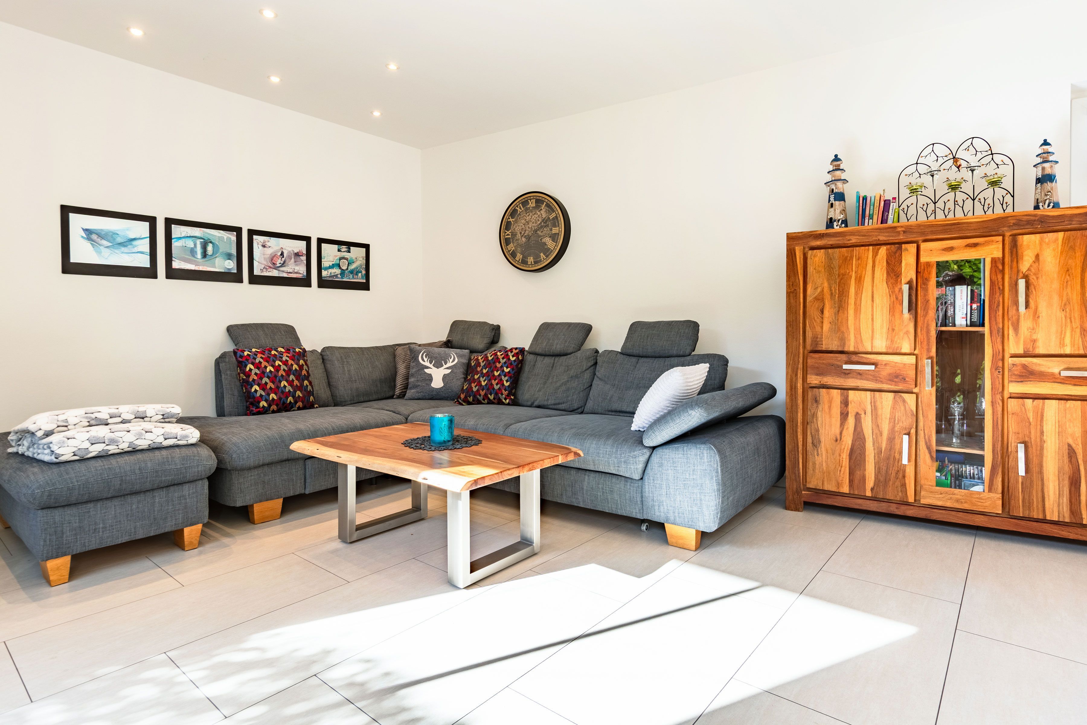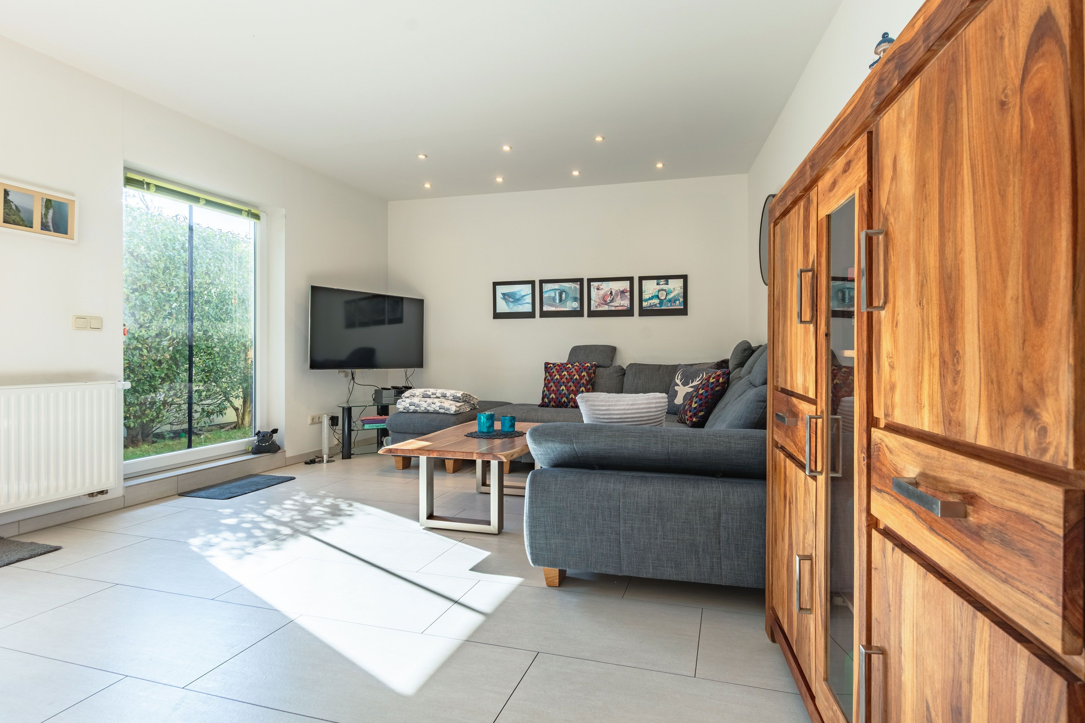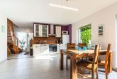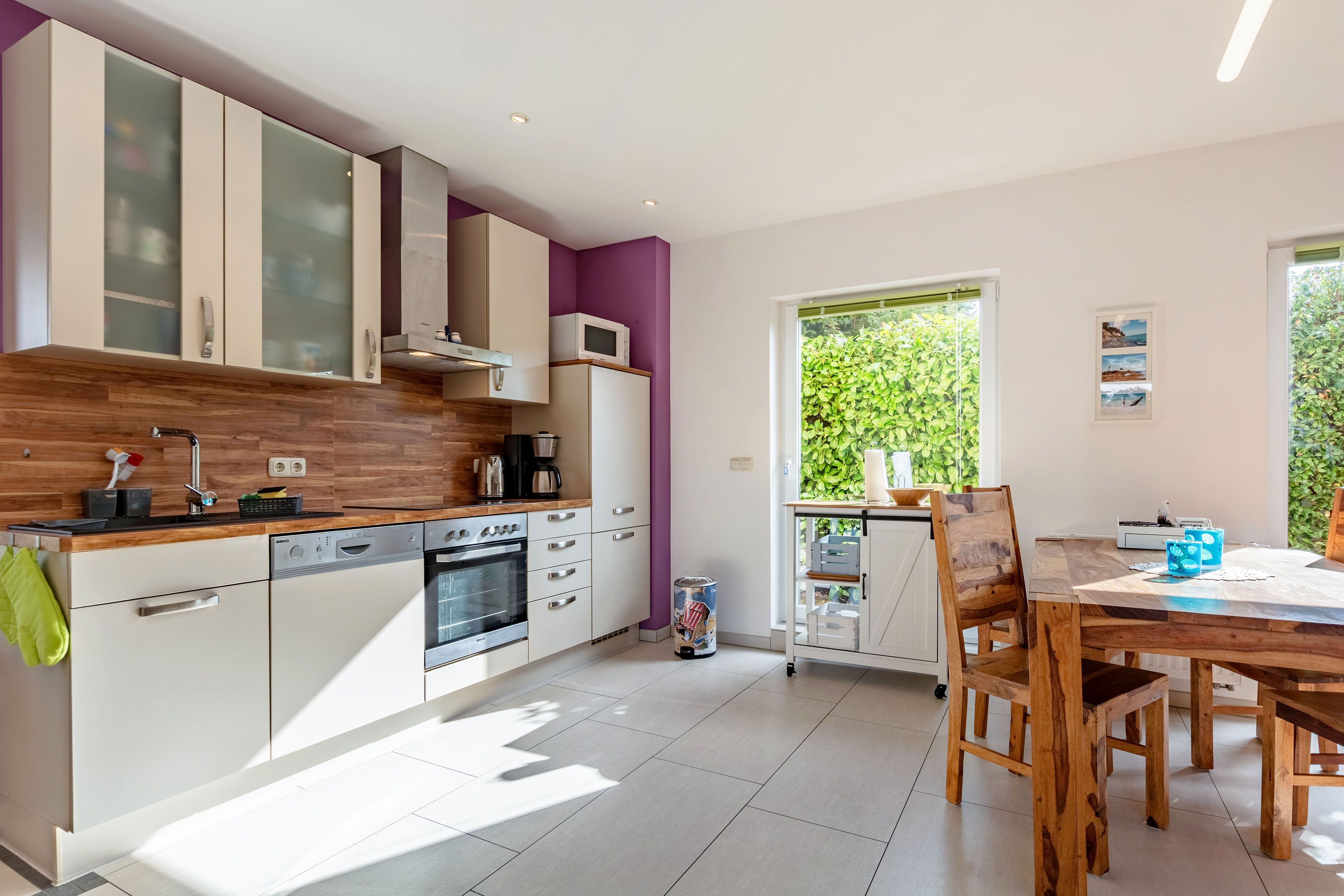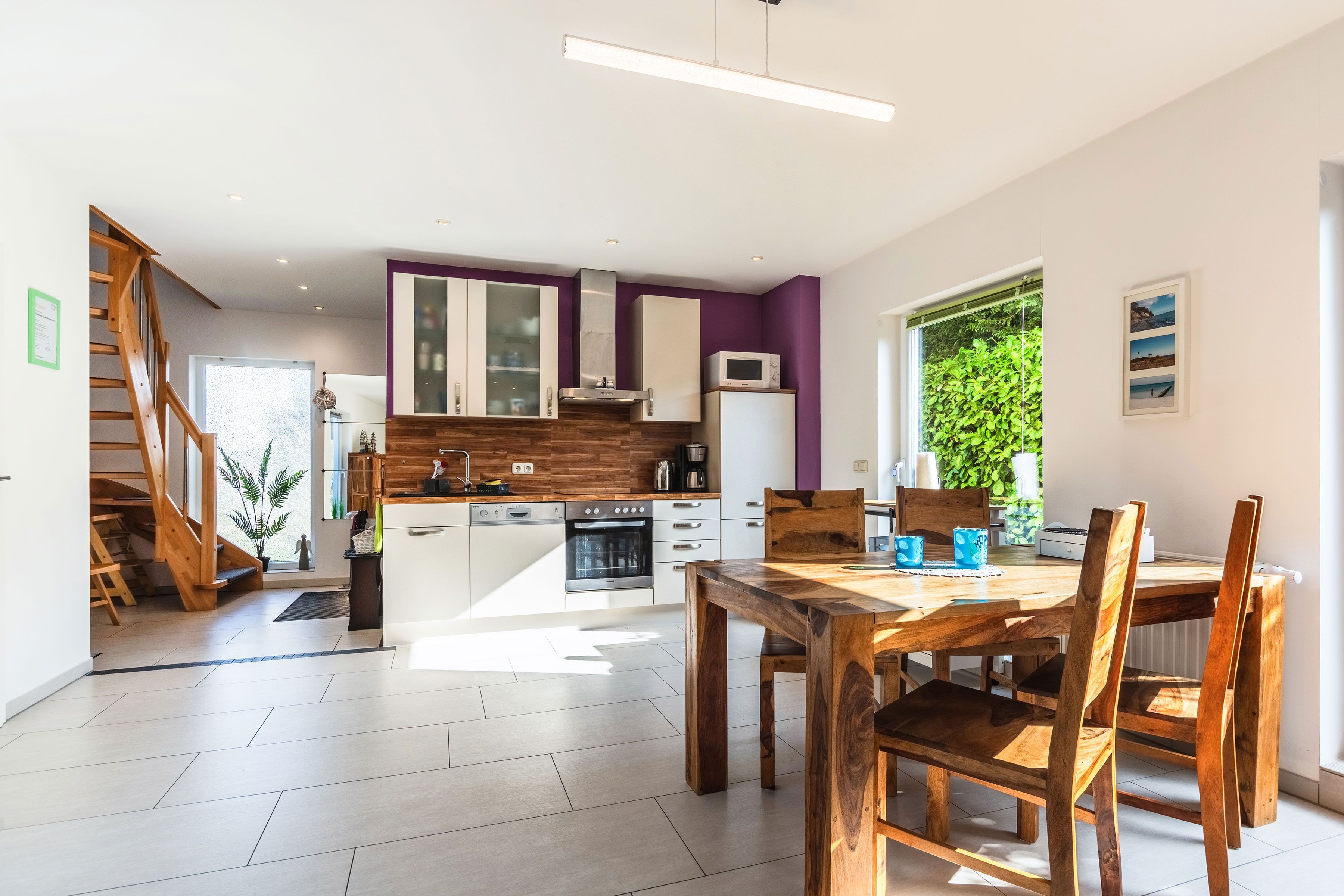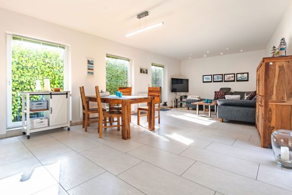 Das Ferienhaus empfängt Sie mit einem hellen, offenen Wohn- und Essbereich, der durch große, bodentiefe Terrassentüren lichtdurchflutet ist und eine freundliche, einladende Atmosphäre schafft. Die offene Gestaltung sorgt vom ersten Moment an für ein angenehmes Wohngefühl.