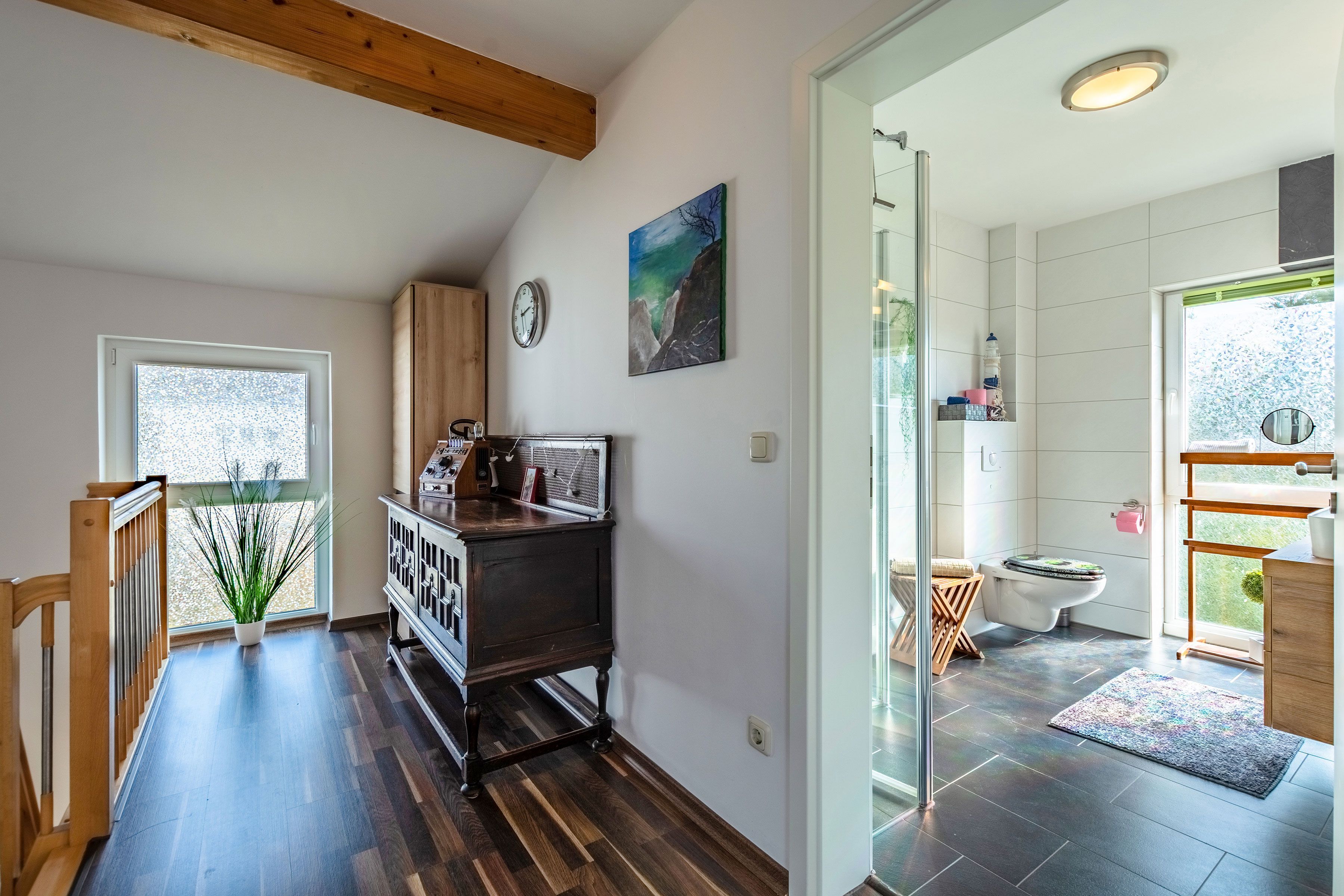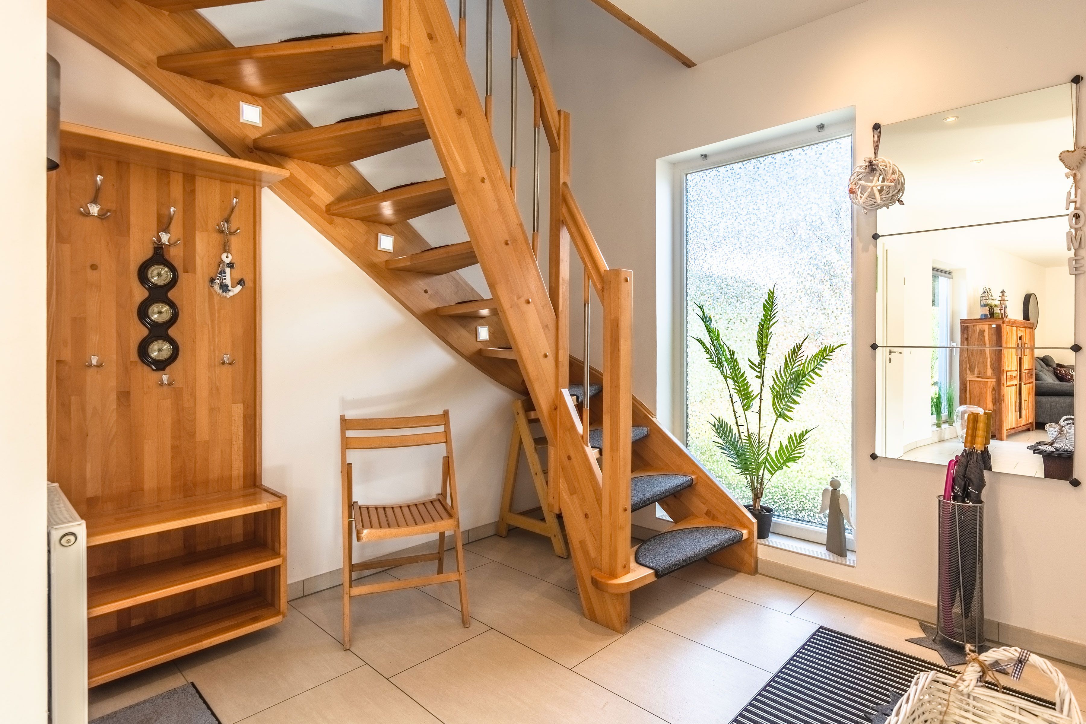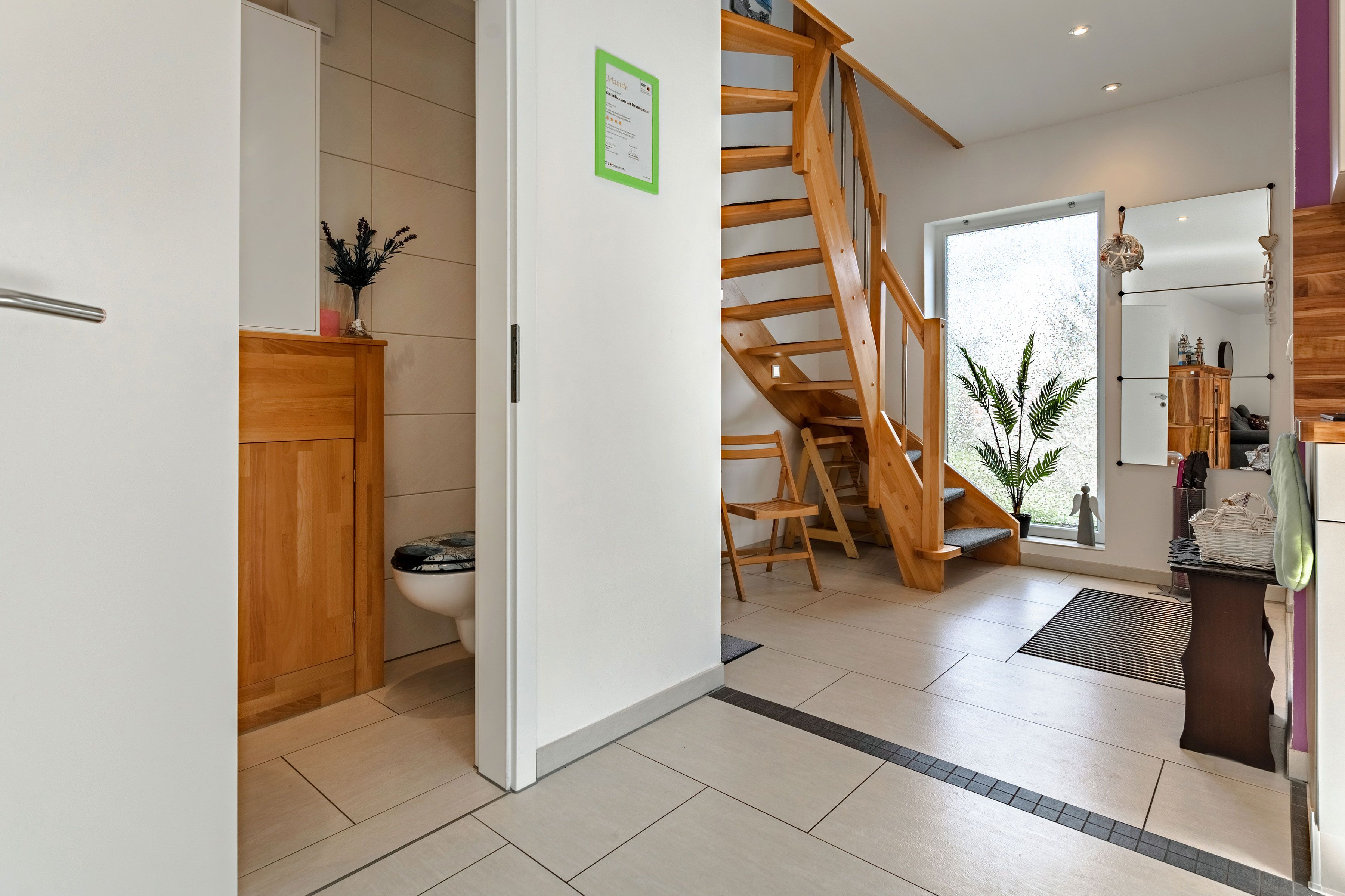 Der Wohnbereich bildet das Herz des Hauses und ist mit einer gemütlichen Sitzecke, TV sowie Unterhaltungsmöglichkeiten wie Radio, CD- und DVD-Player ausgestattet. Eine voll eingerichtete Küchenzeile fügt sich harmonisch in den Raum ein und bietet alles für den täglichen Bedarf. Ergänzt wird das Erdgeschoss durch einen Eingangsbereich mit Garderobe sowie ein separates Gäste-WC.