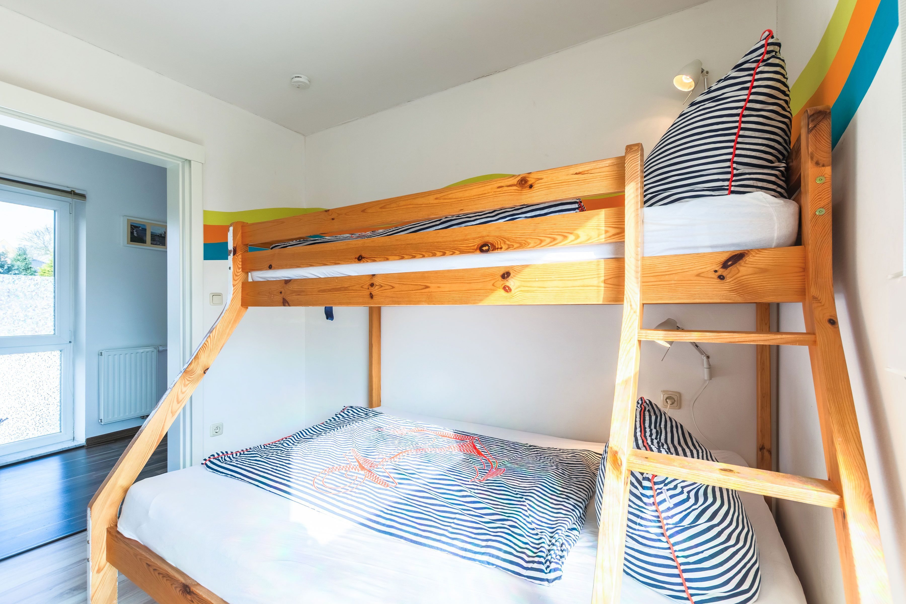 Im Obergeschoss erwarten Sie ein Schlafzimmer mit Balkon, ein Kinderzimmer mit Katamaranbett (Babyreisebett zustellbar) sowie ein Badezimmer mit Dusche und WC. Außenrollos in den Schlafräumen sowie teilweise vorhandene Mückenschutzgitter sorgen für zusätzlichen Komfort.