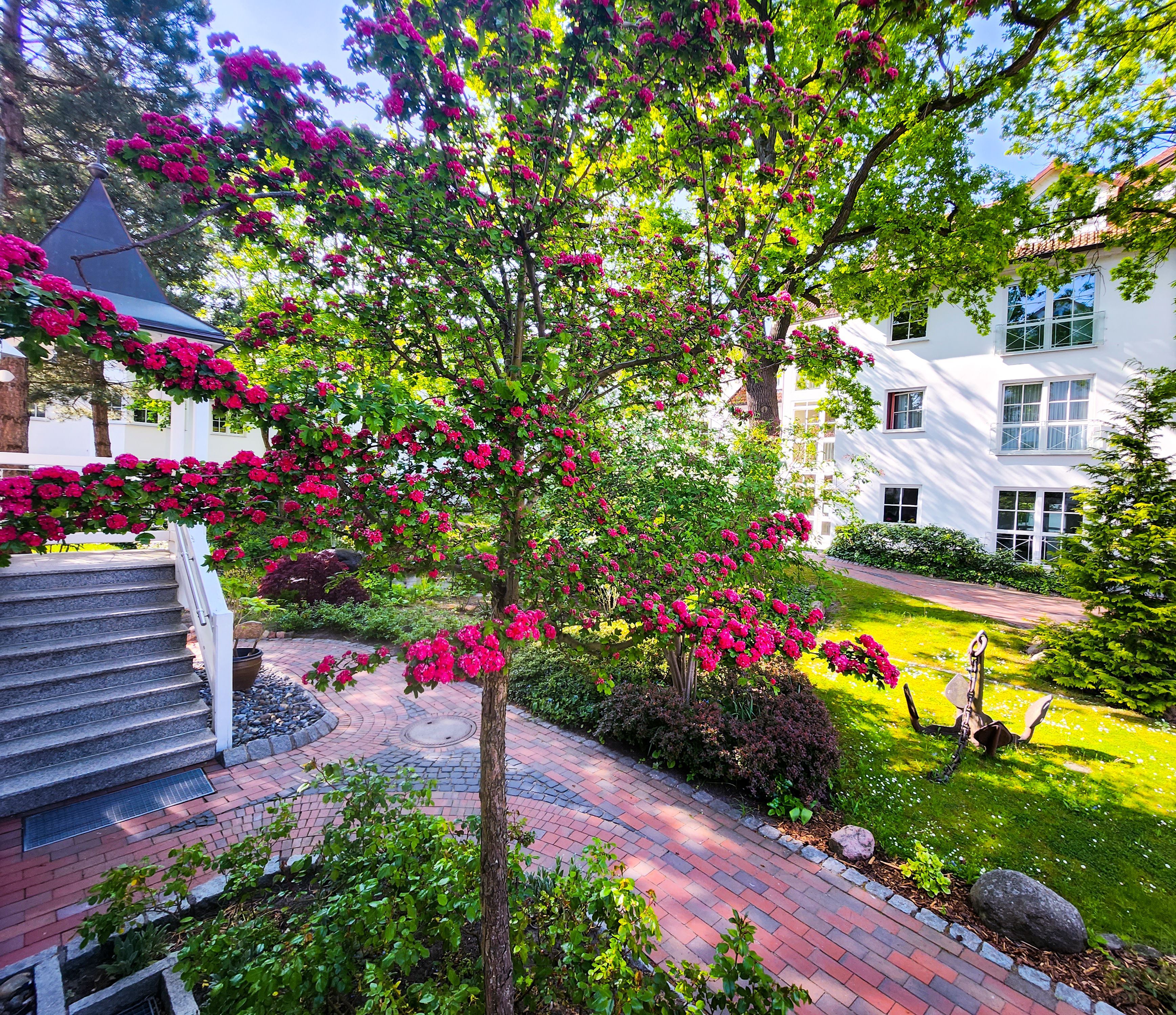 Die Ferienwohnungen liegen in einem kleinen Park mit altem Baumbestand und einem Gartenteich mit Springbrunnen. Bänke und überdachte Freisitze in den gepflegten Gartenanlagen laden zum Verweilen ein.