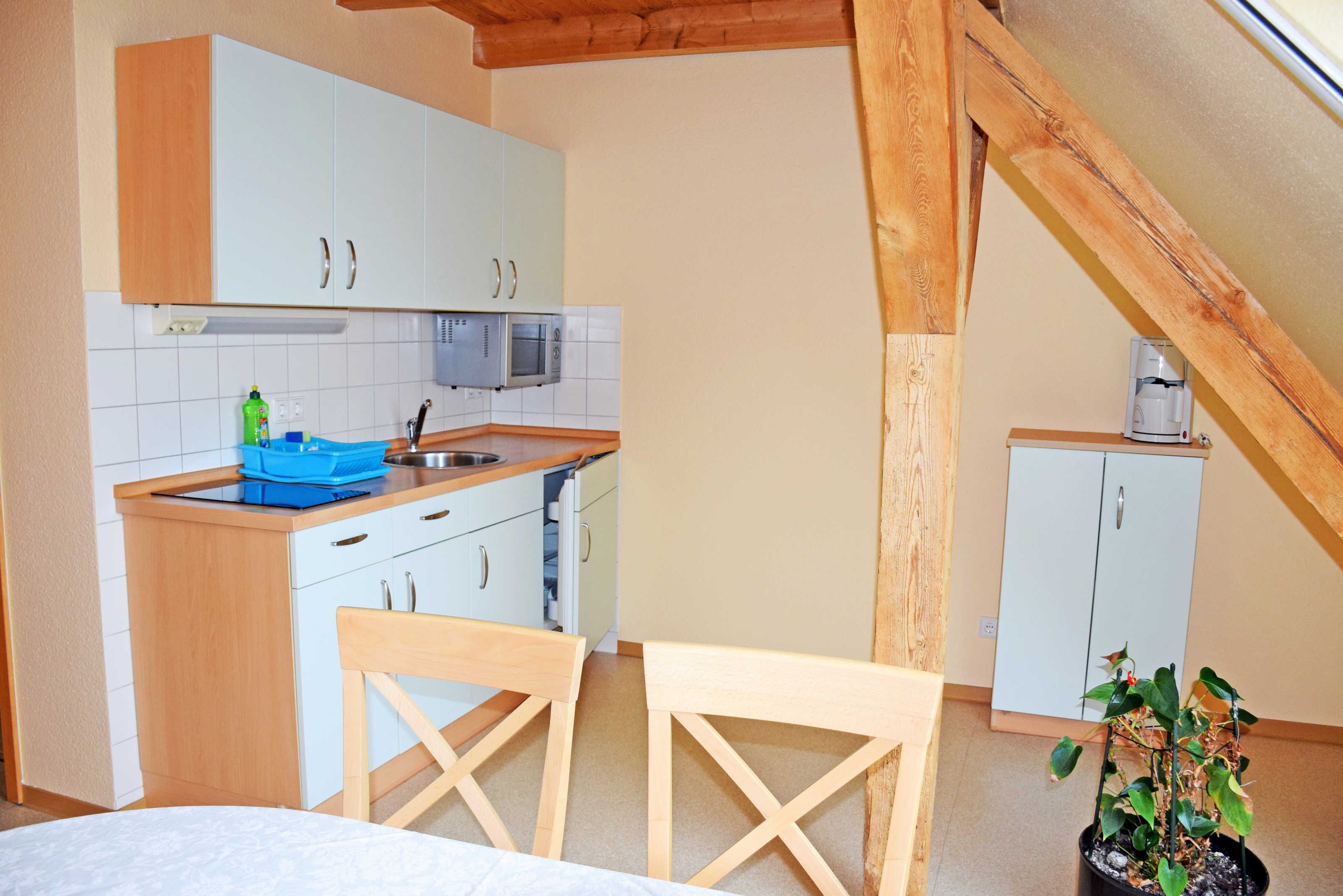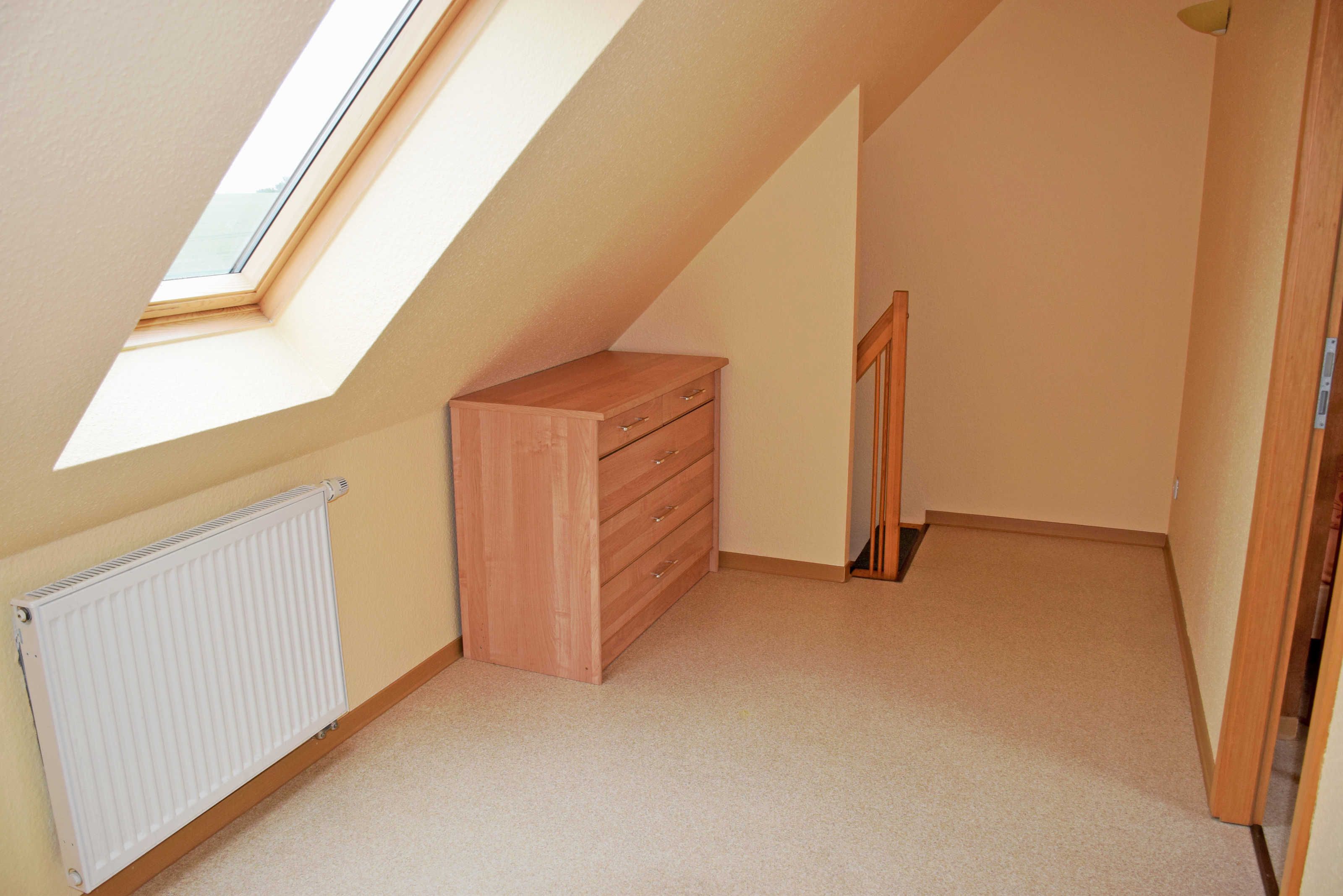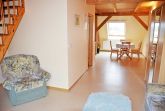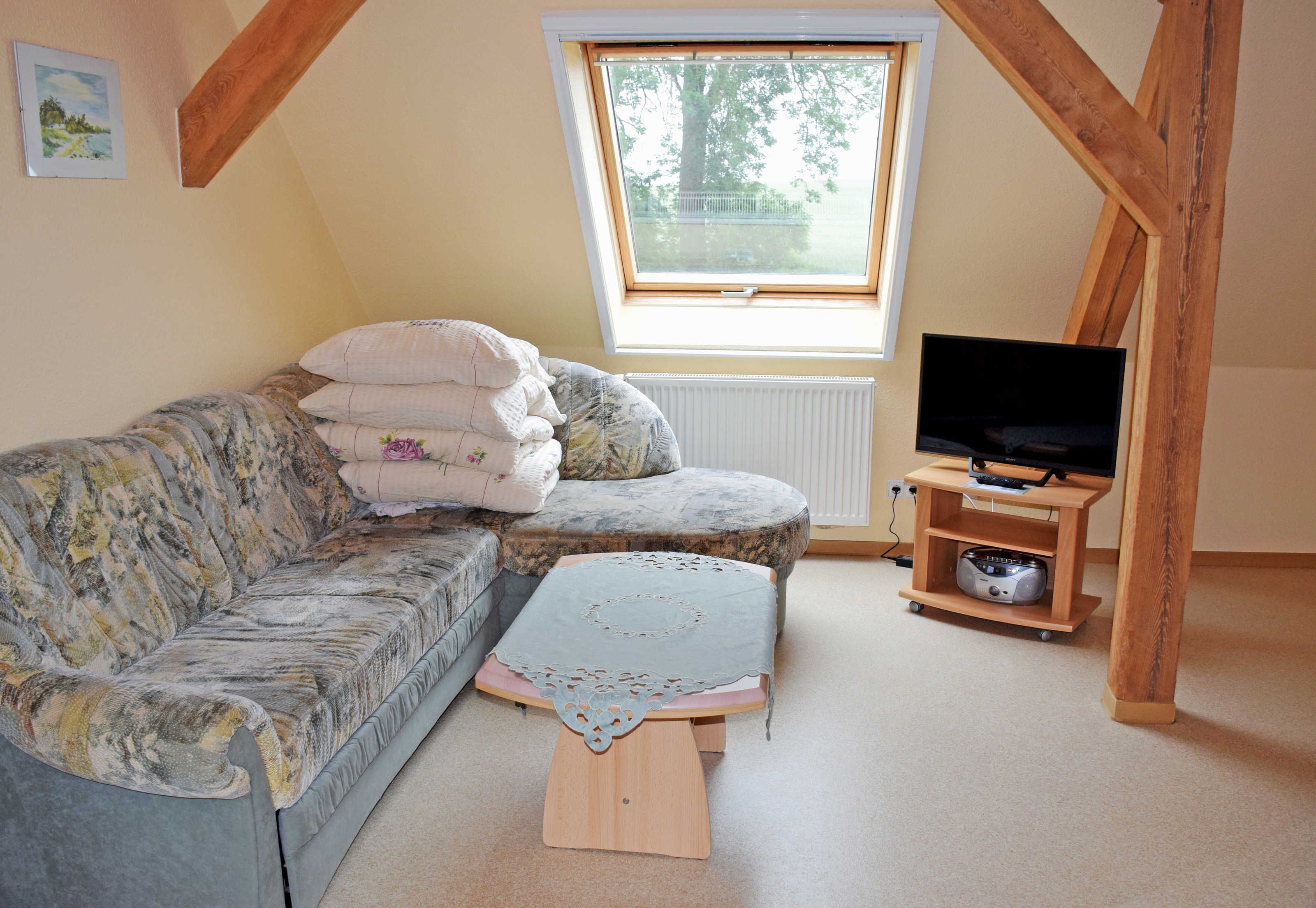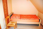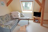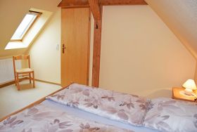 Im Wohnraum befinden sich eine Sitzcouch mit Tisch und ein TV-Gerät. Die Couch kann bei Bedarf für einen Gast aufgebettet werden. Im Wohnzimmer steht auch ein Esstisch mit Sitzgelegenheiten. Die moderne Küchenzeile ist mit einem Herd, Mikrowelle, Wasserkocher, Kaffeemaschine, Toaster und Kühlschrank komplett ausgestattet. Im ausgebauten Spitzboden befinden sich ein Schlafzimmer mit einem bequemen Doppelbett, Nachttischen und Leselampen sowie einen Kleiderschrank und im zweiten Schlafzimmer zwei Einzelbetten. Ein kleines Kinderreisebett und ein Hochstuhl können auf Wunsch kostenlos bereit gestellt werden.