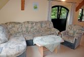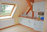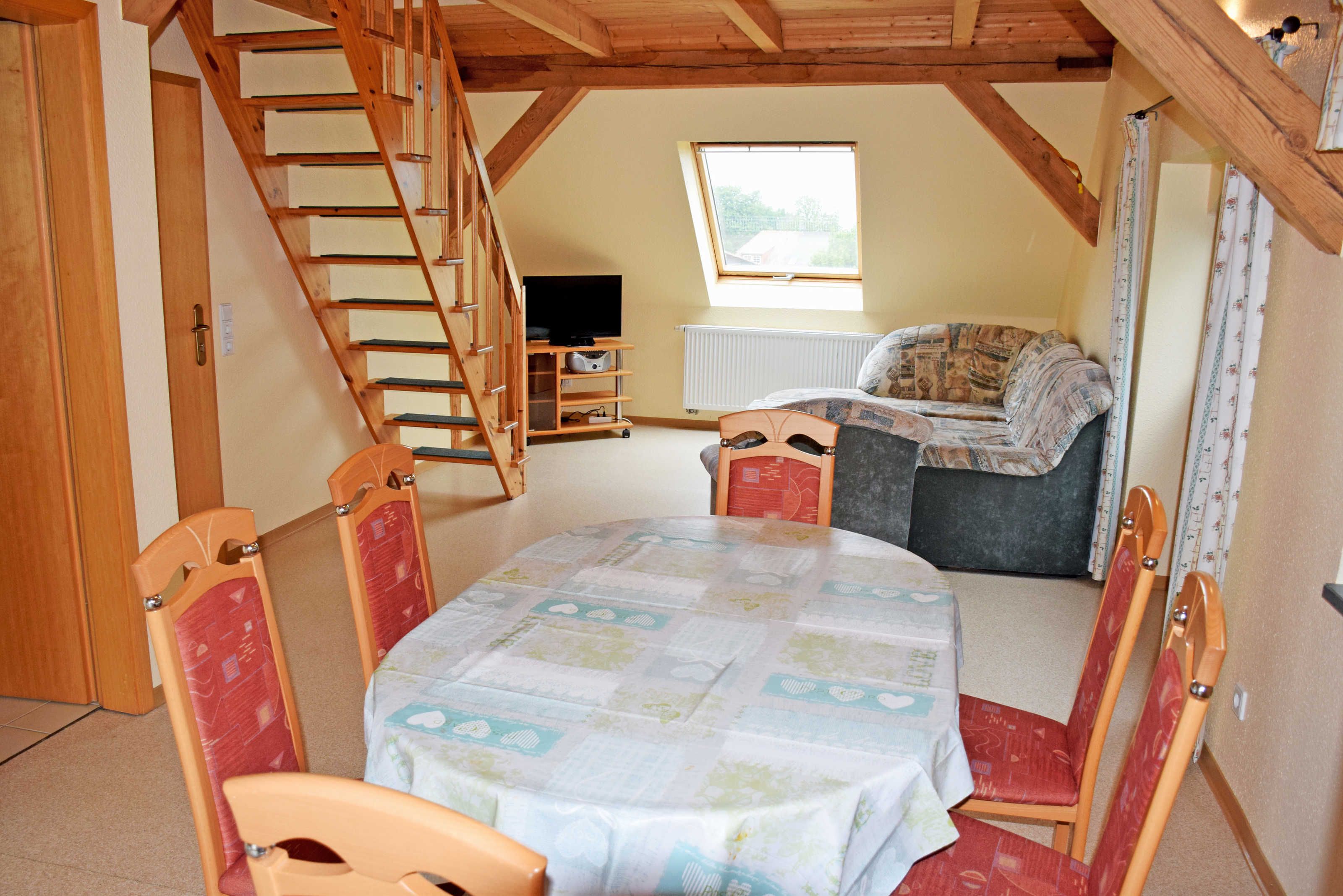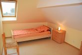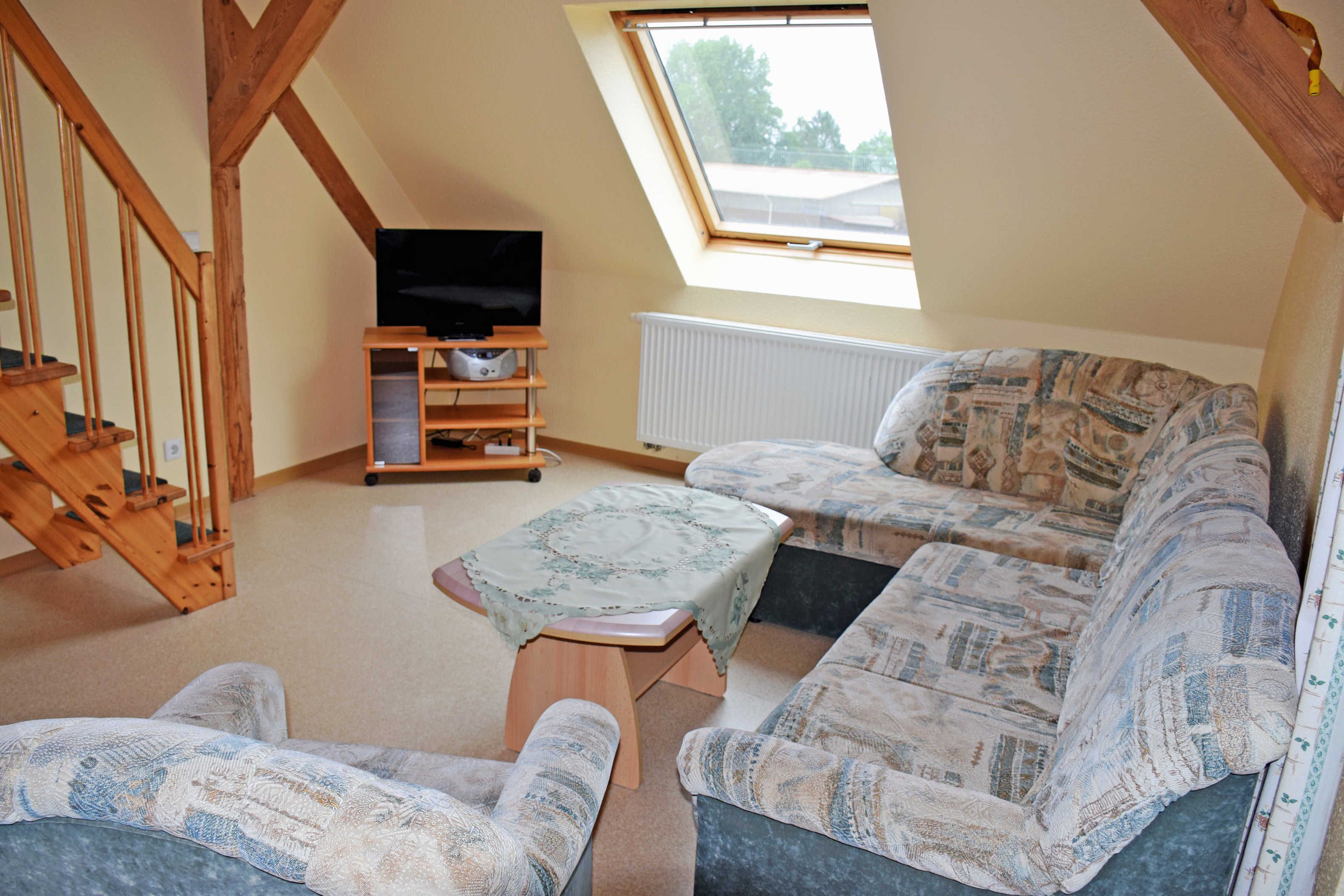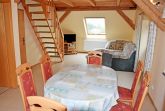 Im Wohnraum befinden sich eine Sitzcouch mit Tisch und ein TV-Gerät. Die Couch kann bei Bedarf für einen Gast aufgebettet werden. Im Wohnzimmer steht auch ein Esstisch mit Sitzgelegenheiten. Die moderne Küchenzeile ist mit einem Herd, Mikrowelle, Wasserkocher, Kaffeemaschine, Toaster und Kühlschrank komplett ausgestattet. Im ausgebauten Spitzboden befinden sich ein Schlafzimmer mit einem bequemen Doppelbett, Nachttischen und Leselampen sowie einen Kleiderschrank und im zweiten Schlafzimmer zwei Einzelbetten. Ein kleines Kinderreisebett und ein Hochstuhl können auf Wunsch kostenlos bereit gestellt werden.