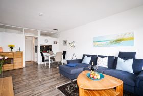 Meerblick-Apartment. Das gemütlich und modern eingerichtete und gepflegte Apartment kann mit dem Fahrstuhl bequem erreicht werden und bietet 4 Feriengästen Platz. Der helle Wohnraum ist mit einer bequemen Polsterlandschaft sowie einem ansprechenden Essbereich und hochwertigen Echtholzmöbeln eingerichtet. In der Einbauküche sind alle Geräte und Kochutensilien enthalten, um auch mal eigene Gerichte zuzubereiten. Der Kühlschrank beinhaltet ein kleines Gefrierfach. Das Elternschlafzimmer ist mit einem bequemen Boxspringbett (1,80 x 2,00) eingerichtet, Ein Etagenbett (je 0,90 x 1,90) befindet sich im Kinderschlafzimmer. Das geräumige Bad verfügt über eine Dusche. Ein großer Flachbildfernseher im Wohnzimmer zählt natürlich ebenso zur Einrichtung des Appartments. Der ca. 14 qm große Balkon verwöhnt mit einer Aussicht ins Grüne sowie einem Meerblick. Hunde sind in der Ferienwohnung stets gern gesehene Gäste (gegen Gebühr). Ein Schwimmbad liegt unmittelbar vor der Haustür und kann gegen ein geringes Entgelt genutzt werden. Wer jedoch ein Bad in der klaren Ostsee bevorzugt, findet den Strand in ca. 500 Metern Entfernung vor. LAGE Das Ferienappartment Nr. C-5/7 liegt im Panoramic Ferienpark in Sierksdorf. Neben dem nahegelegenen feinsandigen Ostseestrand bietet die Anlage viel Wohnkomfort und Annehmlichkeiten für Alleinreisende wie auch für Familien. Um die benötigten Utensilien für ein morgendliches Frühstück auf der Terrasse zu besorgen, genügt ein kurzer Spaziergang zum Kiosk des nahegelegenen Ferienparks. Weitere Einkaufsmöglichkeiten und Supermärkte liegen etwa 3 Kilometer entfernt. Für einen abwechslungsreichen Urlaub an der Ostsee sorgen die zahlreichen Attraktionen in der Umgebung. Ein Sportflugplatz mit Rundflugangebot, Schwimmbäder, Restaurants mit einem vielfältigen Angebot an fangfrischem Fisch sind nur einige Möglichkeiten, den Ostseeurlaub erlebnisreich zu gestalten. Nahegelegene Sport- und Freizeitmöglichkeiten bereichern die Ferientage auf vielfältige Weise. Ob Bowling, Tennis, Wandern, Segeln oder Rundflüge über die Lübecker-Bucht, der erlebnisreichen Gestaltung des Ostseeurlaubs sind kaum Grenzen gesetzt. Zu den größten Attraktionen gehört der Hansapark, ein familienorientierter Freizeitpark, der weit über die Grenzen der Region bekannt ist und nur wenige Gehminuten entfernt liegt. Zahlreiche Restaurants für den Hunger zwischendurch wie auch mit einem Angebot an regionalen Gerichten befinden sich an der nahegelegenen Strandpromenade & in der näheren Umgebung. Sierksdorf ist auch ein idealer Startpunkt um die Lübecker Bucht zu entdecken. So lassen sich beispielsweise viele Badeorte bequem von Sierksdorf aus erreichen.
