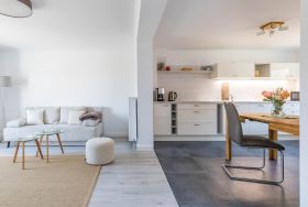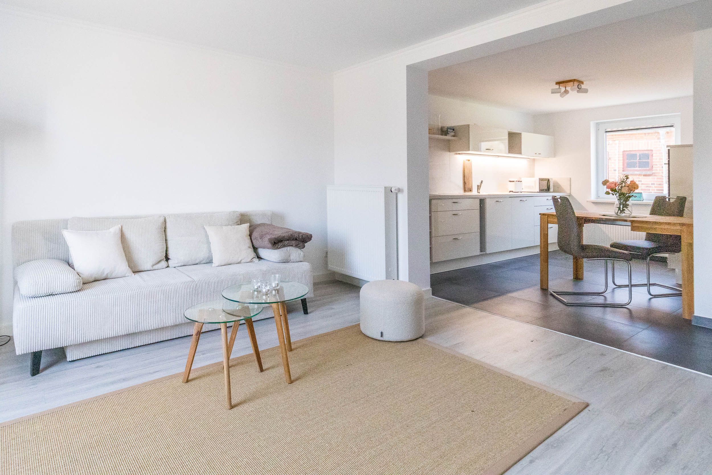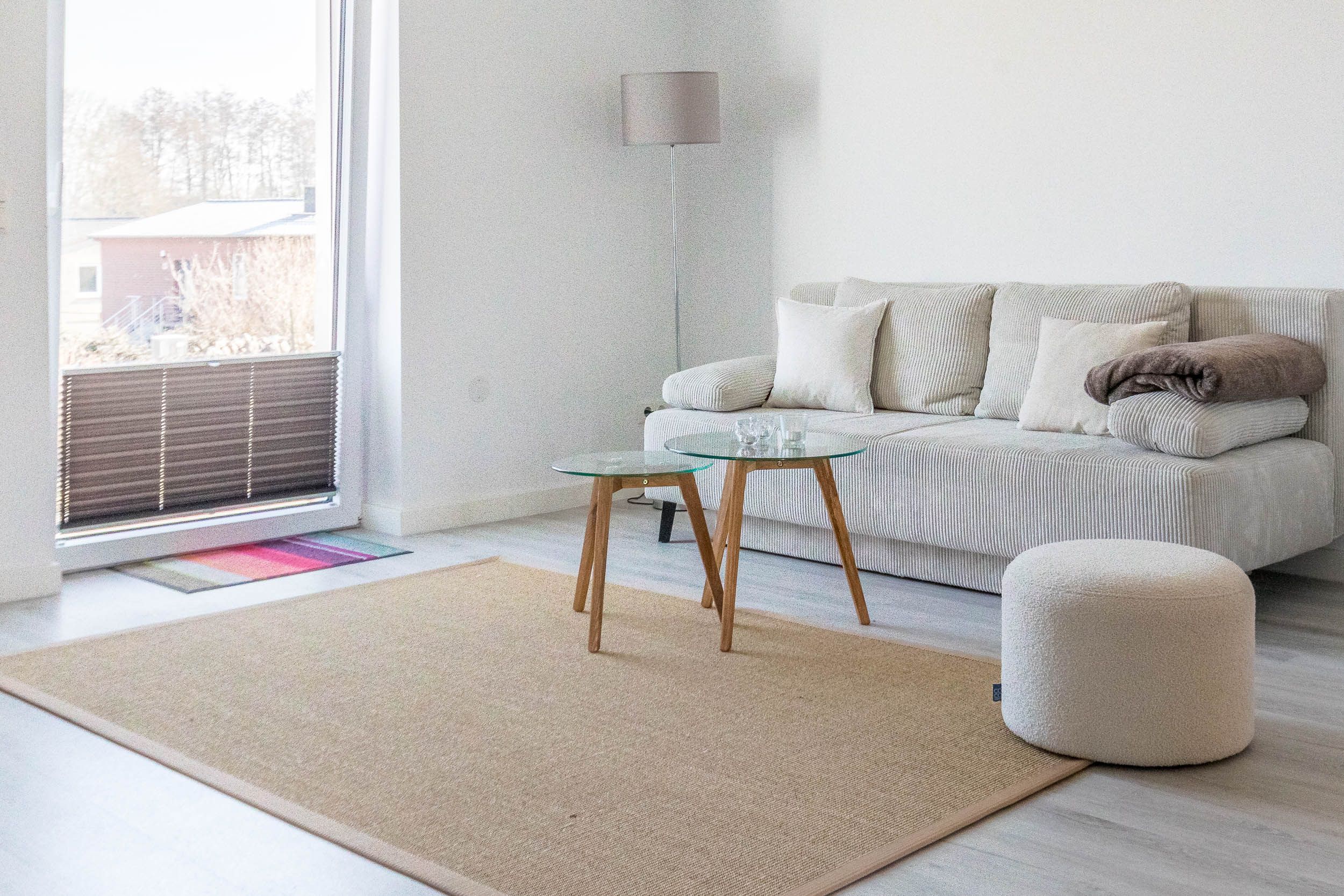 Der helle Wohnbereich lädt mit einer komfortablen Sitzgelegenheit zum Entspannen und Verweilen ein und bietet viel Raum für gemeinsame Stunden. Die gemütliche Couch lässt sich im Handumdrehen ausklappen und schafft zusätzlichen Schlafplatz für zwei Personen. An der integrierten Essecke können Sie gemeinsam speisen und den Tag in angenehmer Atmosphäre ausklingen lassen.