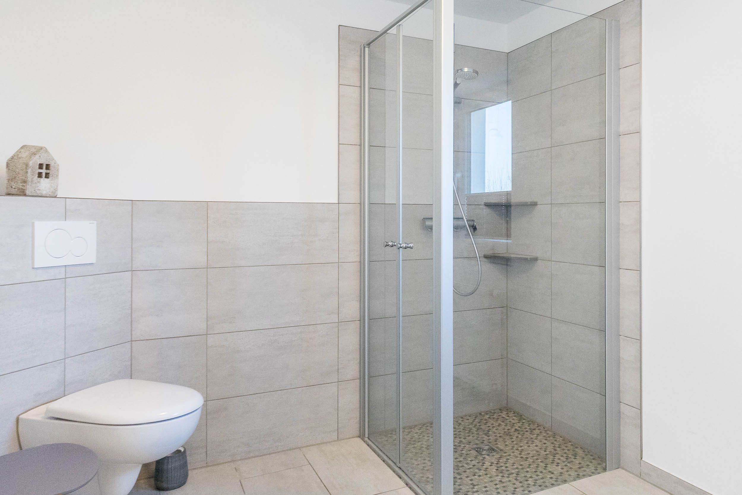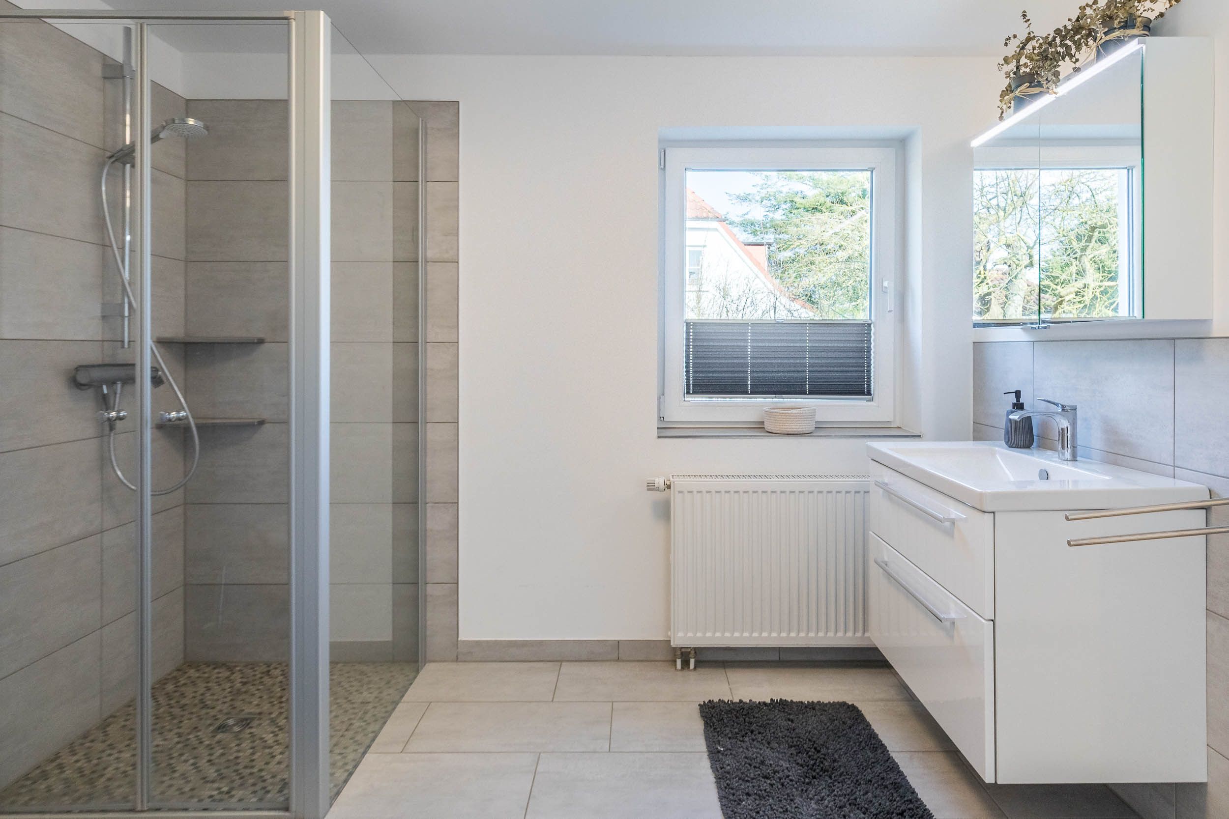Das funktional eingerichtete Badezimmer bietet Ihnen alles für einen entspannten Start in den Tag.