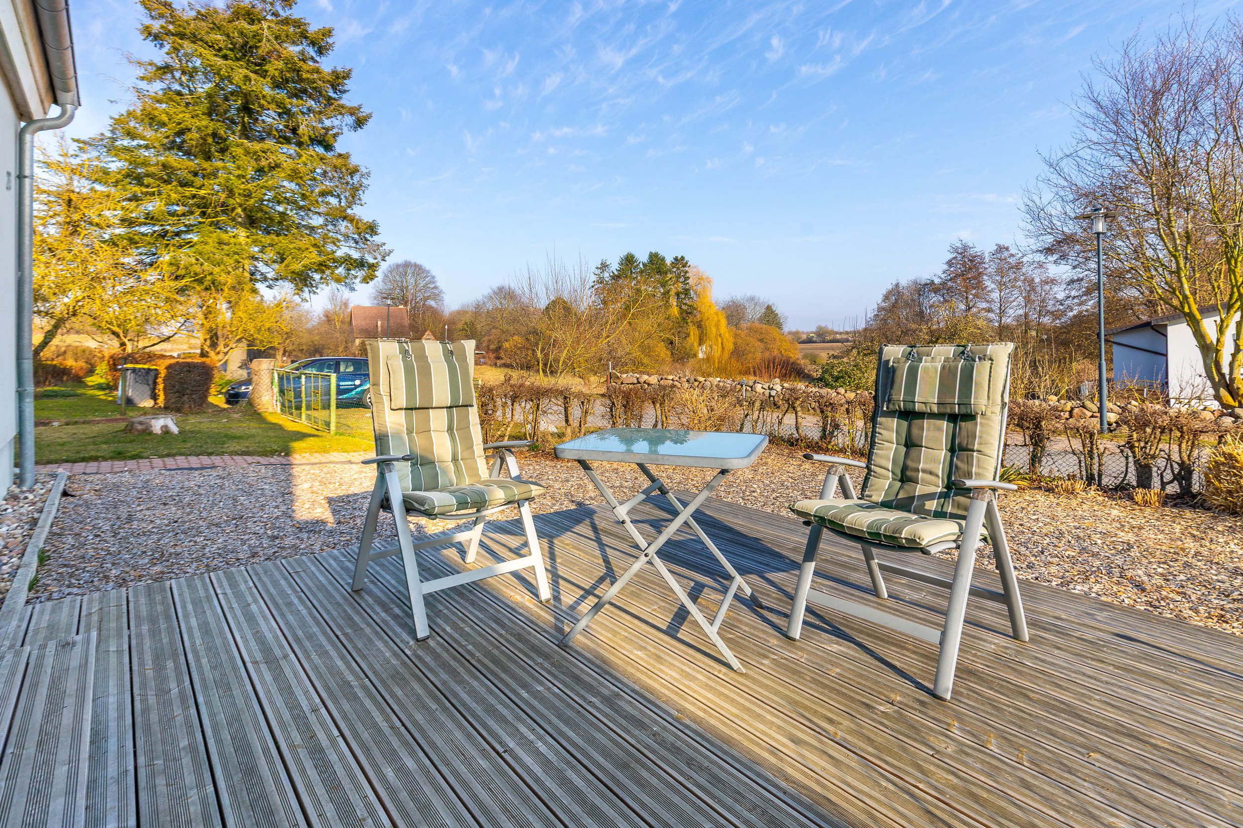 Ein besonderes Highlight ist die eigene möblierte Terrasse, auf der Sie die frische Luft genießen und entspannte Stunden im Freien verbringen können. Zusätzlich steht Ihnen ein abschließbares Abstellhäuschen zur Verfügung – perfekt für Fahrräder oder Strandutensilien.