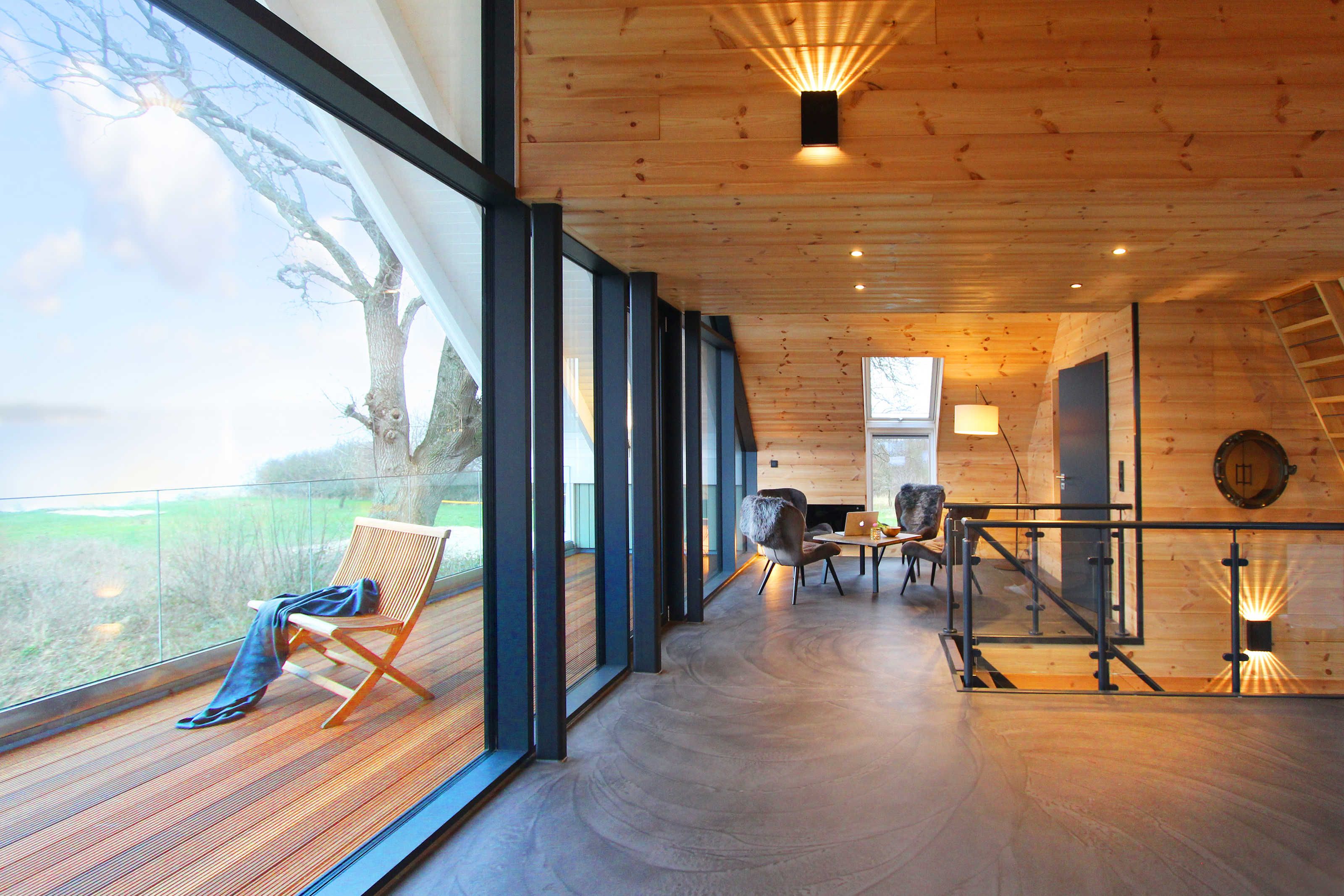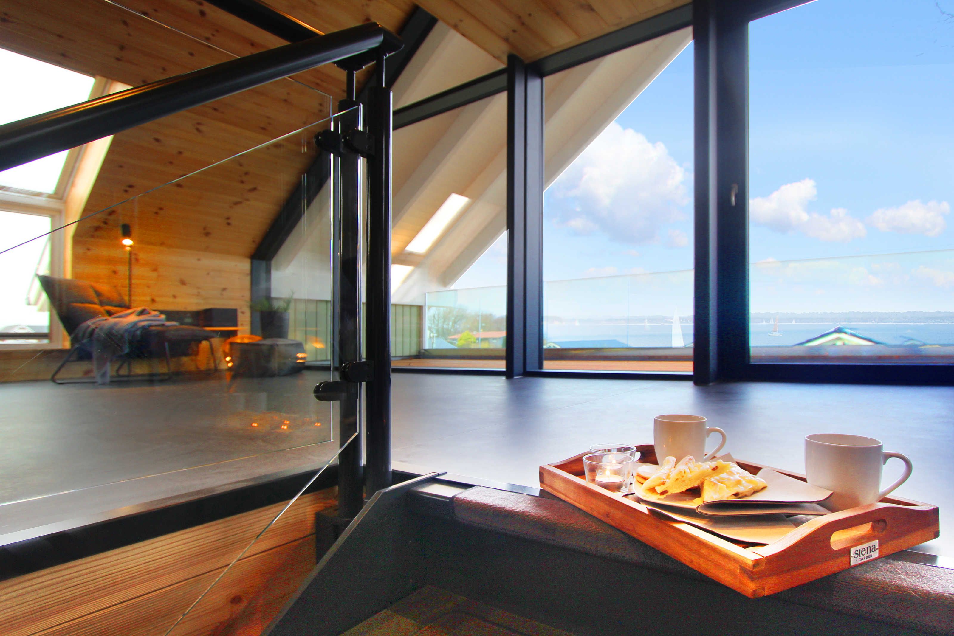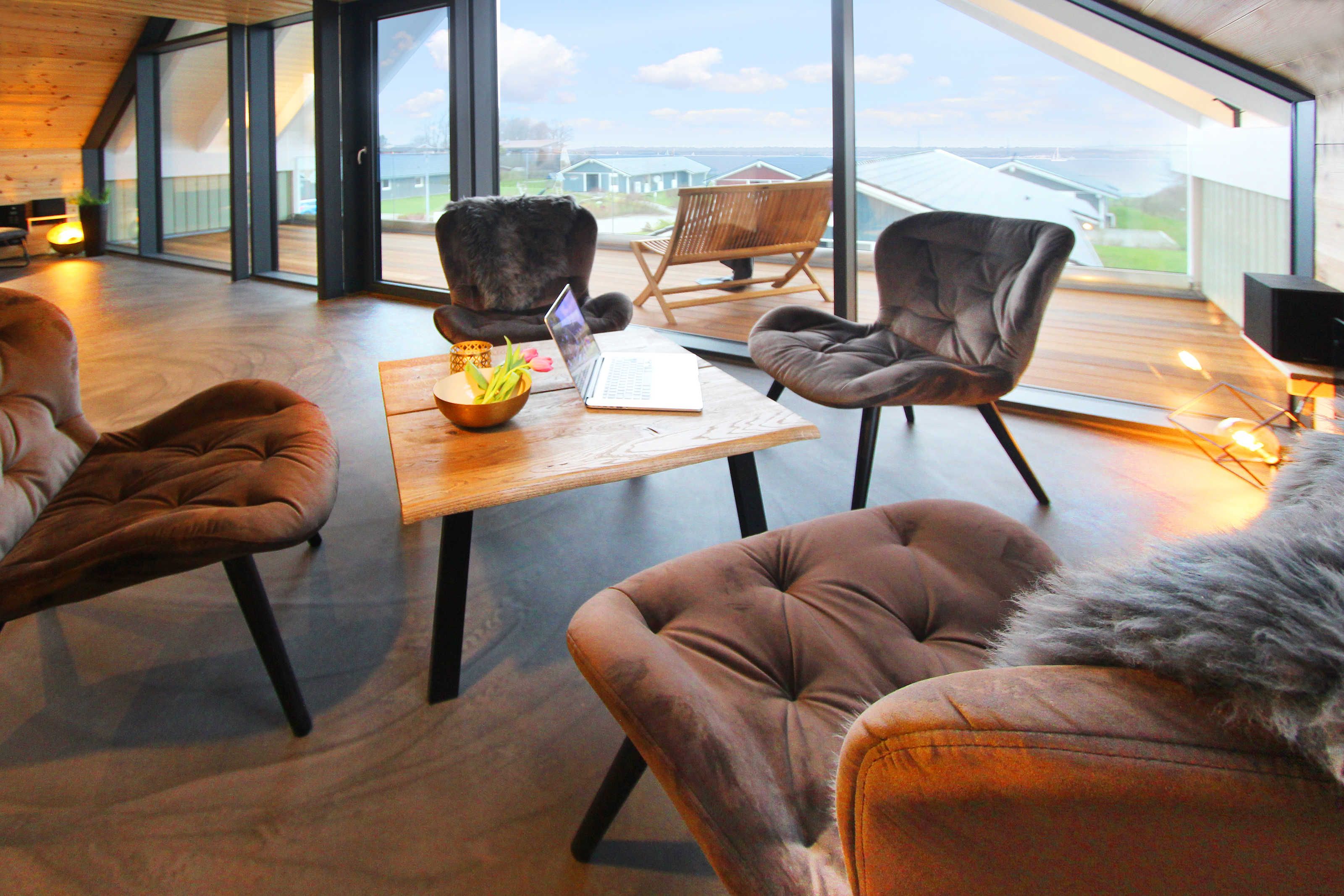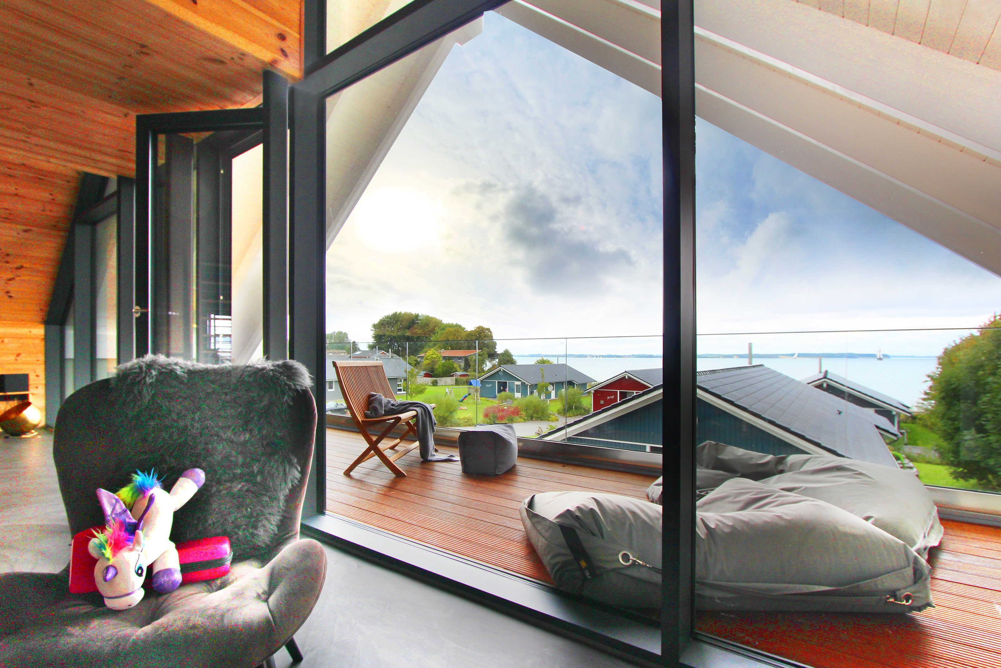 In der unteren Etage ist ein großer Essbereich inkl. großer Südterrasse und in der oberen Etage ein großer Wohnbereich mit großem Balkon nach Dänemark.