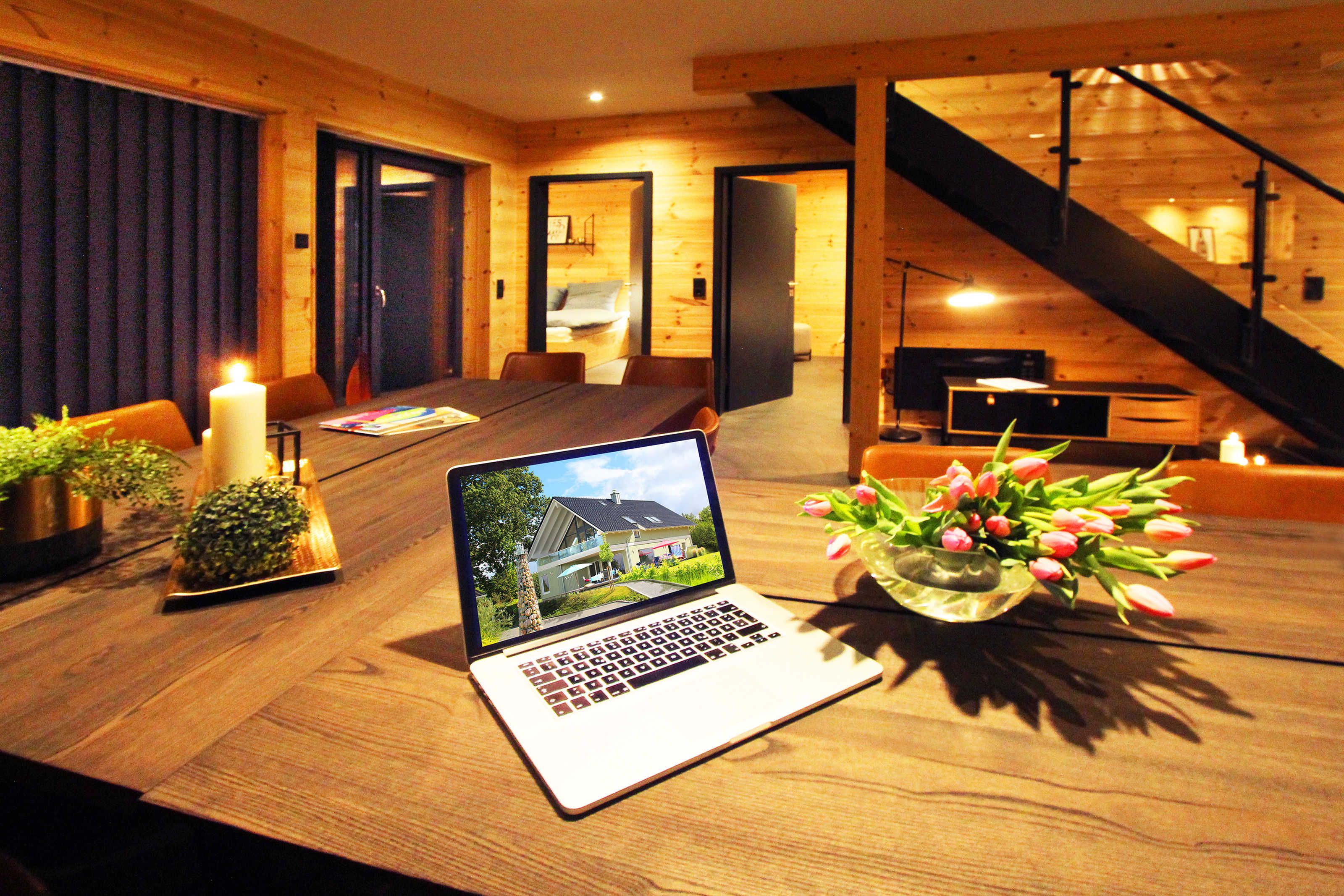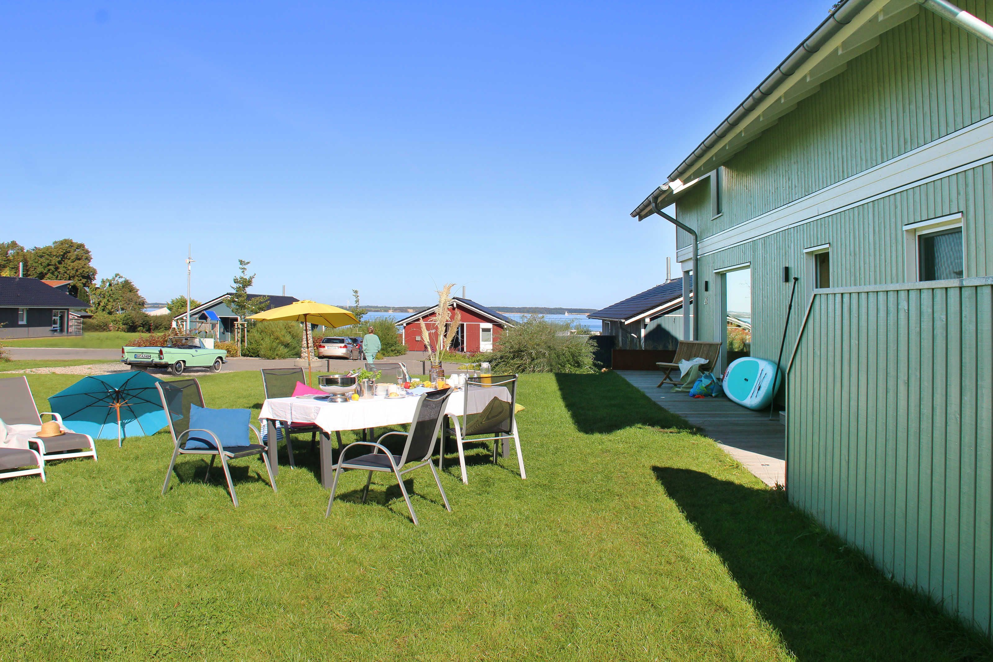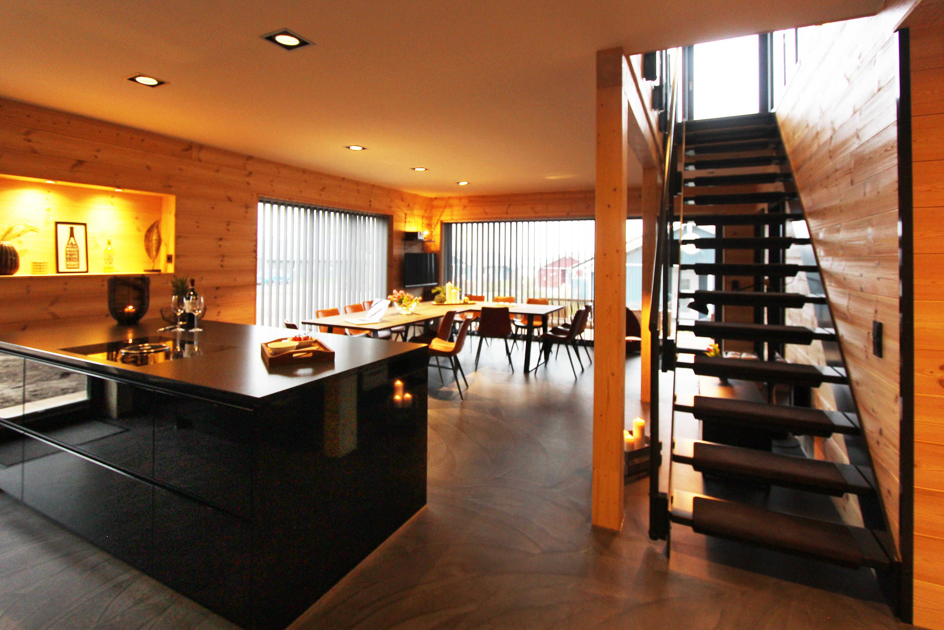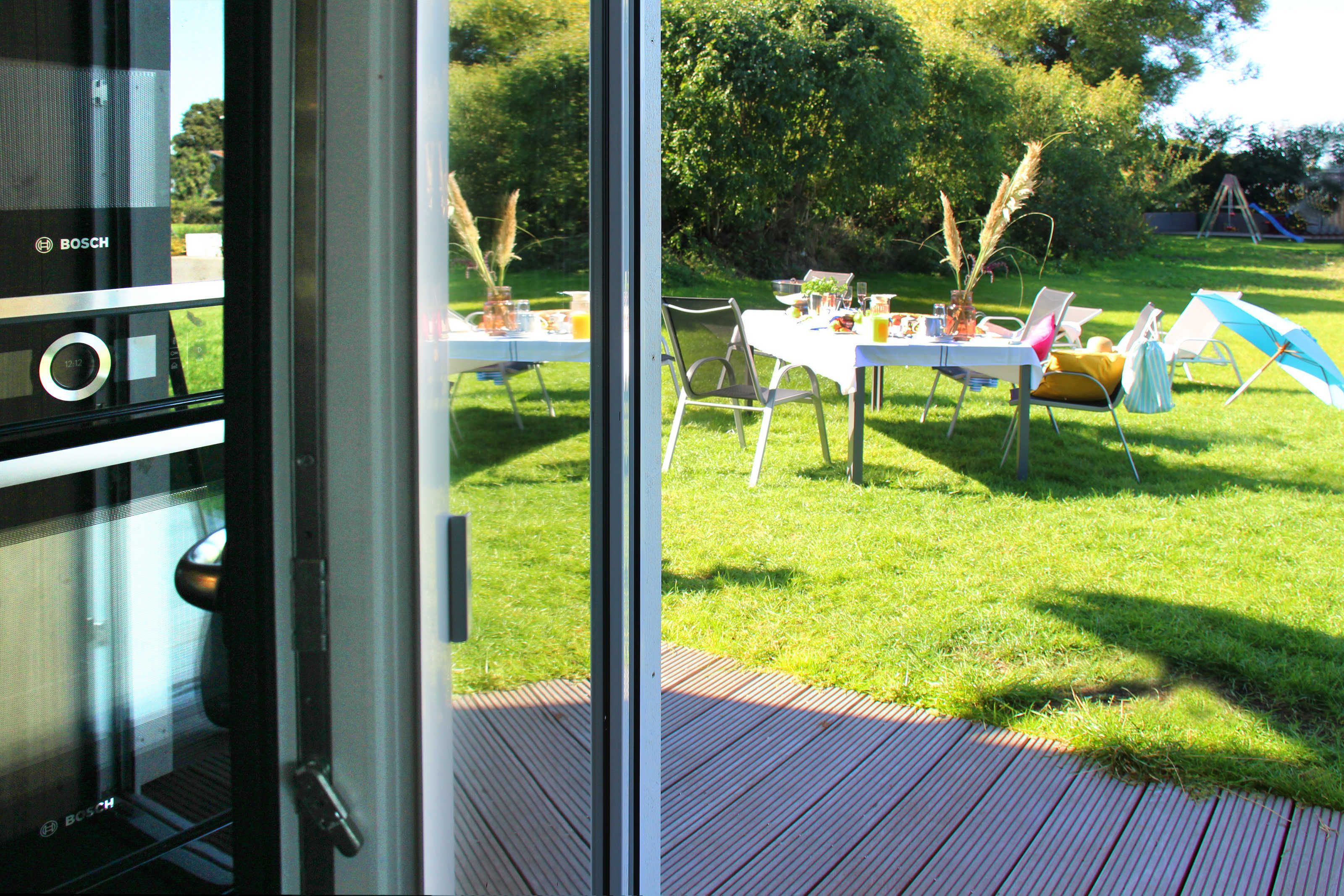 In der unteren Etage ist ein großer Essbereich inkl. großer Südterrasse und in der oberen Etage ein großer Wohnbereich mit großem Balkon nach Dänemark.