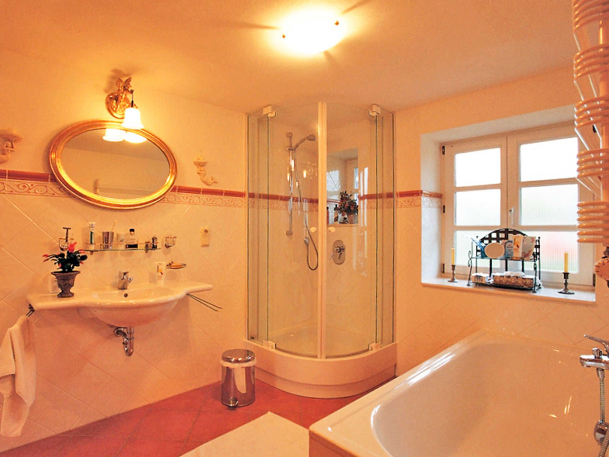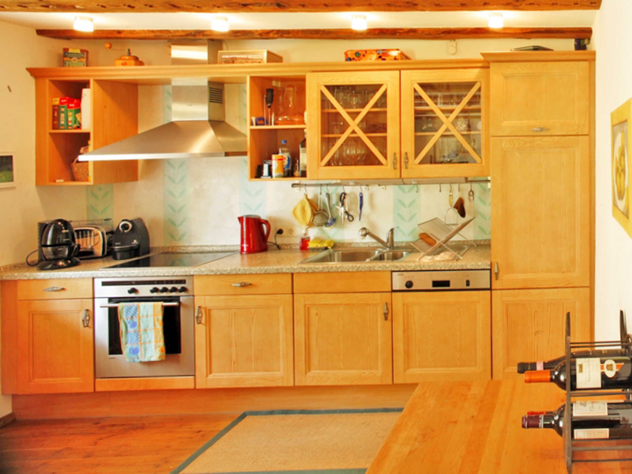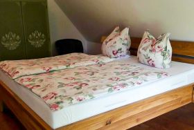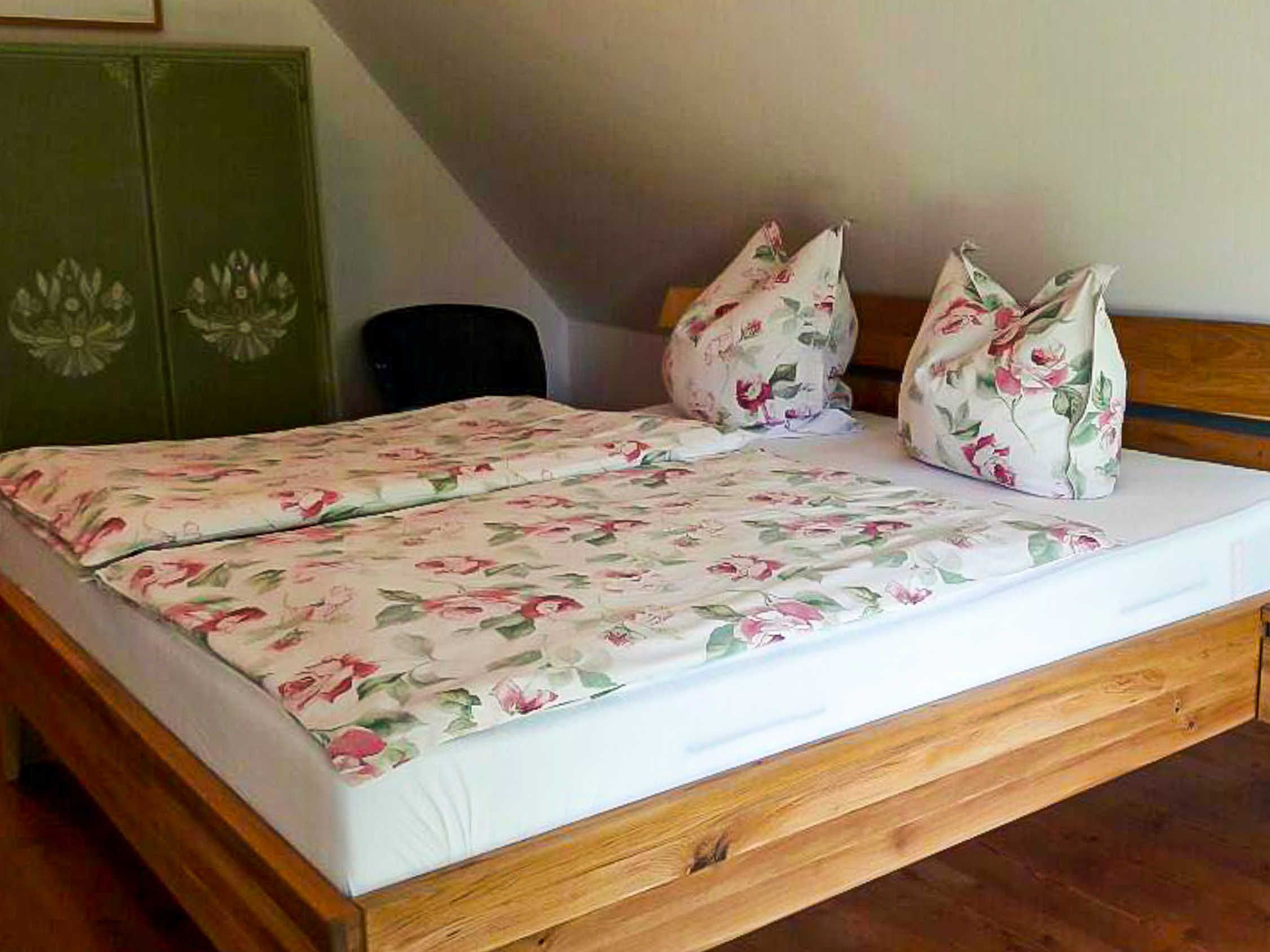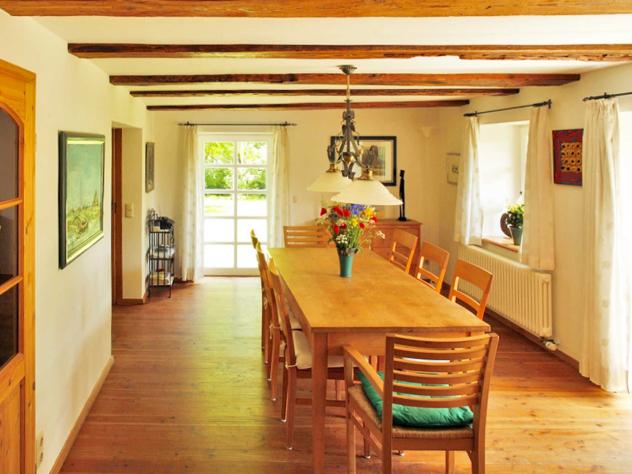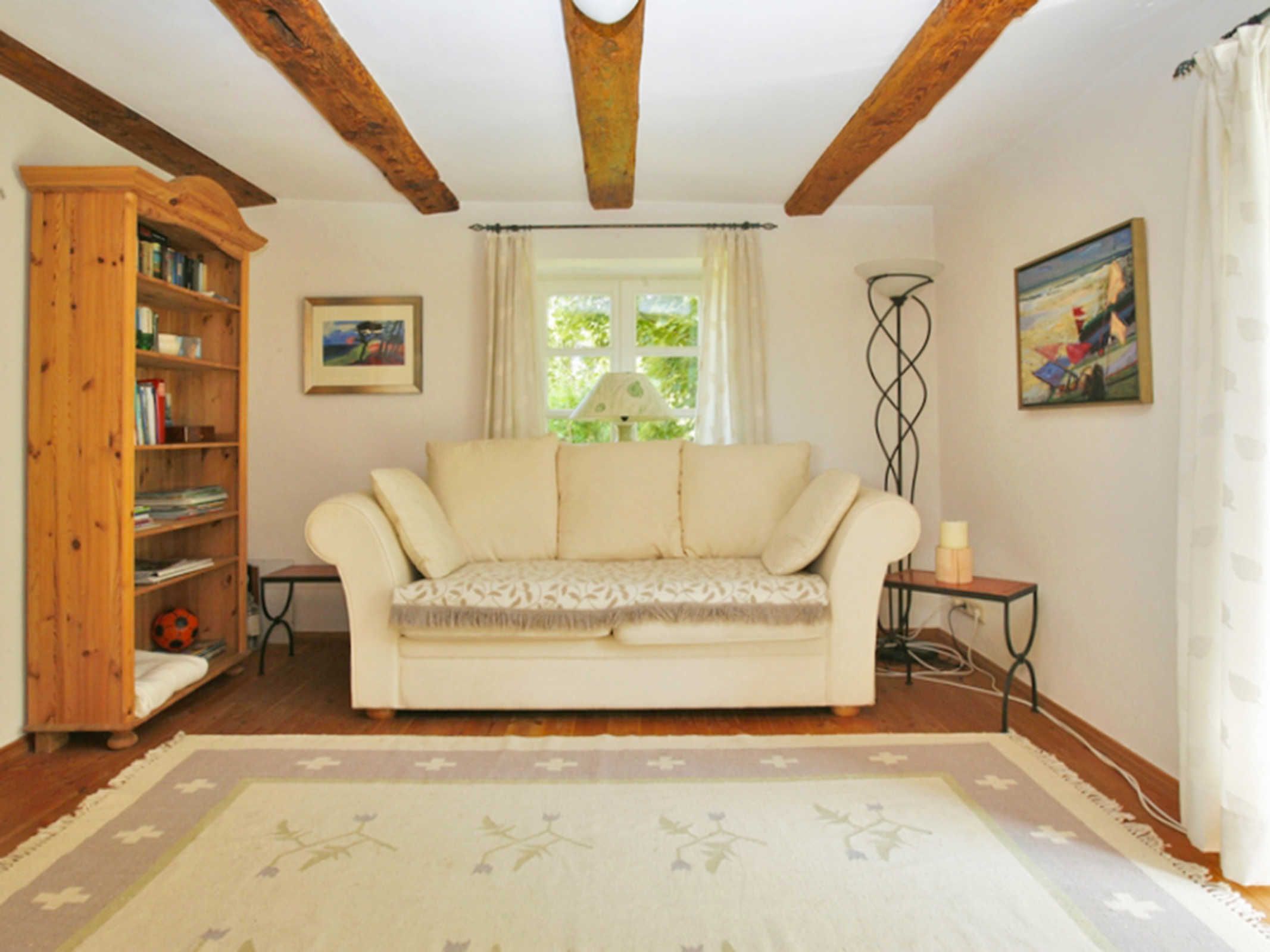 Im Landhaus Rubitz verteilen sich die Wohnbereiche auf 85 m² über zwei Etagen und sind angenehm offen gestaltet. Im Erdgeschoss befindet sich der Wohnbereich mit Sofa, TV und Bibliothek, ideal für ruhige Stunden nach einem Tag am Wasser oder einer Radtour. Der Essbereich schließt direkt an und geht in die Küche über, sodass Kochen, Essen und Zusammensitzen wunderbar zusammenpassen. Die Küche ist vollständig ausgestattet mit Herd, Backofen, Mikrowelle, Spülmaschine, Kühlschrank, Kaffeemaschine und Kochutensilien für den täglichen Bedarf. Auch eine Waschmaschine steht zur Verfügung, praktisch für längere Aufenthalte oder Urlaub mit Kind. Das Badezimmer bietet sowohl Dusche als auch Badewanne, das WC ist separat. Im Obergeschoss liegen die zwei Schlafzimmer, eines mit Doppelbett (180x200) und eines mit Einzelbett (90x200), passend für die Belegung mit bis zu drei Personen.