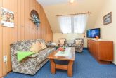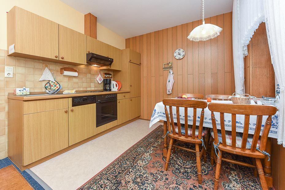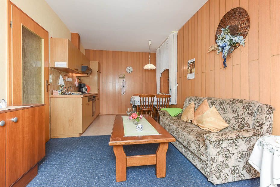 Größe ca. 45 Quadratmeter, Wohnraum mit integrierter Küche, Schlafzimmer, zweites separates Schlafzimmer/Kinderzimmer, Badezimmer mit Dusche, Waschtisch und WC, Obergeschoss, optimal für 2 bis 4 Personen.