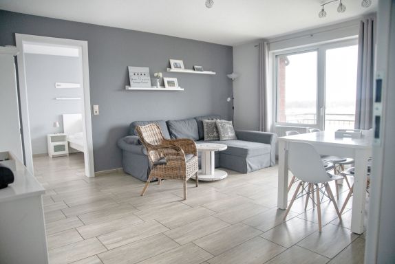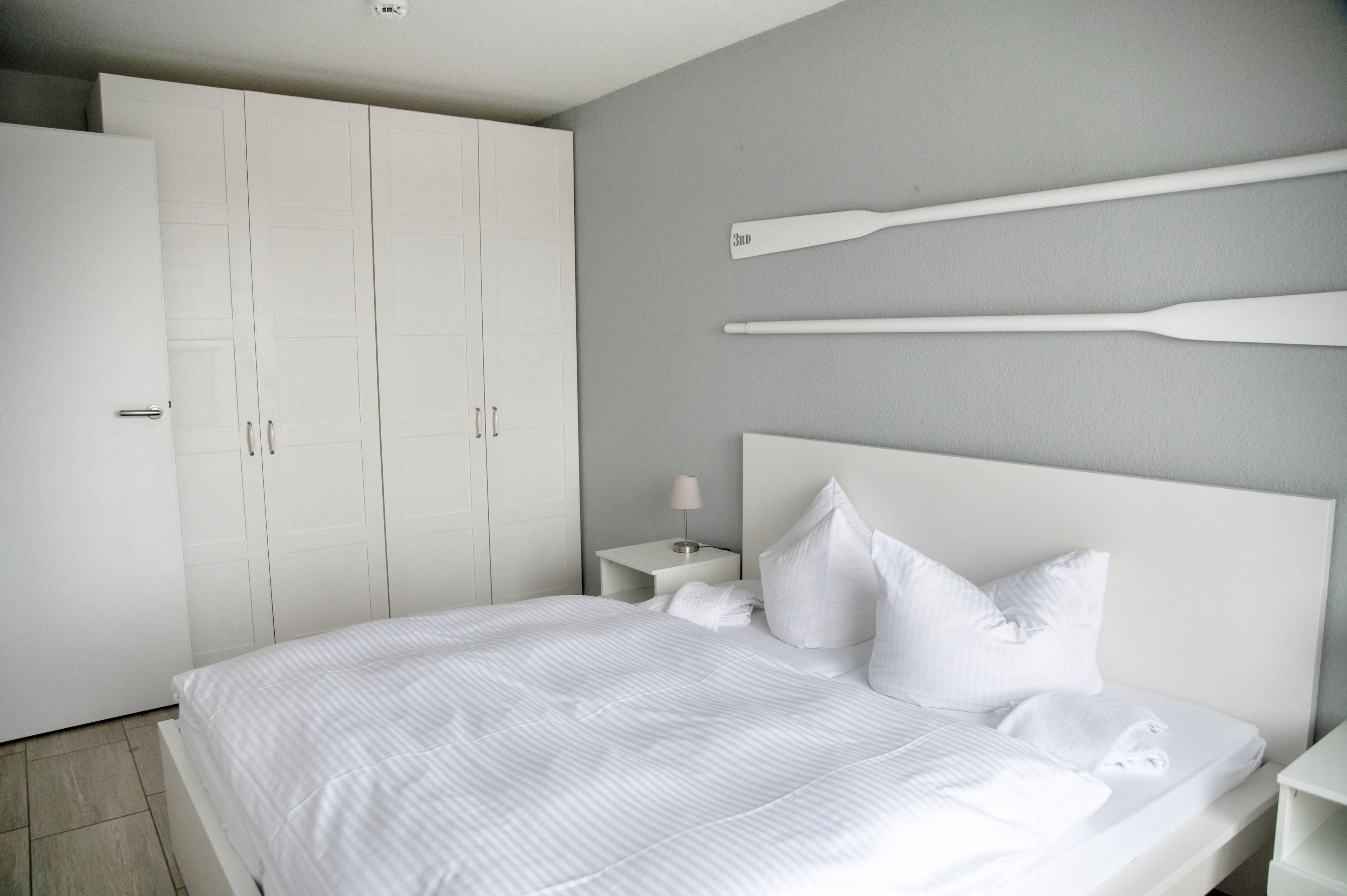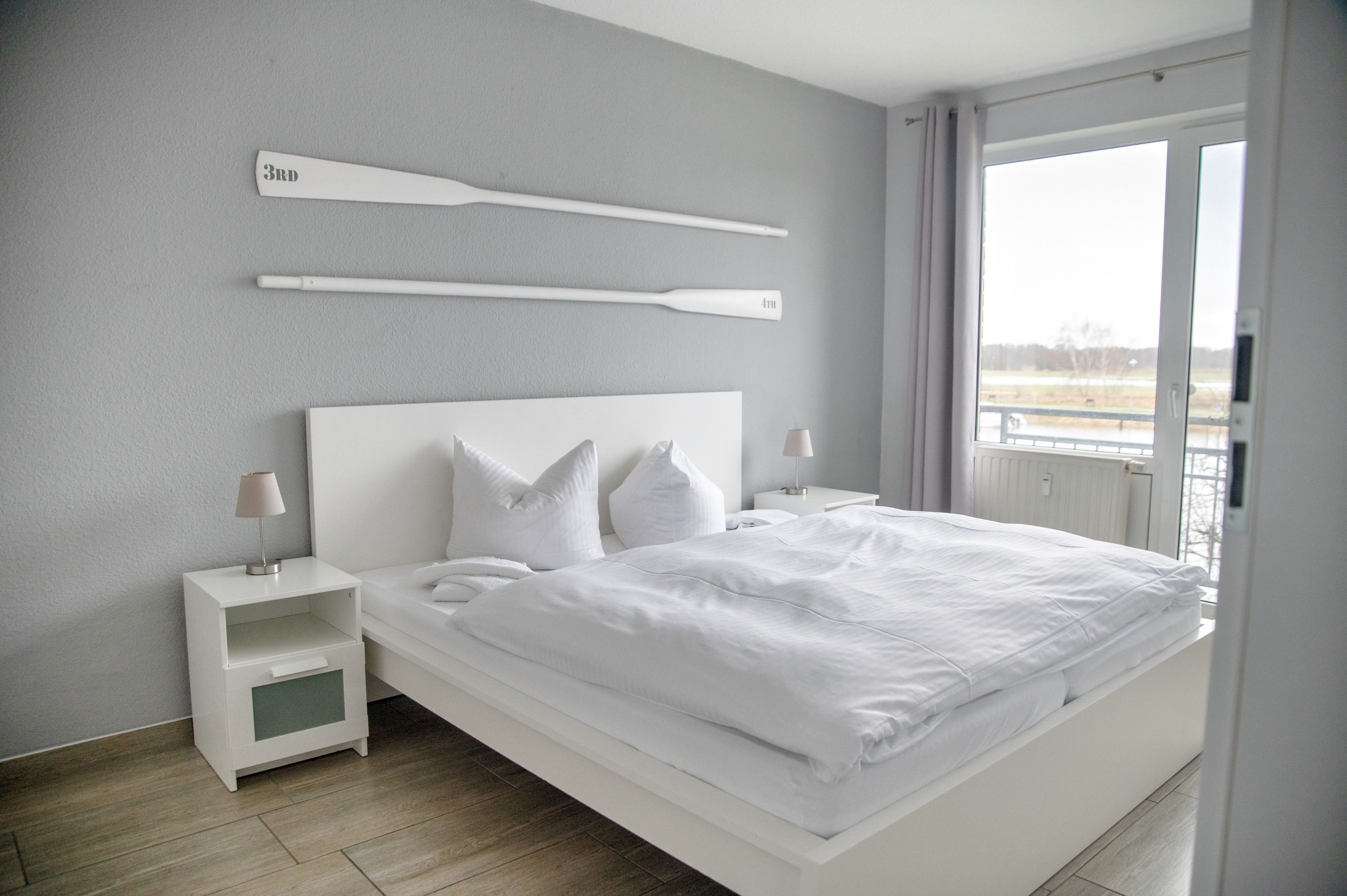 Bei der Ferienwohnung Ree! handelt es sich um eine hochwertig eingerichtete, maritim geprägte Nichtraucherwohnung, die sich auf 61 Quadratmeter erstreckt. Aus jedem Fenster und auch von den beiden südlich ausgerichteten Balkonen aus blicken Sie direkt auf die Hafenanlagen der Marina. Auf den beiden Balkonen stehen Ihnen Gartenstühle, ein Tisch und ein Sonnenschirm zur Verfügung. In den beiden Schlafzimmern und auch im Wohnzimmer sind die Fenster bodentief. So können Sie vom Bett aus die Boote im Hafenbecken fahren sehen.