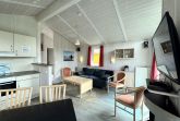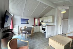 Das Wohnzimmer und die Küche liegen in offener Verbindung miteinander. Im Wohnzimmer finden Sie einen Bioethanolofen sowie den Ausgang auf die Terrasse. Das Ferienhaus bietet ausreichend Platz für bis zu 4 Personen und verfügt über 2 Schlafzimmer, ein Bad mit Dusche und Sauna sowie eine voll ausgestattete Küche.