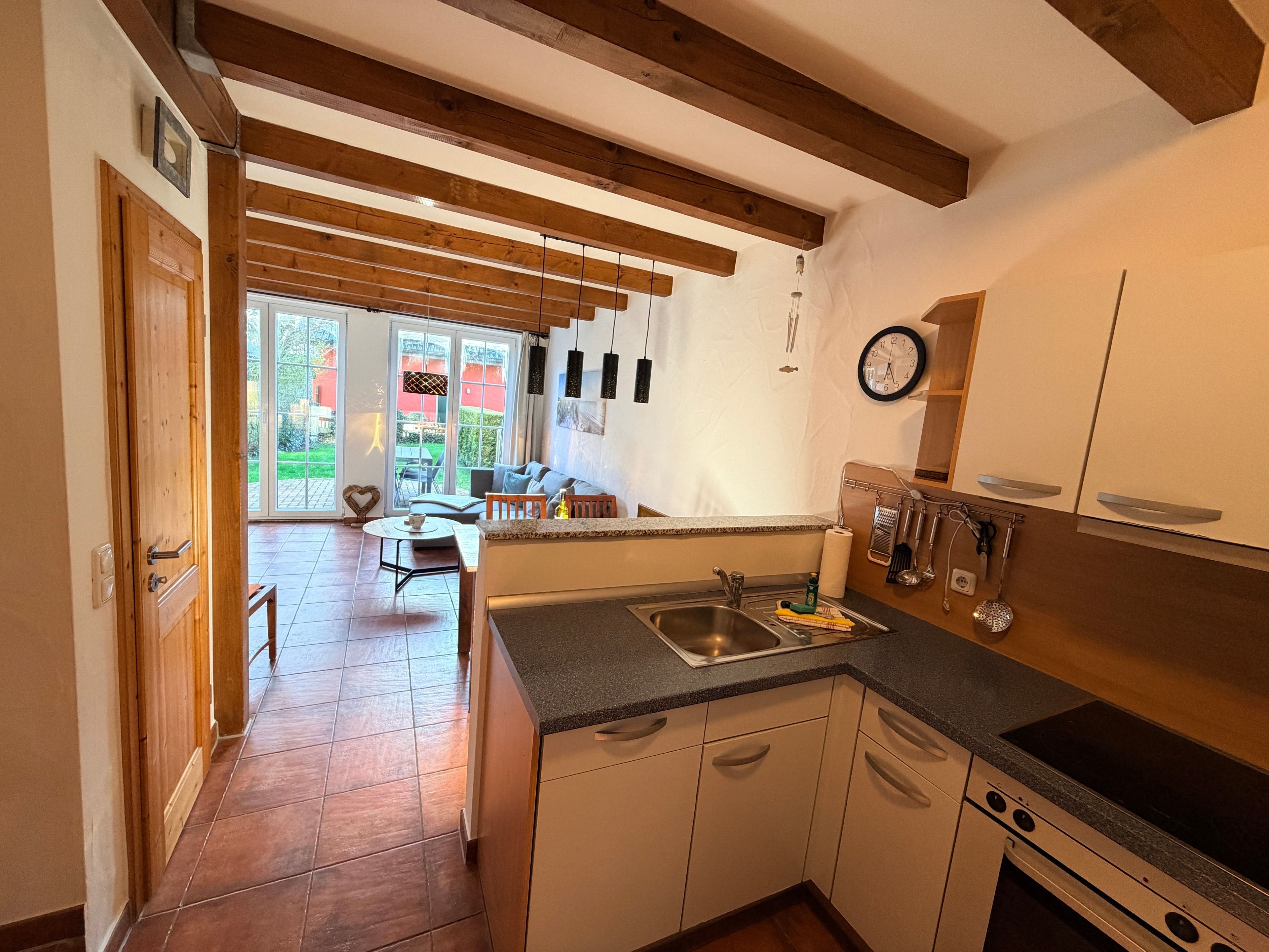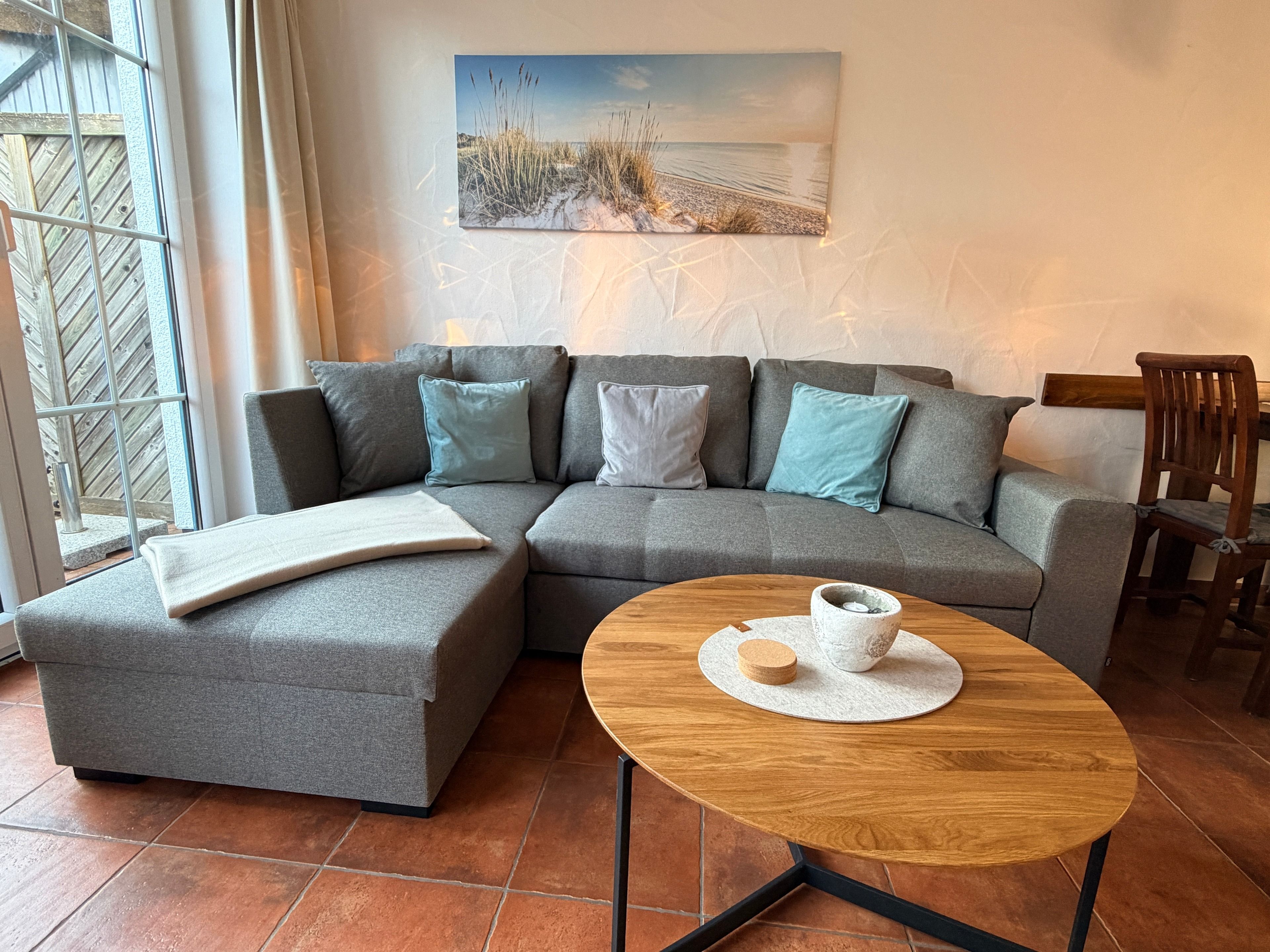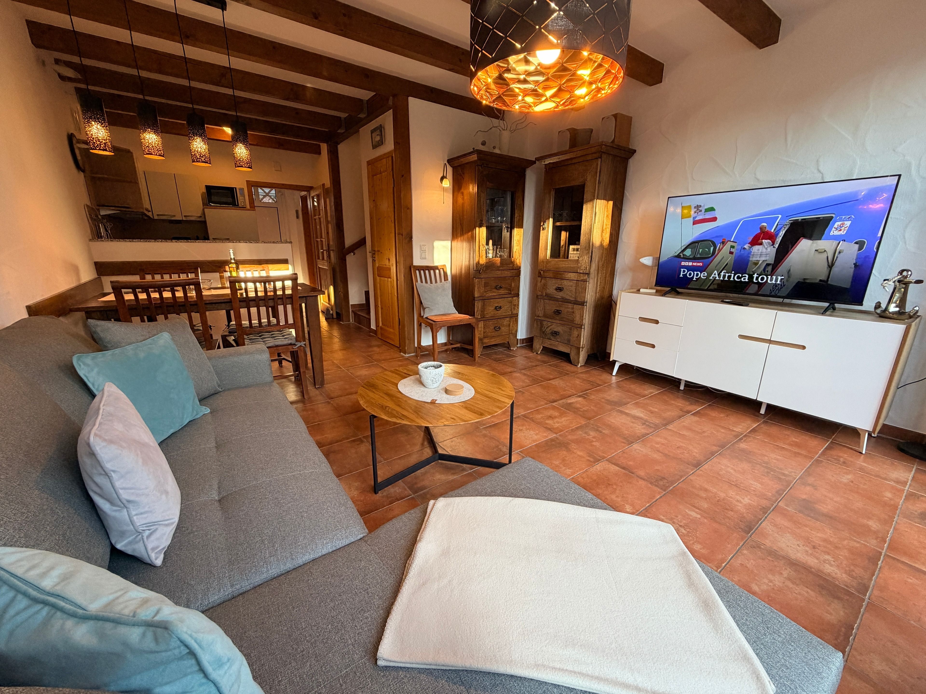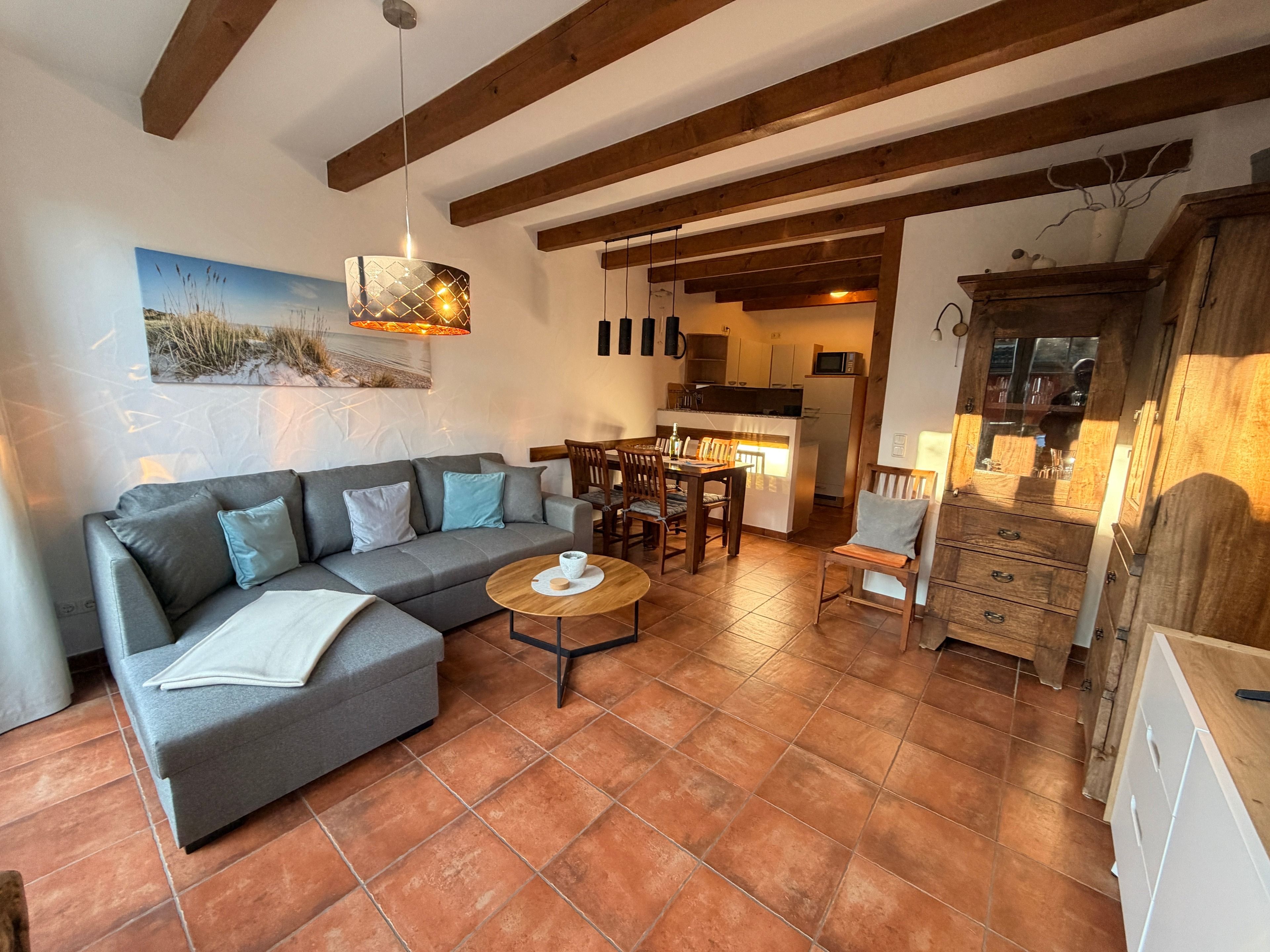 Schon beim Eintreten spüren Sie die behagliche Atmosphäre. Das geschmackvoll eingerichtete Wohnzimmer lädt zu entspannten Abenden nach einem erlebnisreichen Strandtag ein, während die voll ausgestattete Küche alles für gemeinsame Kochmomente bietet – vom Familienfrühstück bis zum gemütlichen Abend-