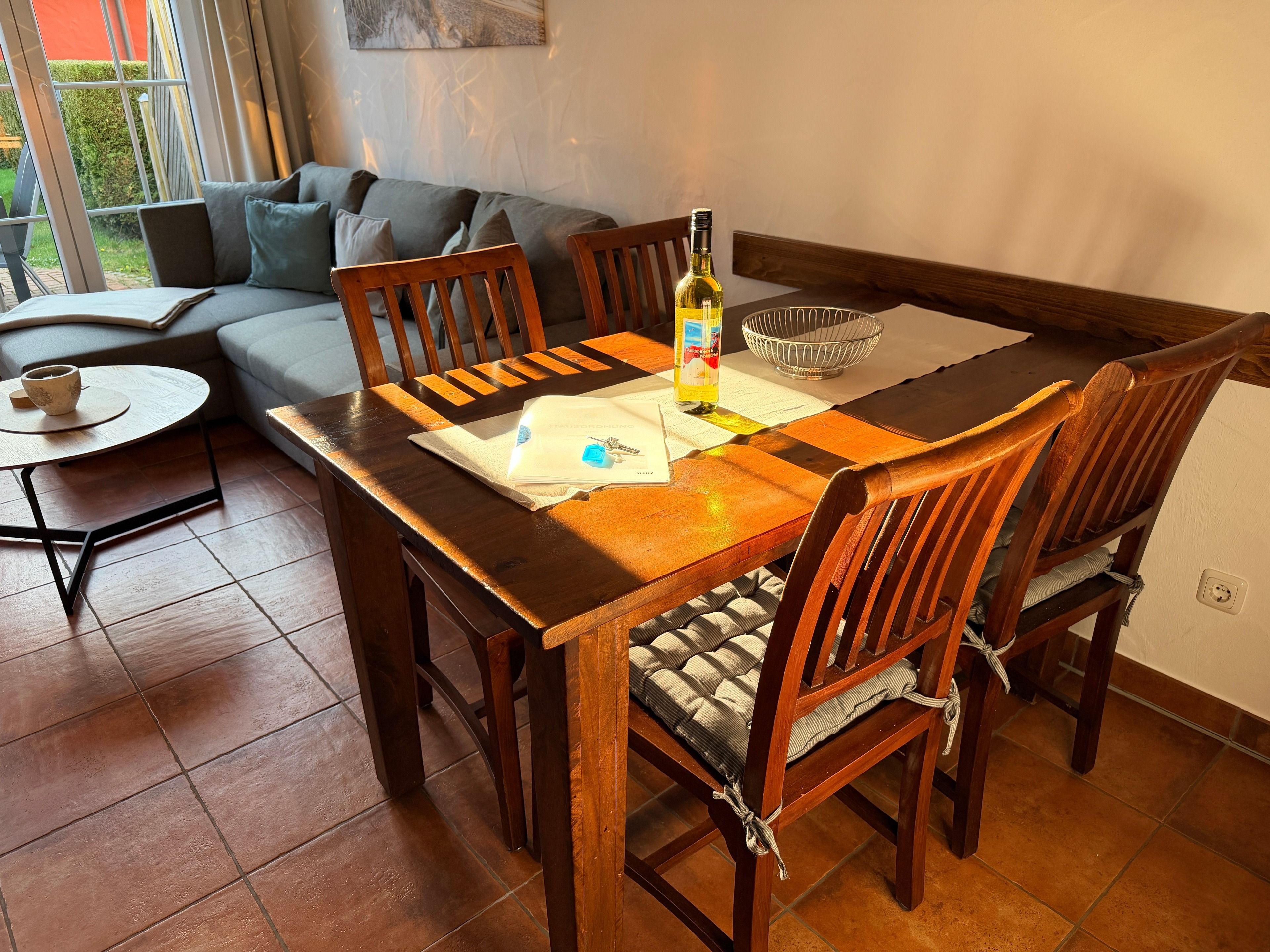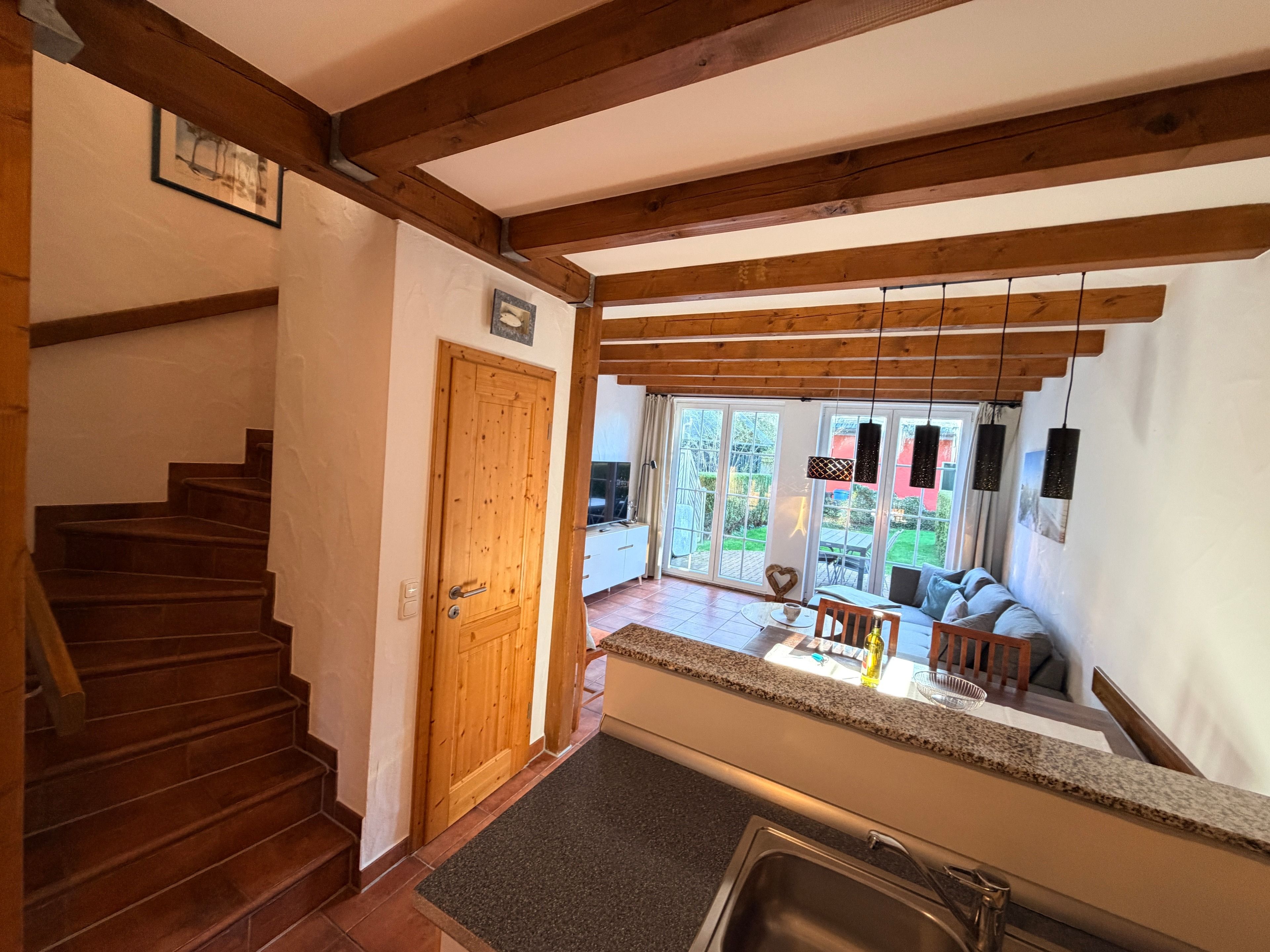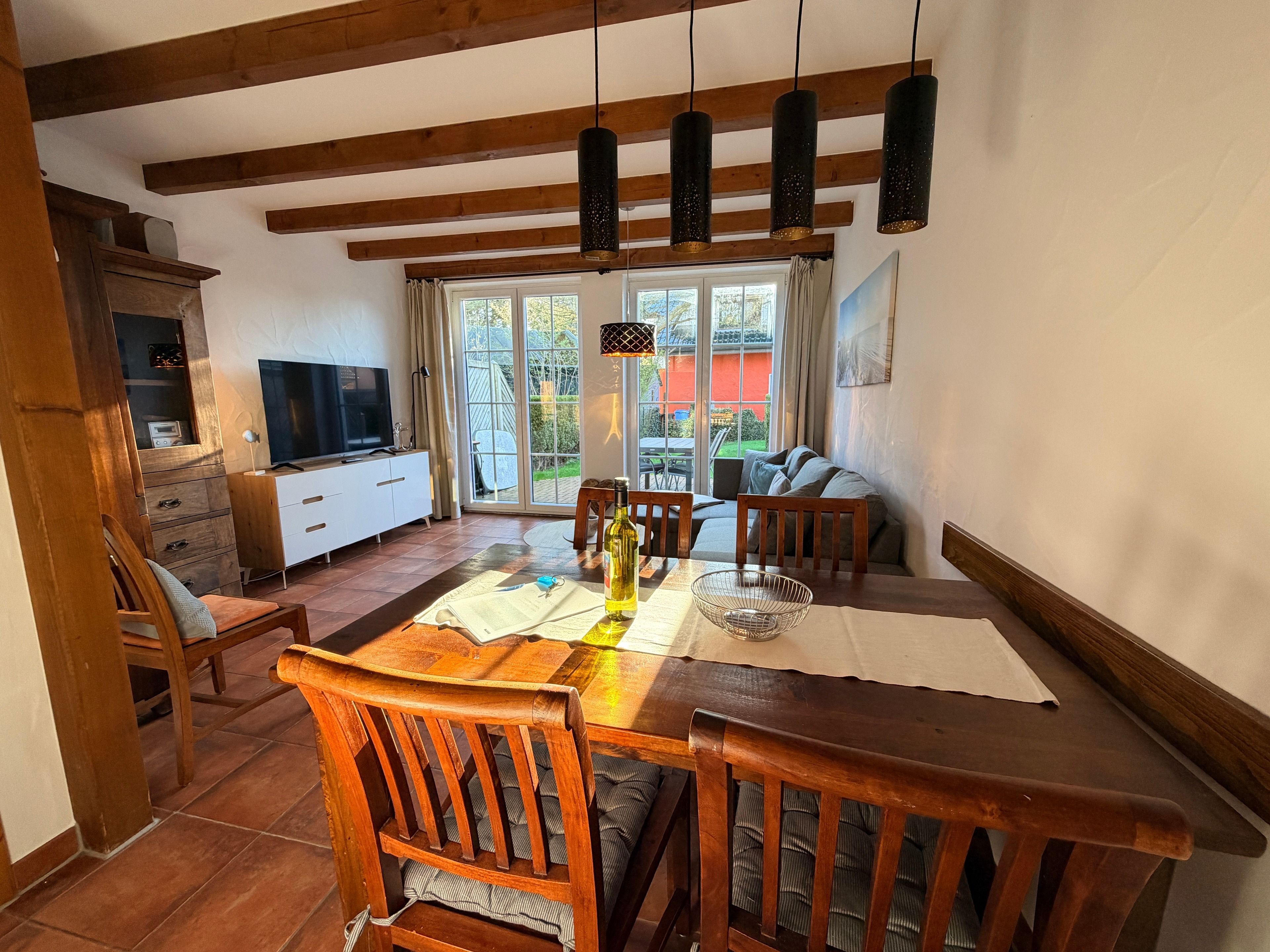 Schon beim Eintreten spüren Sie die behagliche Atmosphäre. Das geschmackvoll eingerichtete Wohnzimmer lädt zu entspannten Abenden nach einem erlebnisreichen Strandtag ein, während die voll ausgestattete Küche alles für gemeinsame Kochmomente bietet – vom Familienfrühstück bis zum gemütlichen Abend-