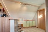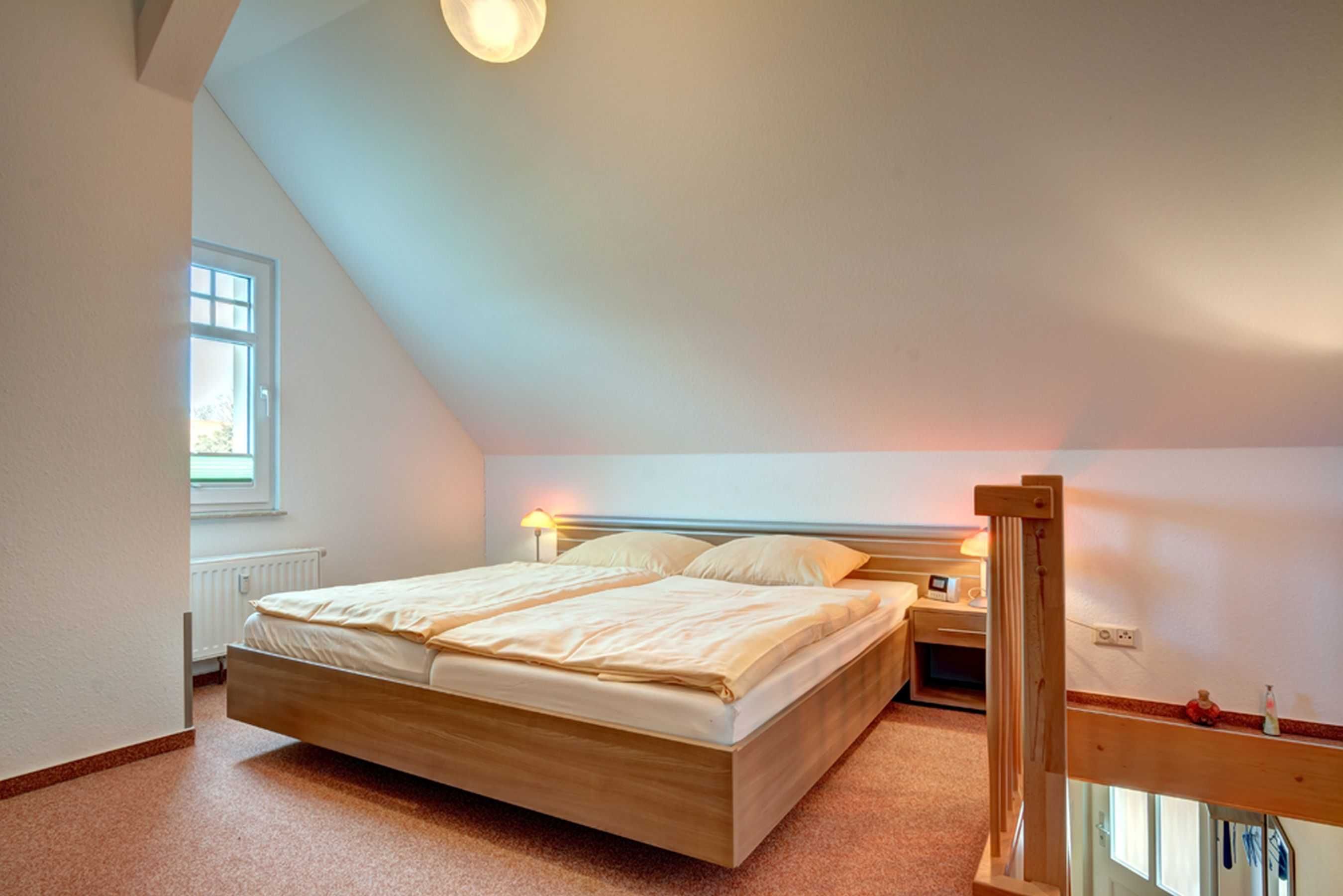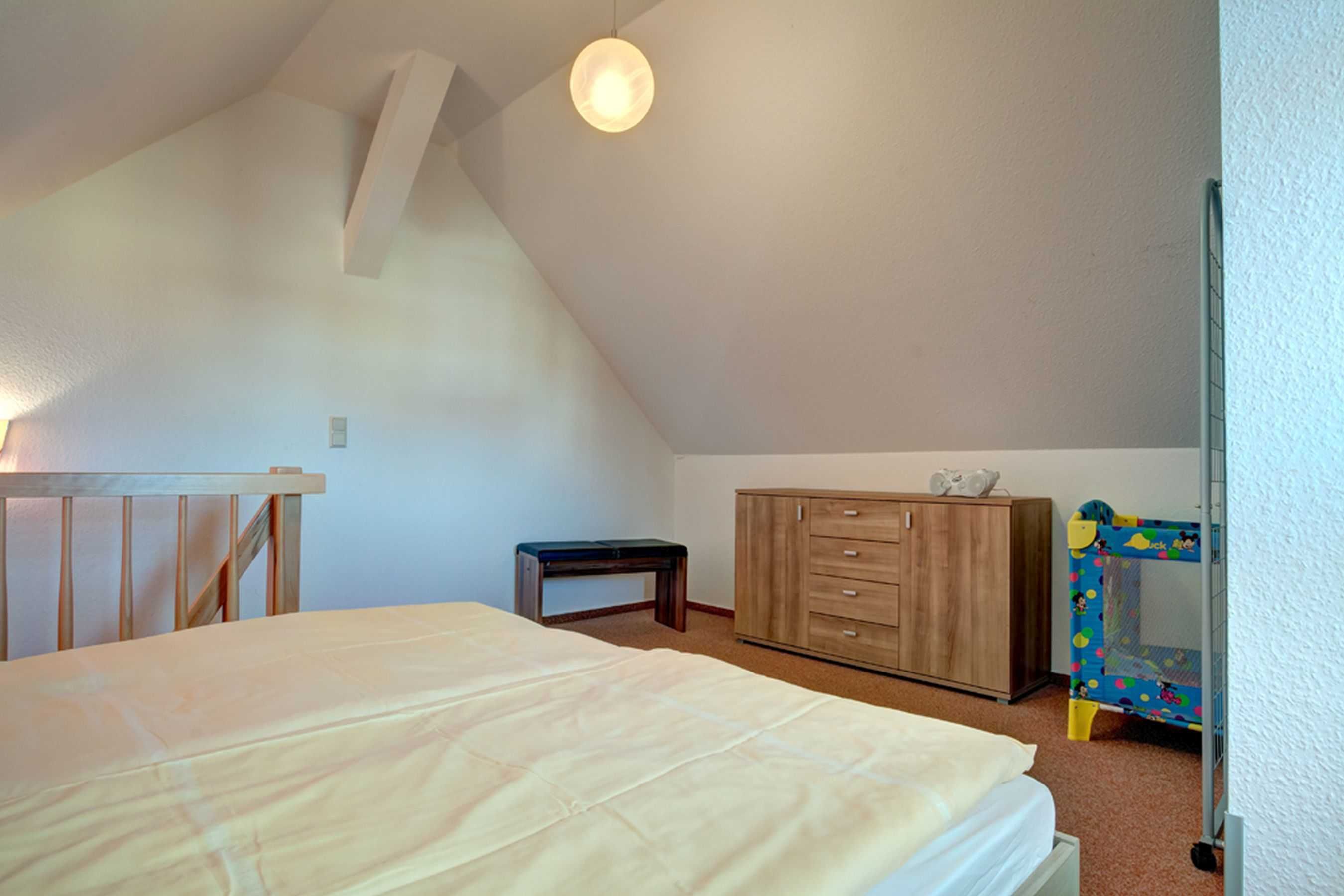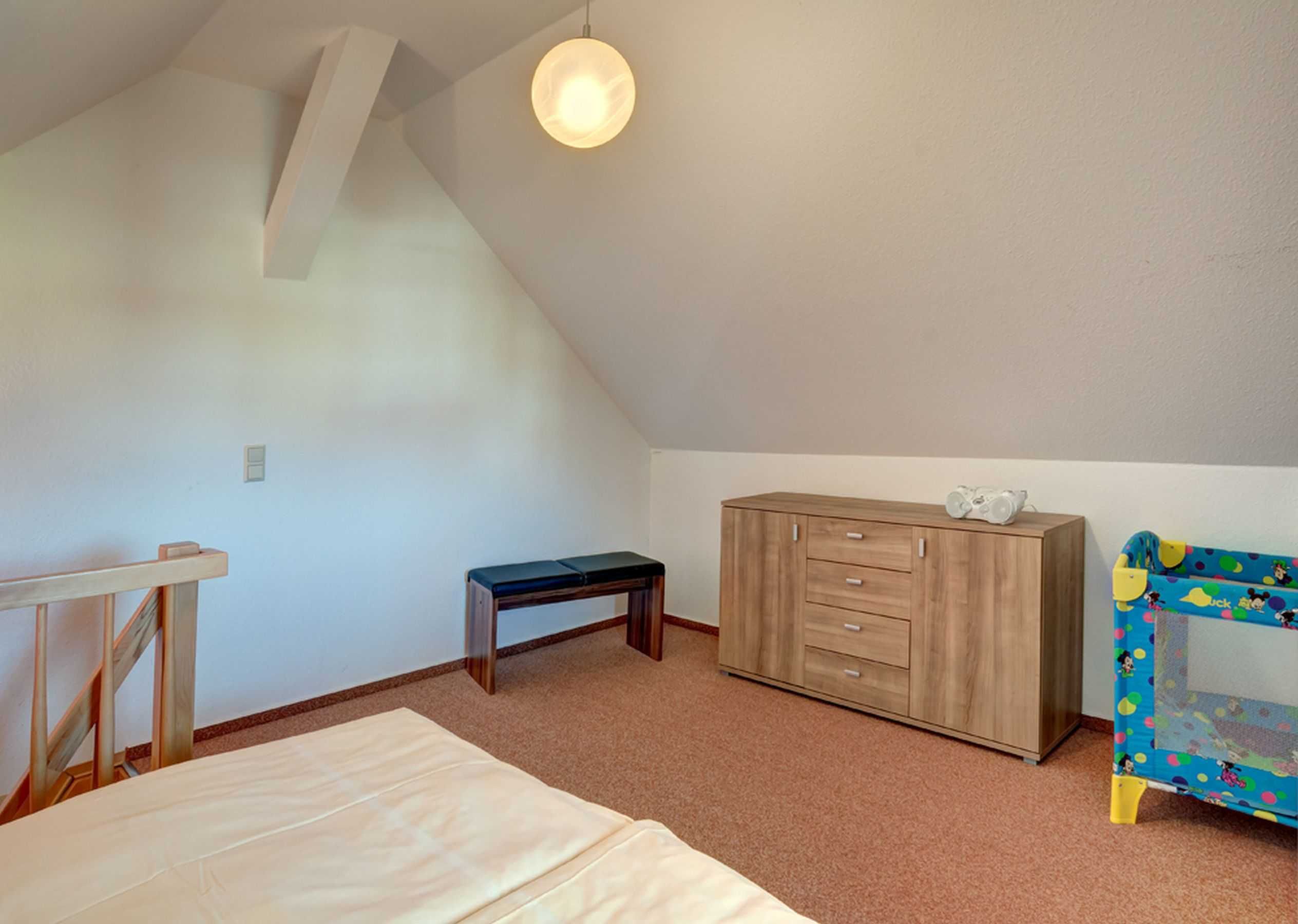 Das Schlafzimmer befindet sich im Dachgeschoss, erreichbar über eine Raumspartreppe. Hier stehen Ihnen ein großes Doppelbett mit 1,80 m breiter Liegefläche, sowie eine geräumige Kommode zur Verfügung.