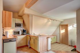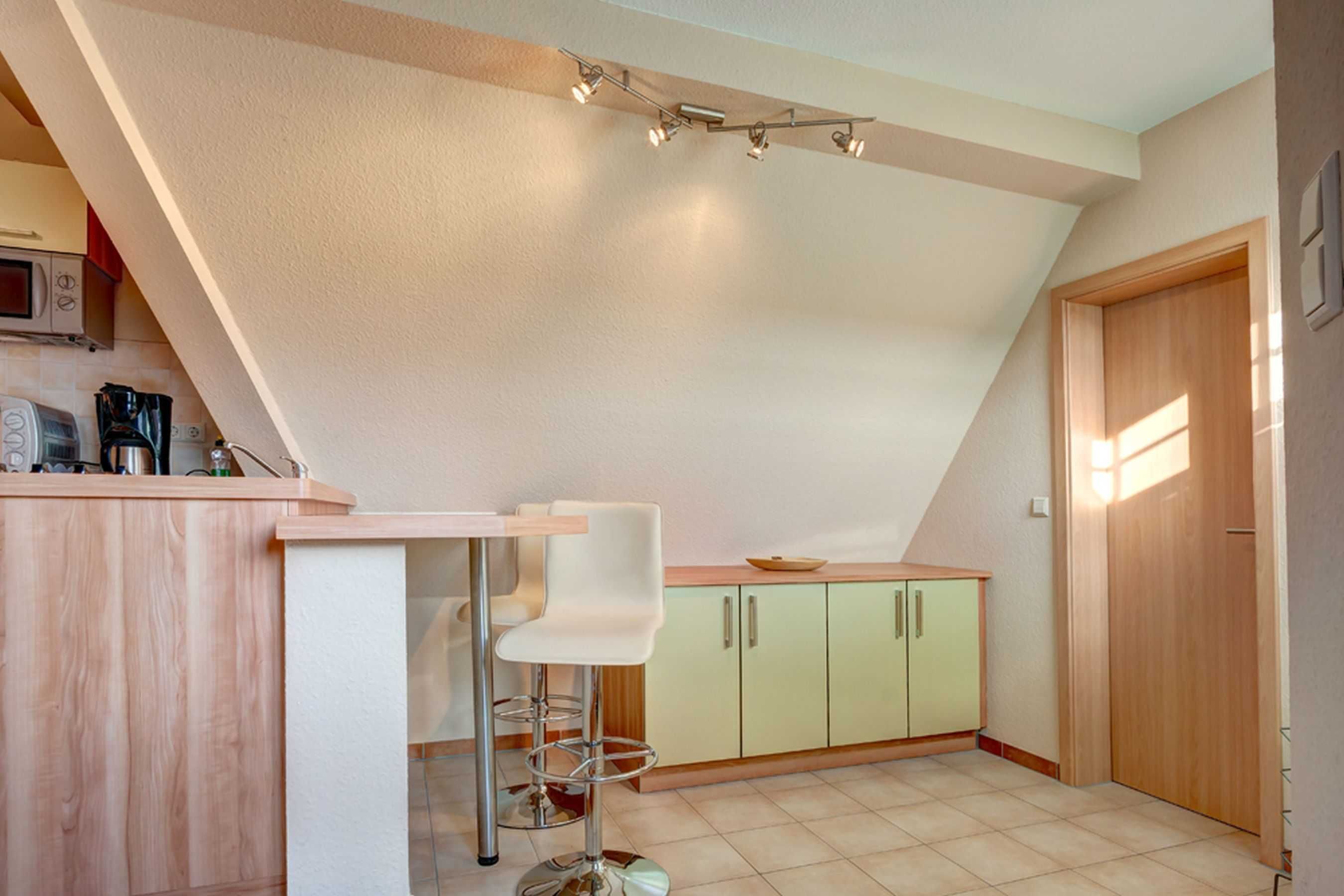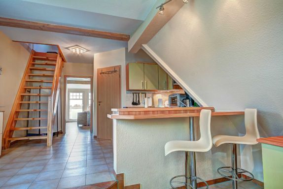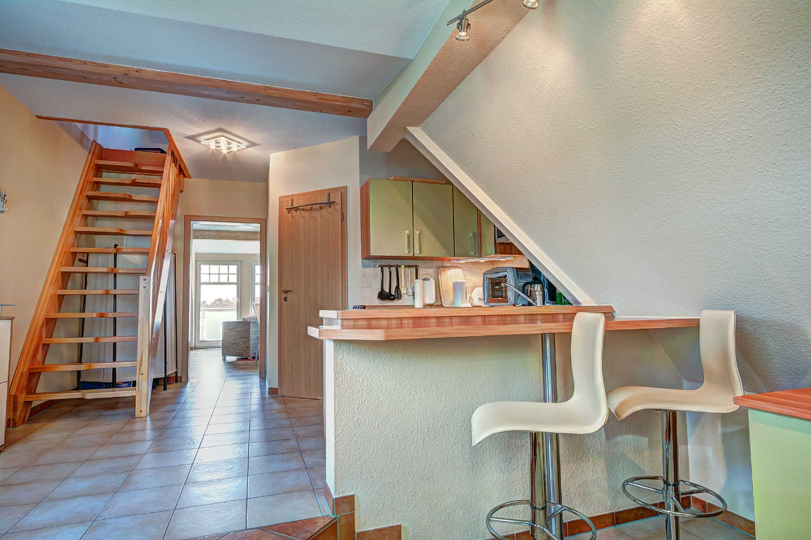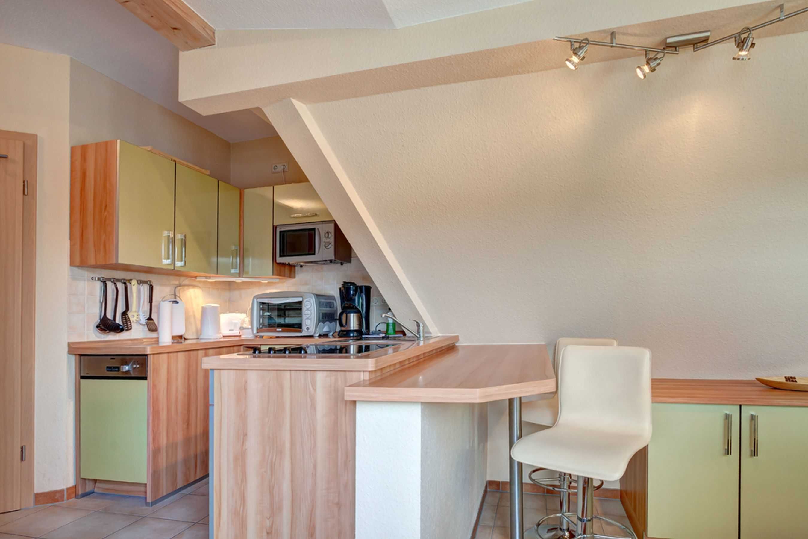 Die Küche ist komplett eingerichtet, mit Backofen und Cerankochfeld, Geschirrspüler, Kühlschrank, Mikrowelle, Kaffeemaschine, Toaster und Wasserkocher. Ein eingebauter Tresen mit 2 Barhockern eröffnet die Möglichkeit eines gemütlichen Drinks.