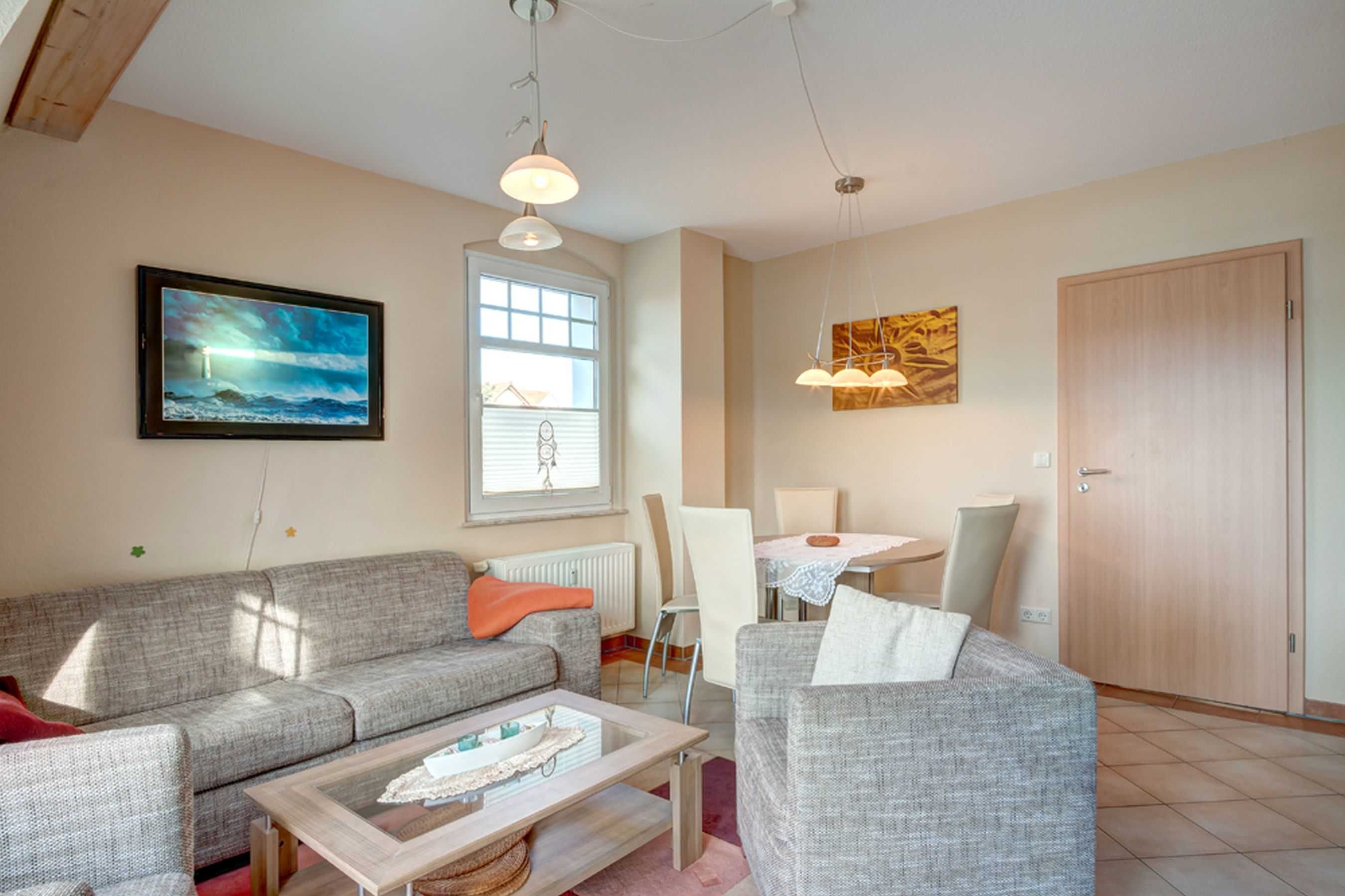 Für wohnliches Ambiente sorgen eine gemütliche Sitzecke ein moderne Schrankkombination, ein großer Flachbildfernseher, ein ausziehbarer Esstisch mit 6 Stühlen, ein DVD- Player, sowie ein CD-Radio. Das Wohnzimmer verfügt über eine Maxi-Sitzecke mit modernster Schlaffunktion, welche mit wenigen Handgriffen zu einem Doppelbett mit Kaltschaummatratze umfunktioniert werden kann.