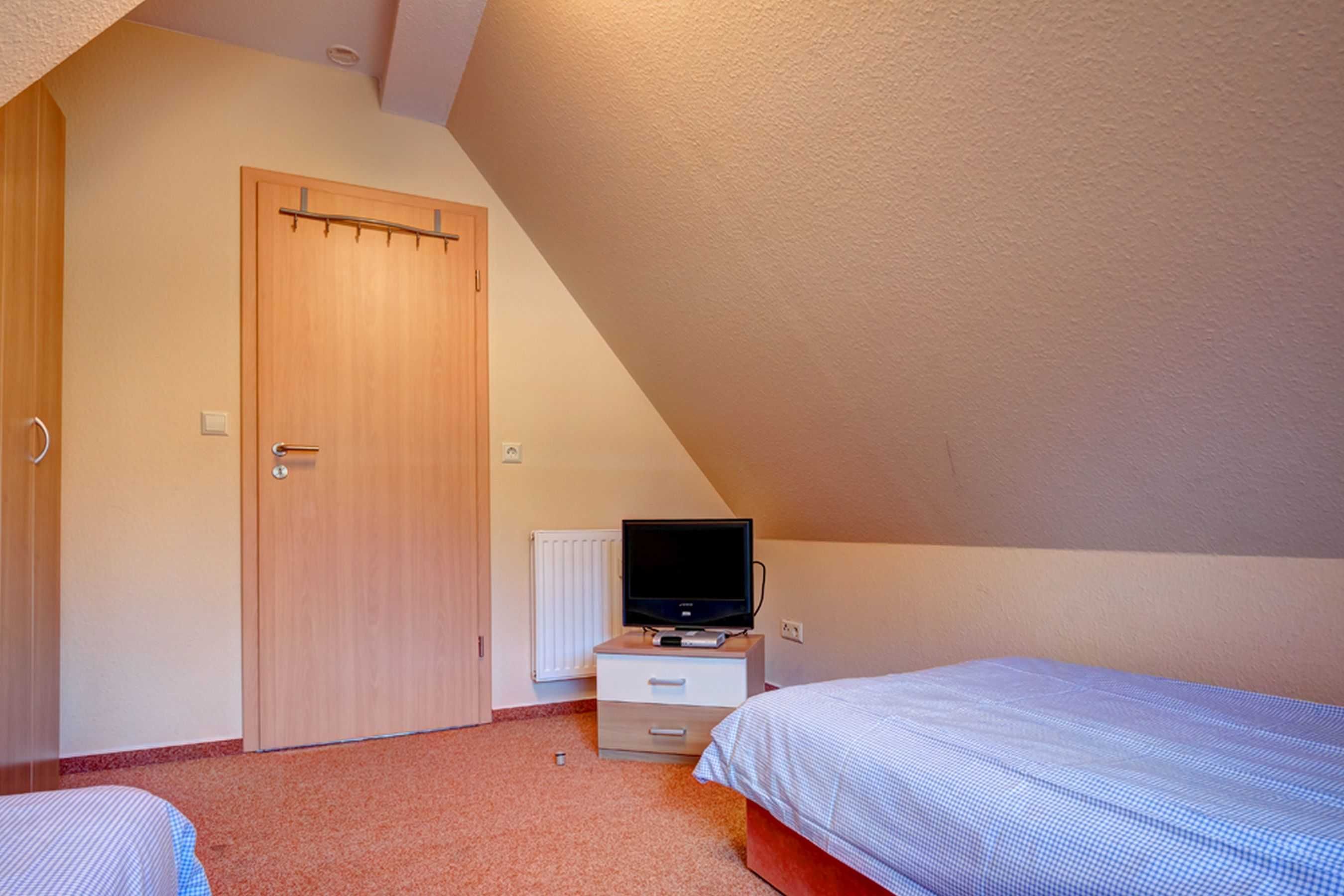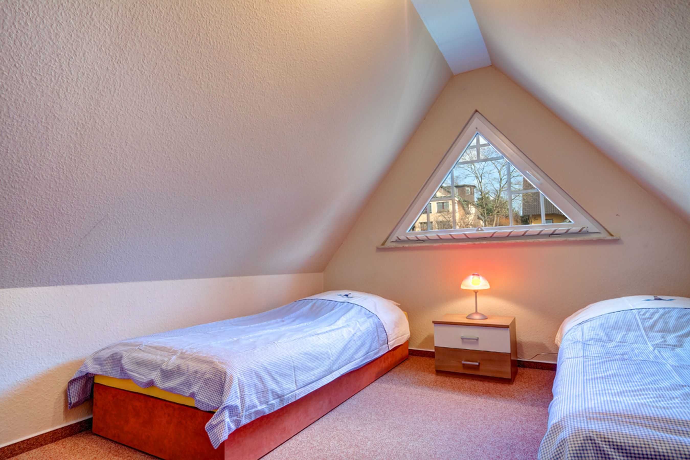 Im zweiten, etwas kleineren Schlafzimmer mit schönem Dreiecksfenster sind zwei Liegen mit jeweils 0,90m breiter Liegefläche. ein großer Kleiderschrank und 2 Nachtschränkchen untergebracht.