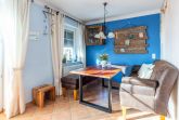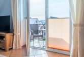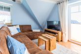 Der helle Wohnbereich lädt mit einer bequemen Couch mit Schlaffunktion sowie einem SAT-TV (Flatscreen) zum Entspannen ein. Die ausziehbare Couch bietet zusätzlich Schlafmöglichkeiten für zwei weitere Gäste. Eine gemütliche Essecke ist ebenfalls vorhanden. Vom Wohnzimmer aus gelangen Sie auf den möblierten Südbalkon, auf dem Sie sonnige Stunden genießen können.