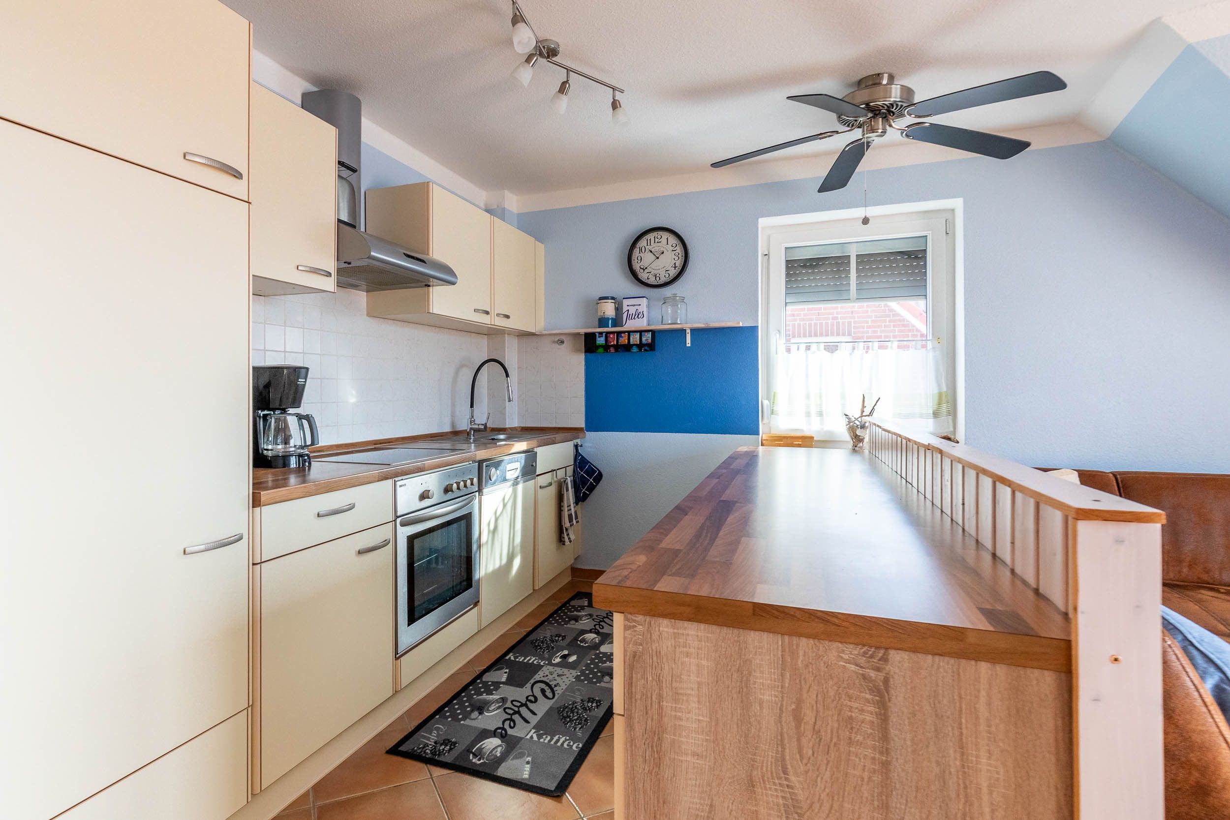 Die offene Küchenzeile ist umfassend ausgestattet und verfügt über Herd, Backofen, Kühlschrank mit Gefrierfach, Geschirrspülmaschine, Toaster, Nespresso-Kaffeemaschine, Filter-Kaffeemaschine, Wasserkocher sowie ausreichend Geschirr und Küchenutensilien. Zusätzlich steht unseren Gästen eine Mikrowelle zur Verfügung.