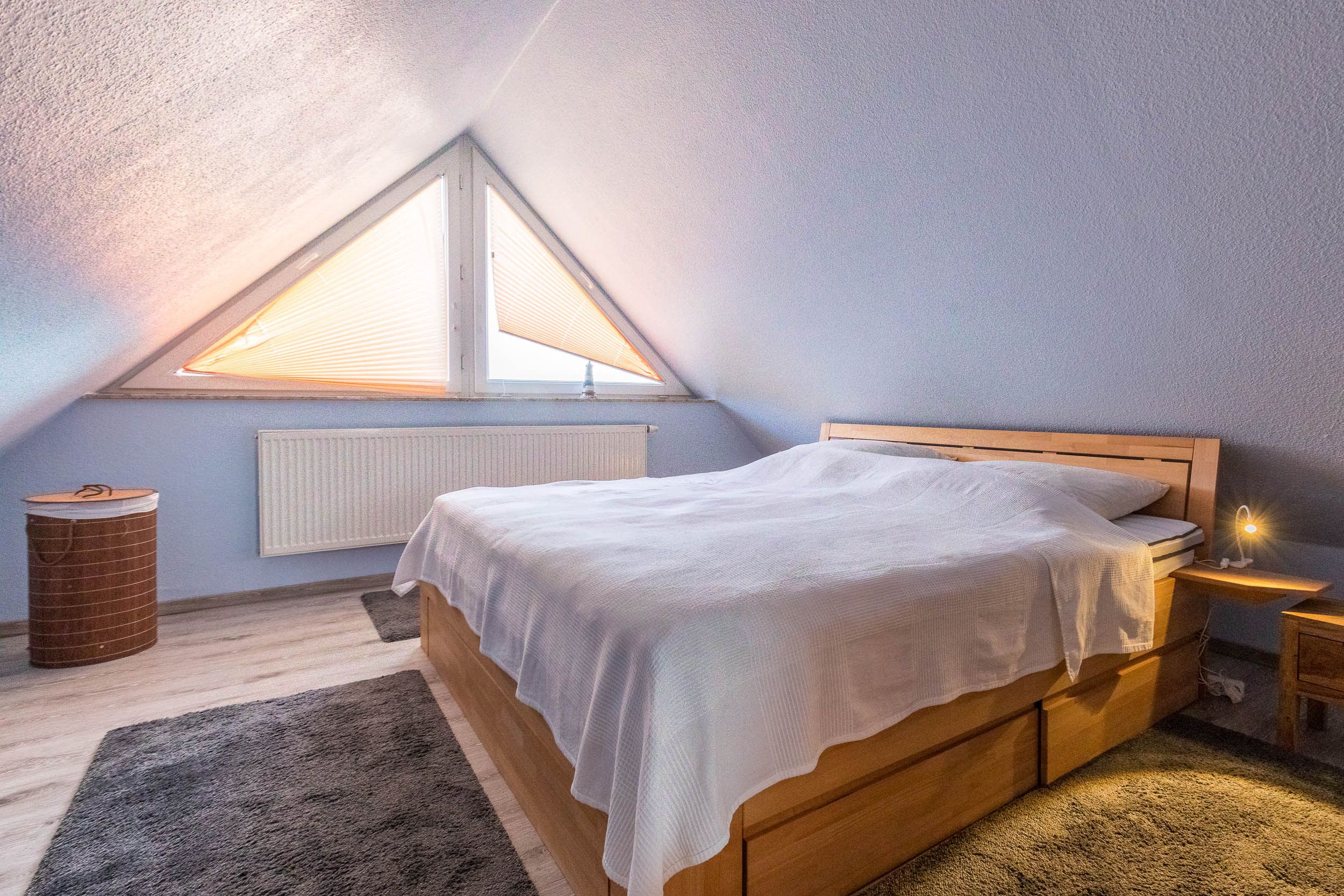 Das Schlafzimmer ist mit einem komfortablen Doppelbett und einem geräumigen Kleiderschrank ausgestattet. In der offenen Galerie, die über eine Treppe erreichbar ist, befindet sich ein weiteres Doppelbett für zwei Gäste sowie ein Kleiderschrank. Dort steht den Gästen außerdem ein zusätzlicher Flachbild-TV zur Verfügung.