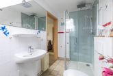 Das Bad mit Tageslichtfenster besteht aus einer Duschkabine, Waschtisch und WC.