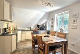 Der Wohnbereich ist mit Sofa, TV sowie Radio ausgestattet und geht in eine offene Küche über. Ein Essbereich mit Esstisch ist vorhanden. Die Küche ist umfassend ausgestattet: Herd mit 4-Platten-Kochfeld, Backofen, Kühlschrank mit Gefrierfach, Spülmaschine sowie Kaffeemaschine, Wasserkocher und Toaster. Geschirr, Besteck und Küchenutensilien stehen bereit.