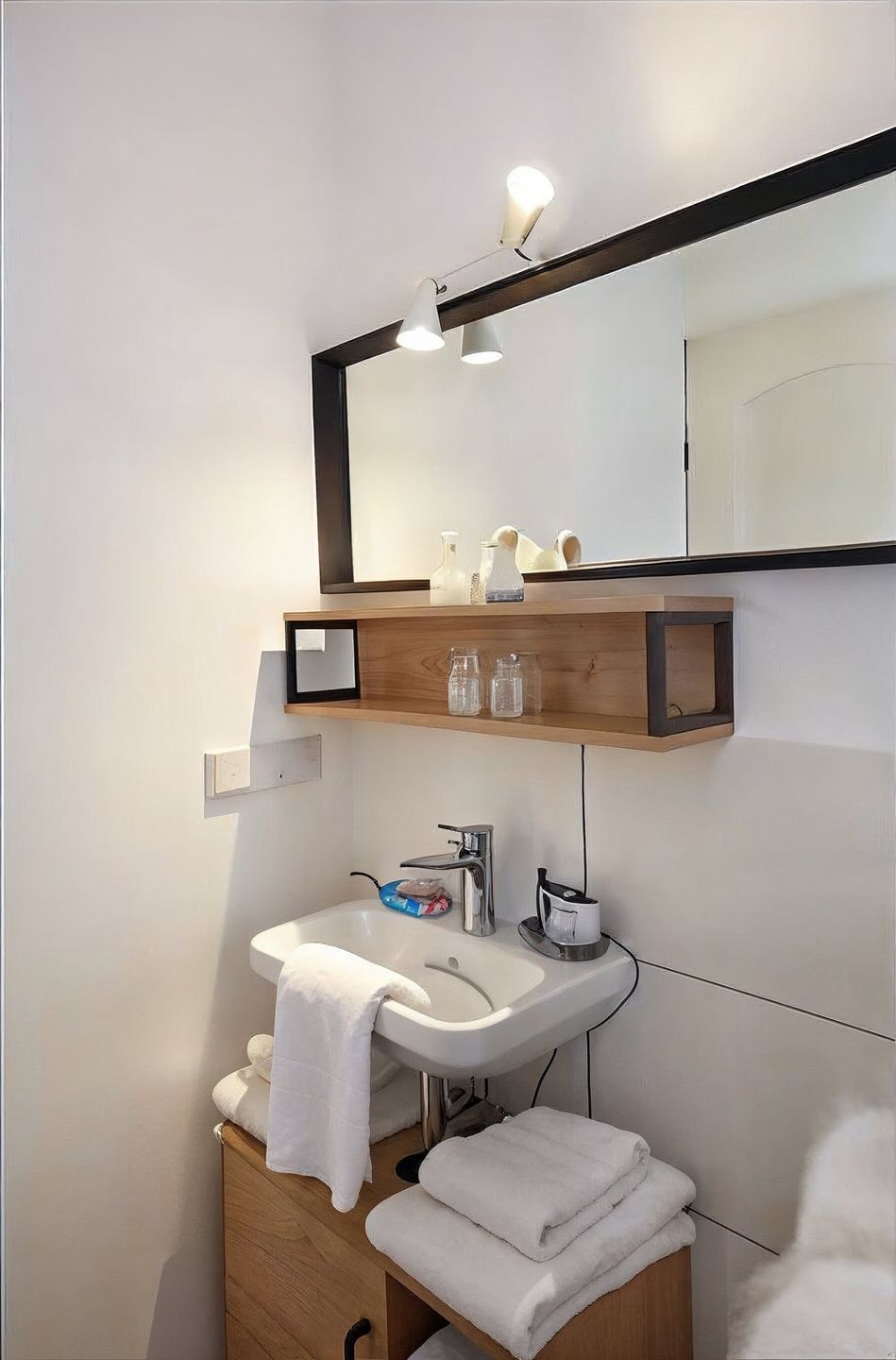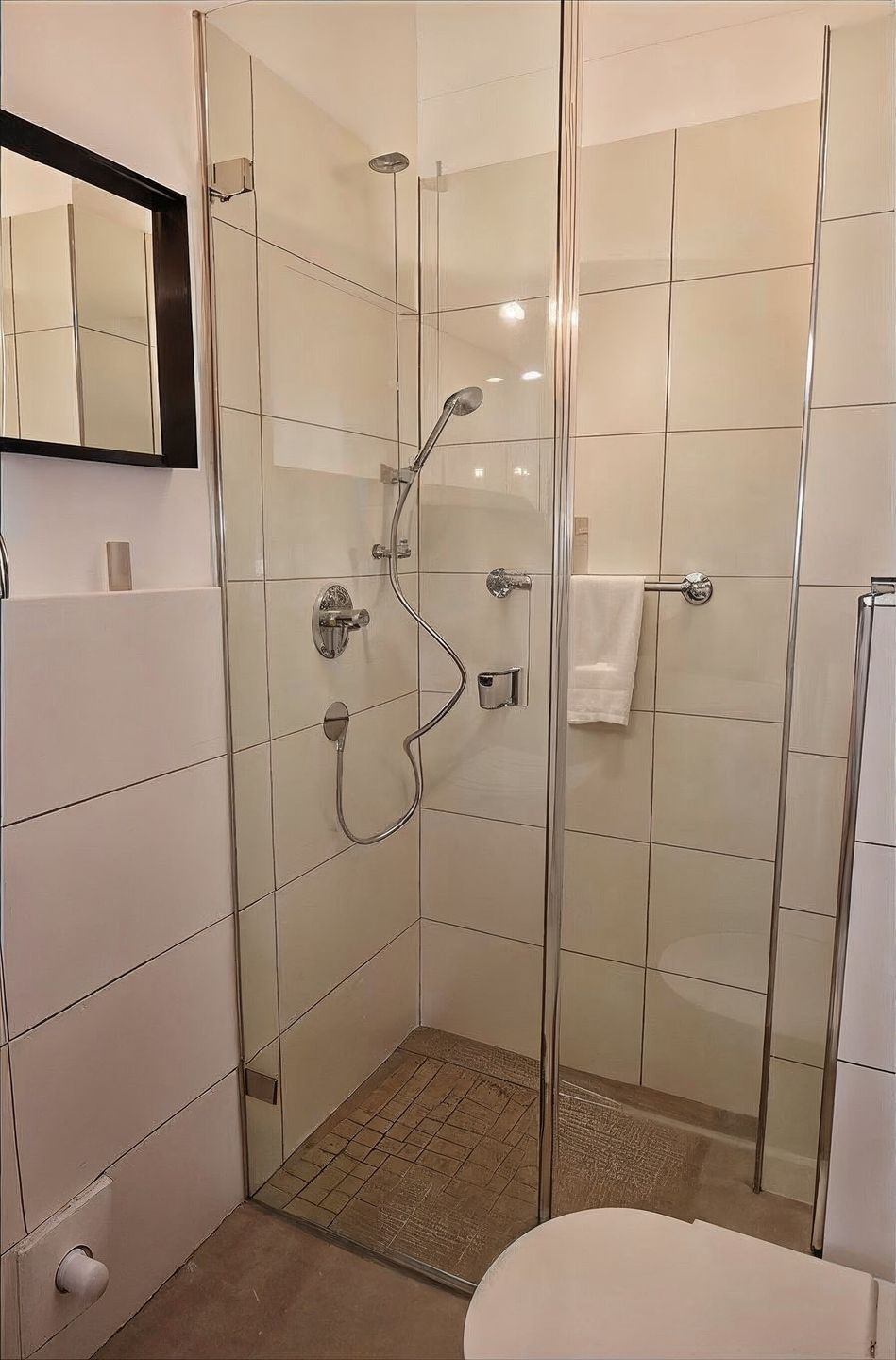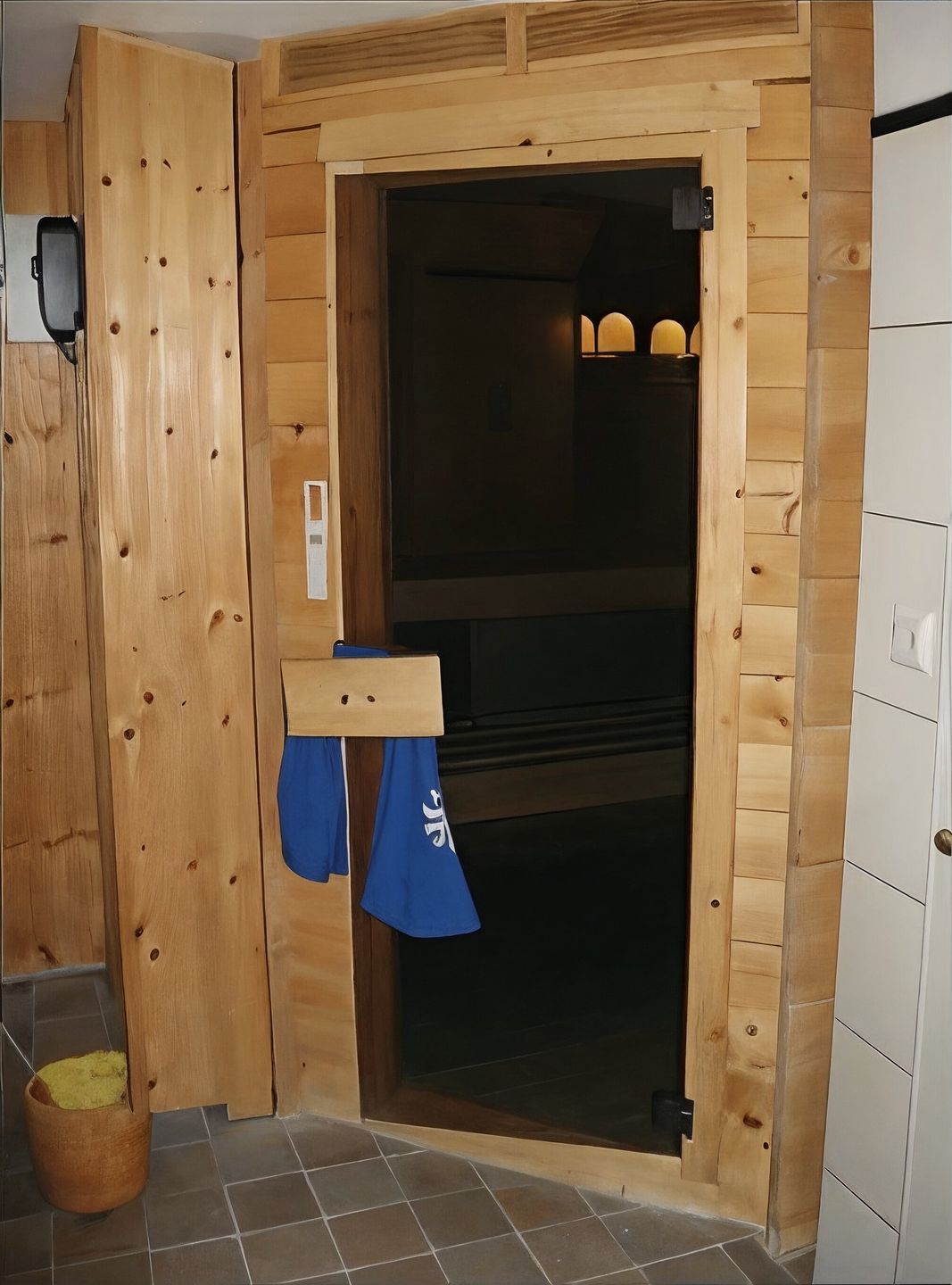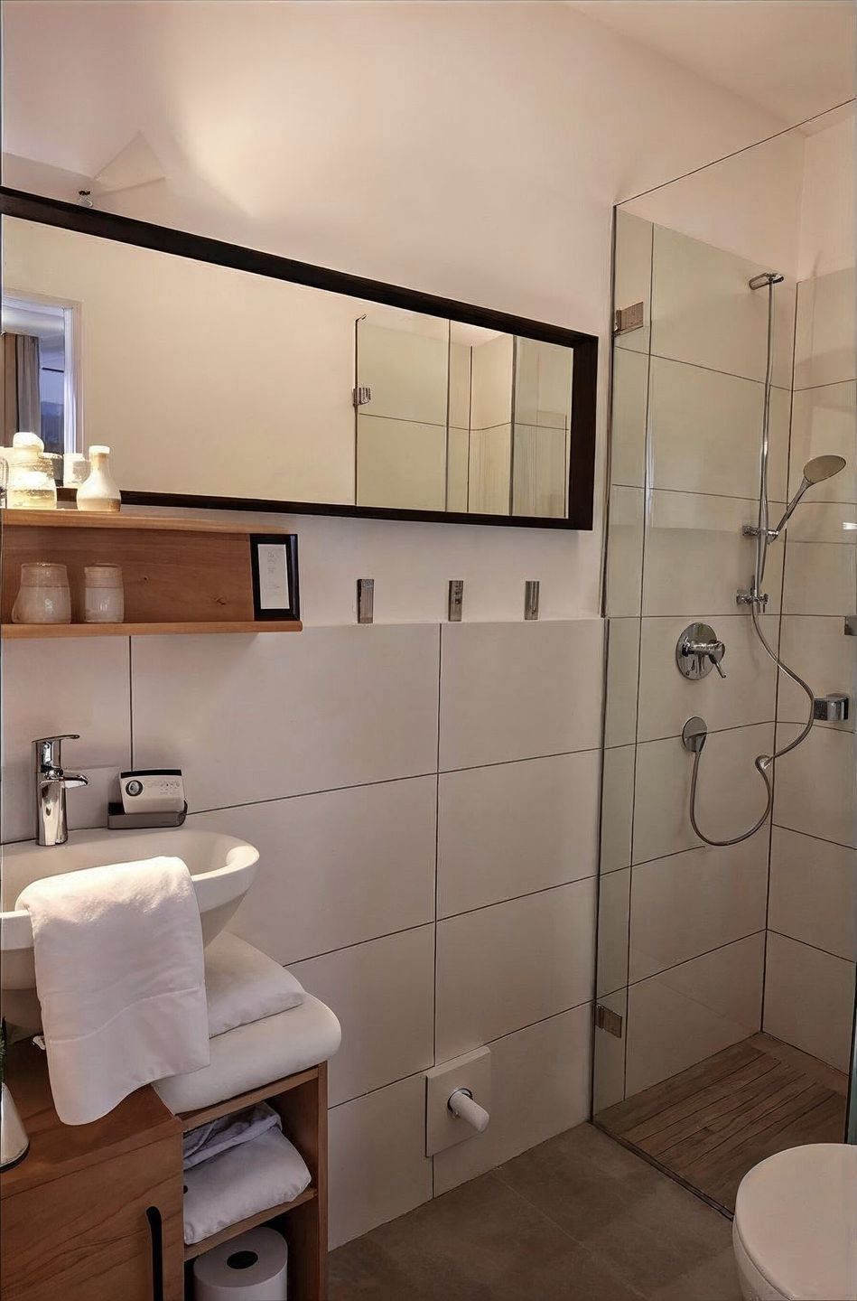 Das Badezimmer verfügt über eine bodengleiche Dusche, WC und Waschbecken; Spiegel und Abfalleimer sind vorhanden. Waschmaschine und Trockner stehen zur gemeinschaftlichen Nutzung ( gegen Gebühr) bereit; zusätzlich können Sie eine Sauna ( gemeinschaftlich und gegen Gebühr) nutzen.
