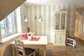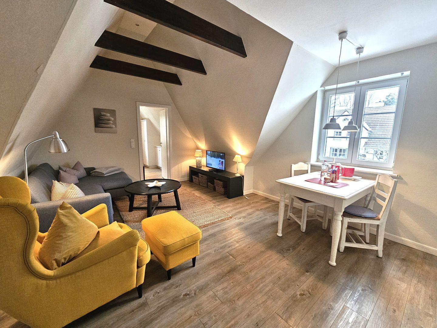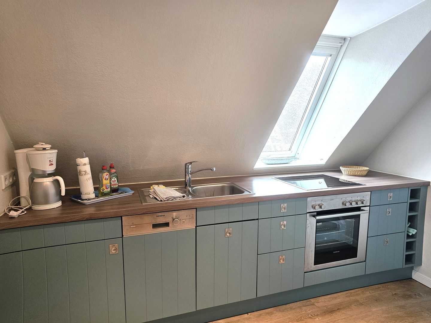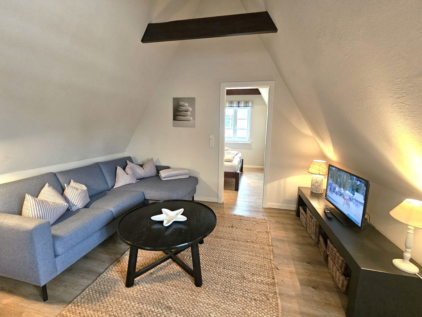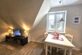 Der Wohnbereich ist mit Sofa und TV ausgestattet und bietet einen angenehmen Rahmen für entspannte Abende. Ein Essbereich mit Esstisch ist ebenfalls vorhanden. Die integrierte Kochnische ermöglicht eine flexible Selbstversorgung: Zur Ausstattung zählen Herd, Mikrowelle, Kühlschrank mit Gefrierfach, Spülmaschine sowie Kaffeemaschine, Wasserkocher, Toaster und das notwendige Geschirr, Besteck und Küchenutensilien.