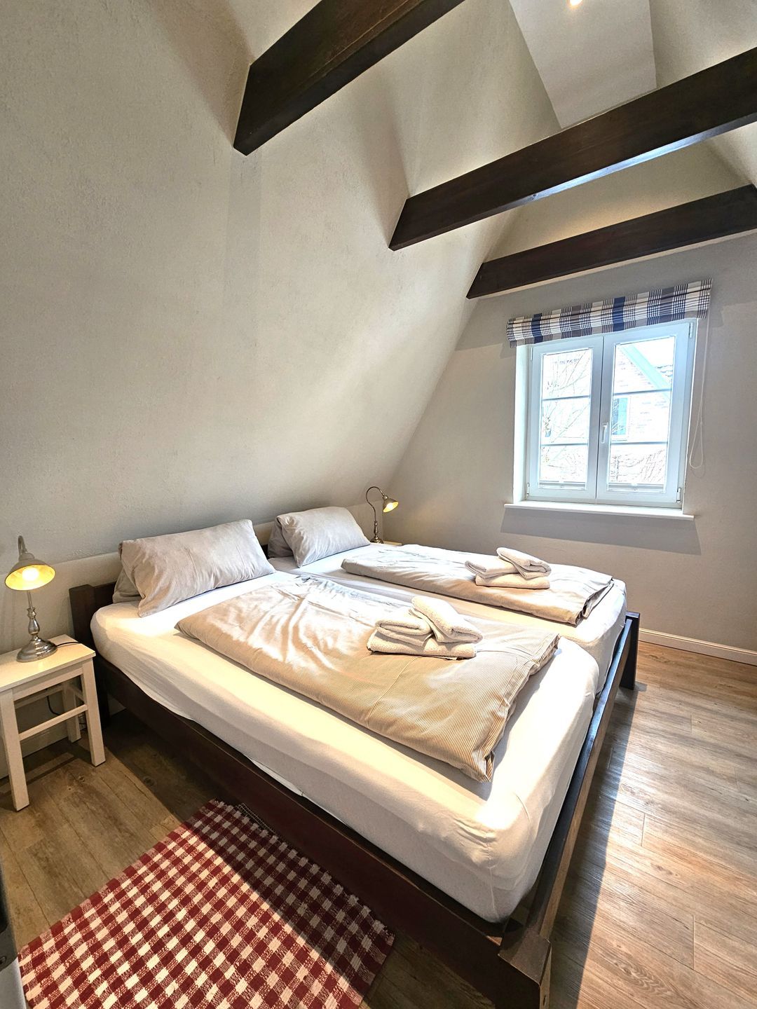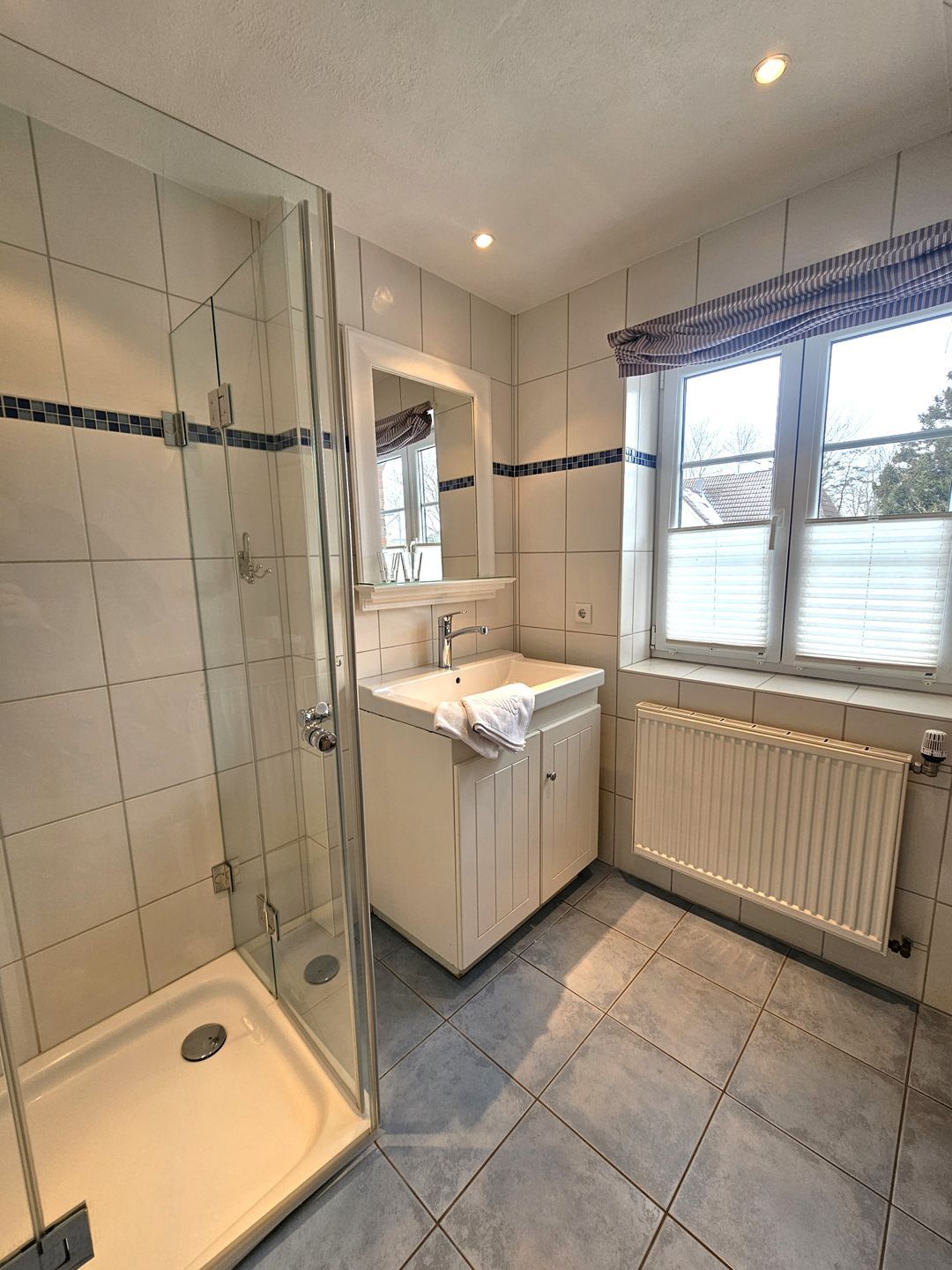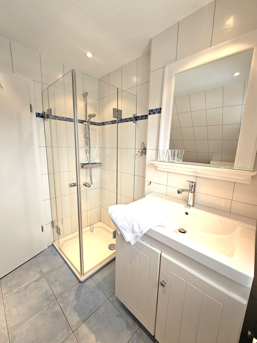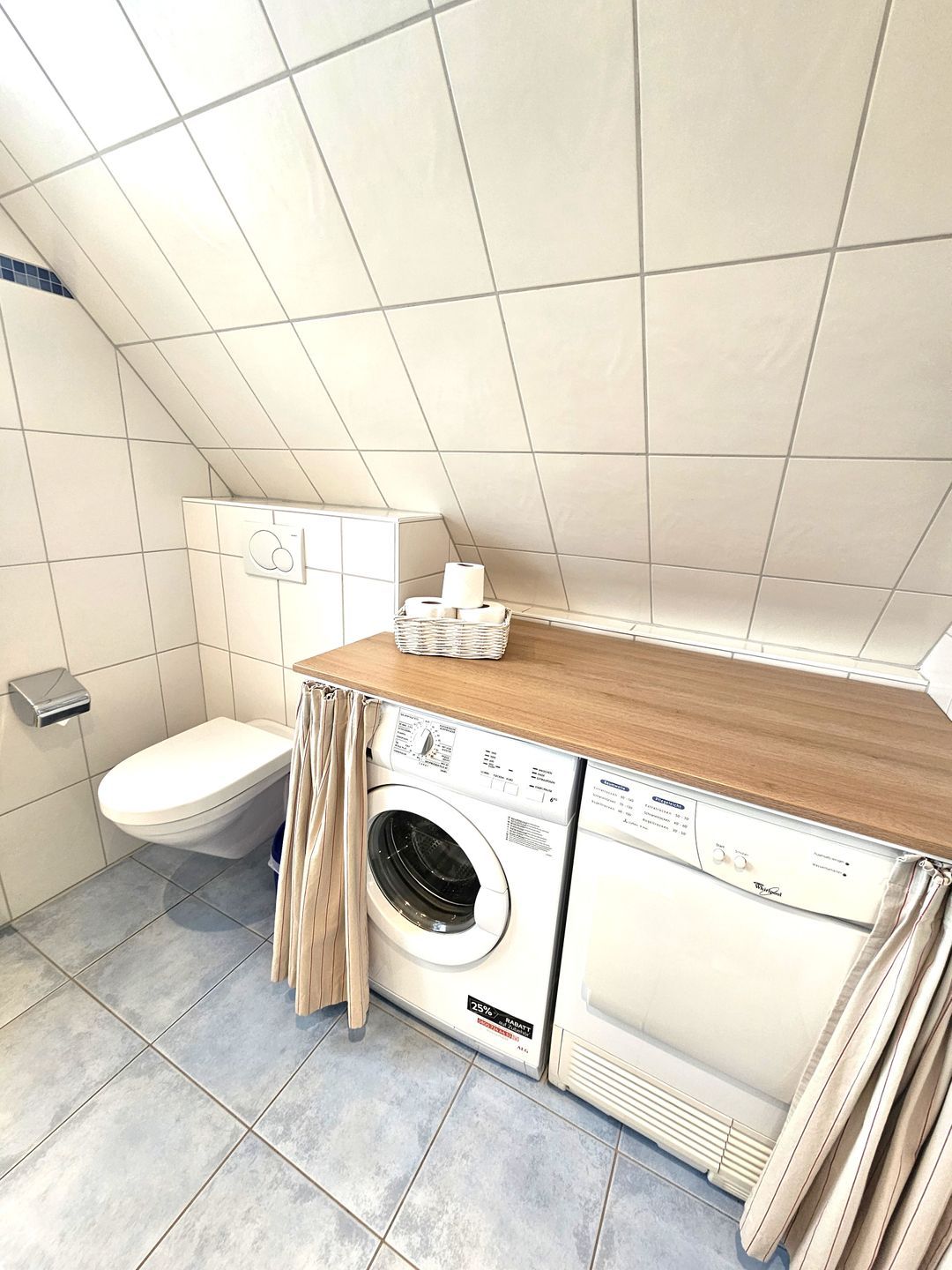 Das Badezimmer verfügt über Dusche, WC und Waschbecken. Für längere Aufenthalte ist die Eigennutzung von Waschmaschine und Trockner besonders praktisch.