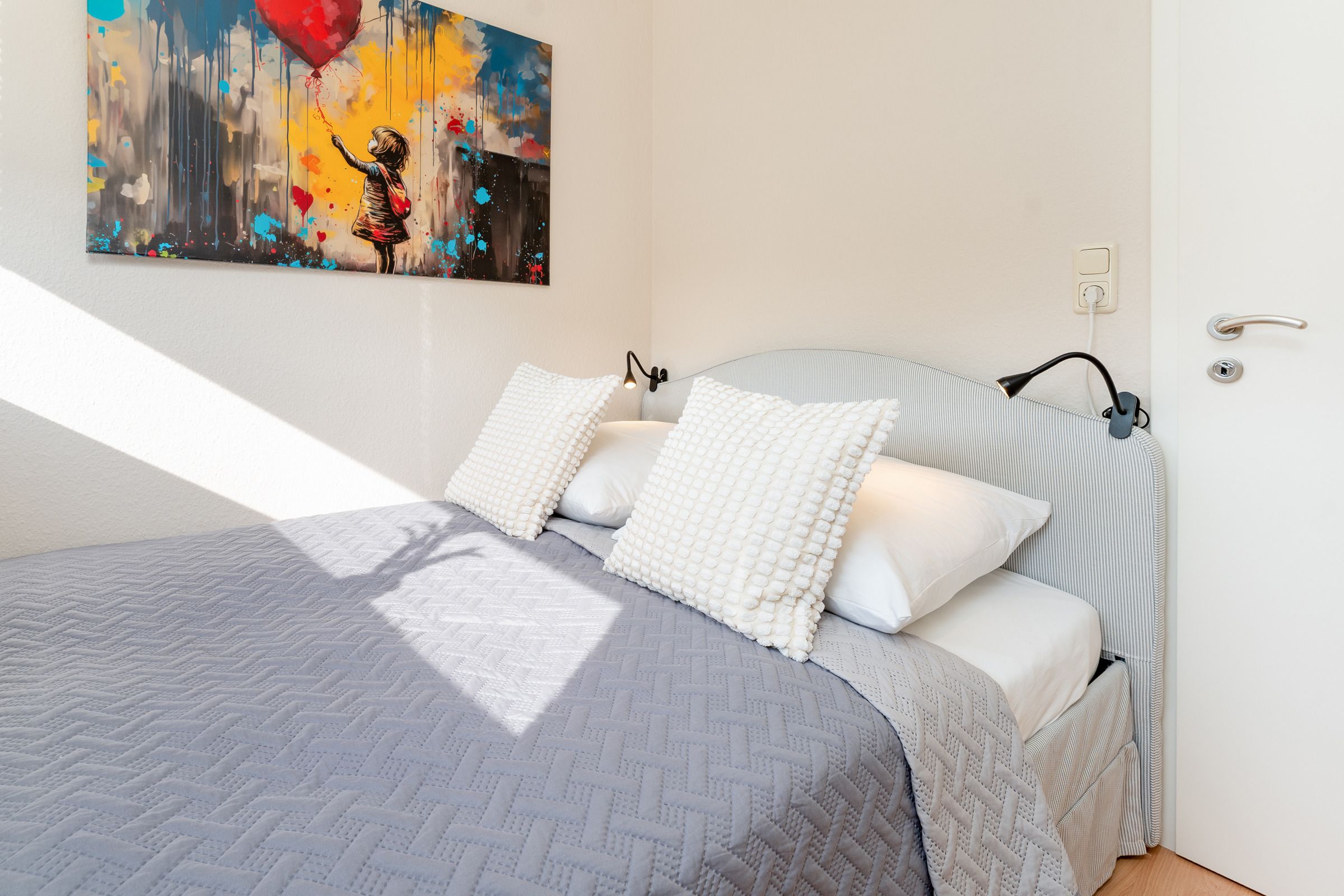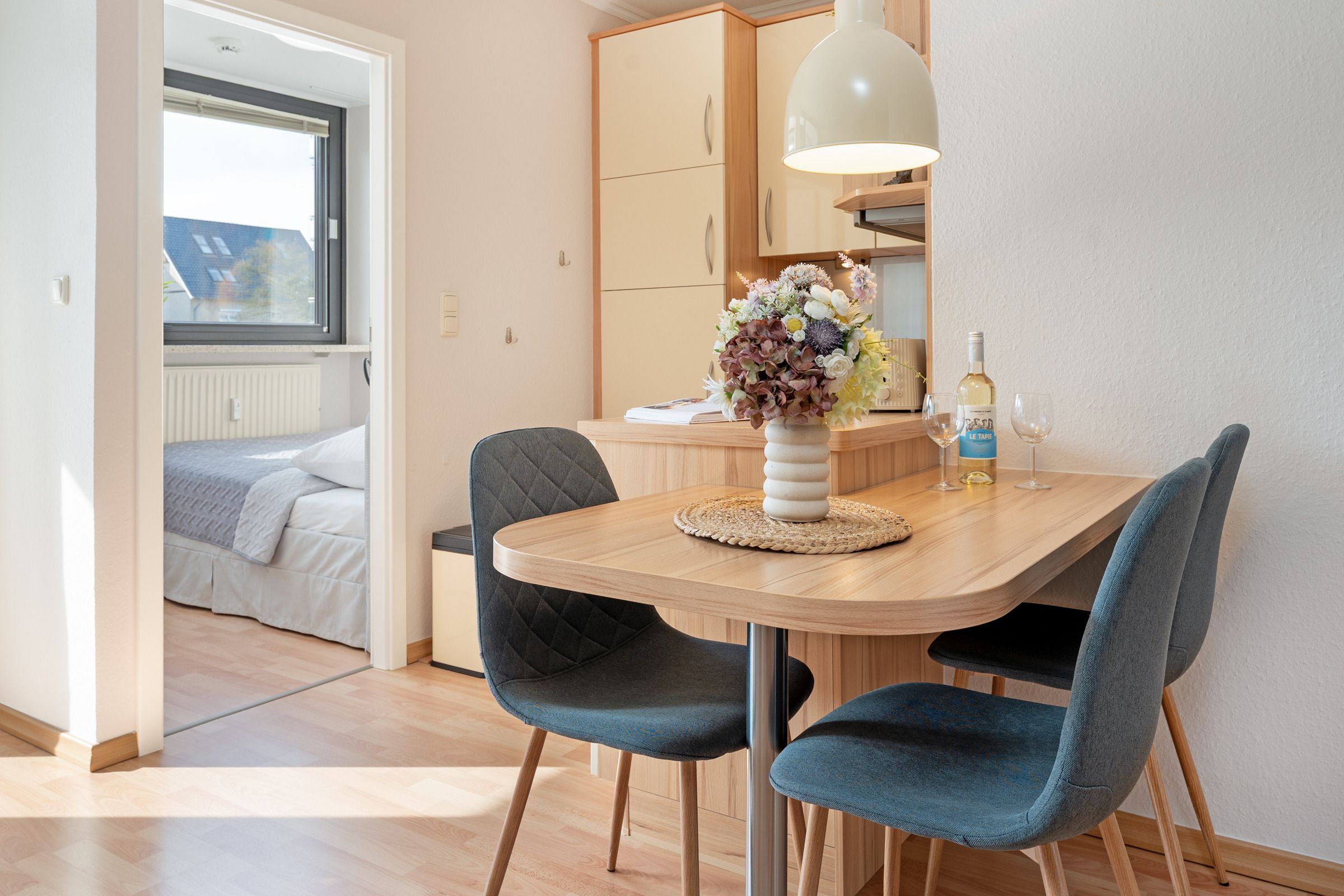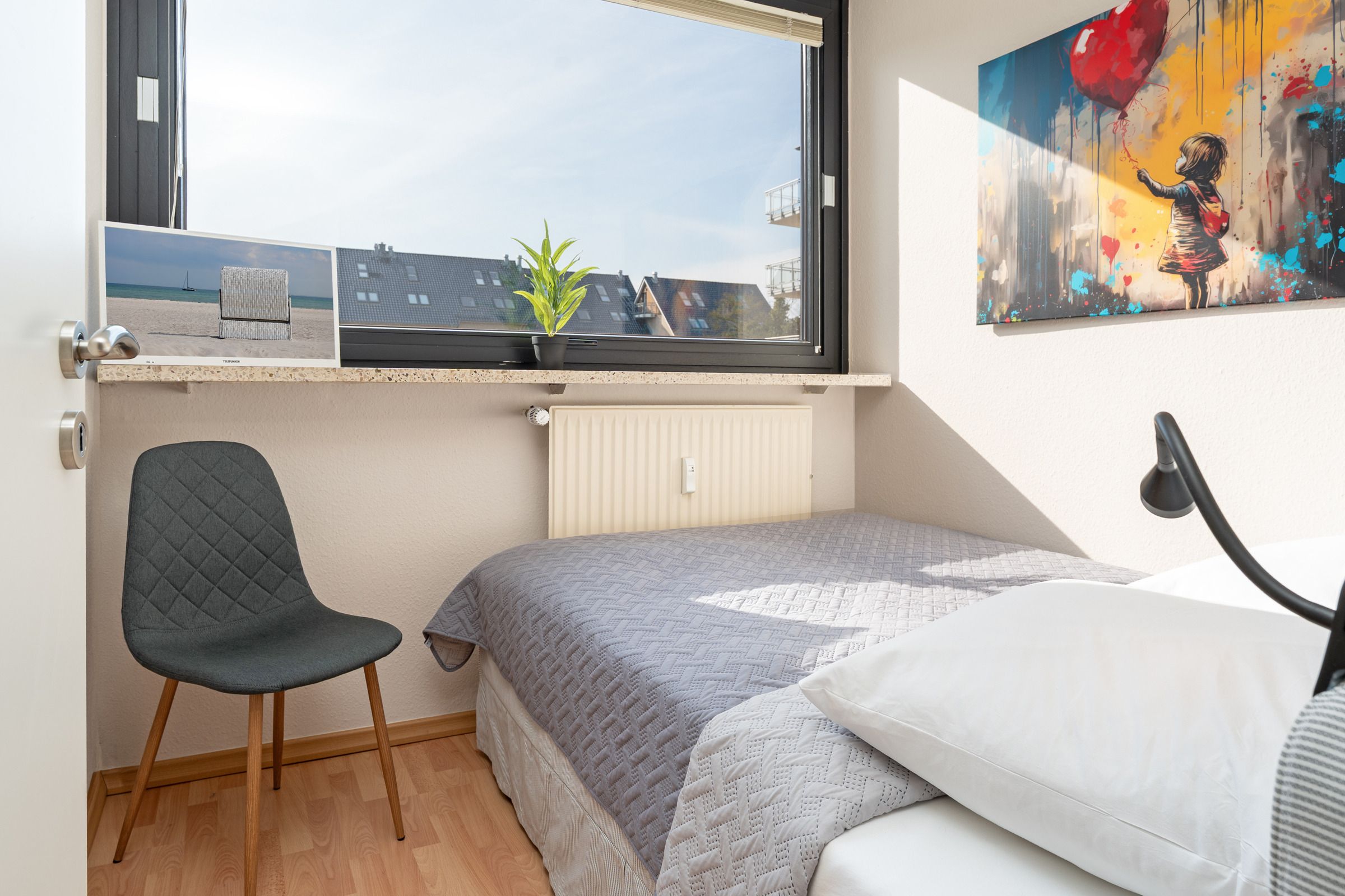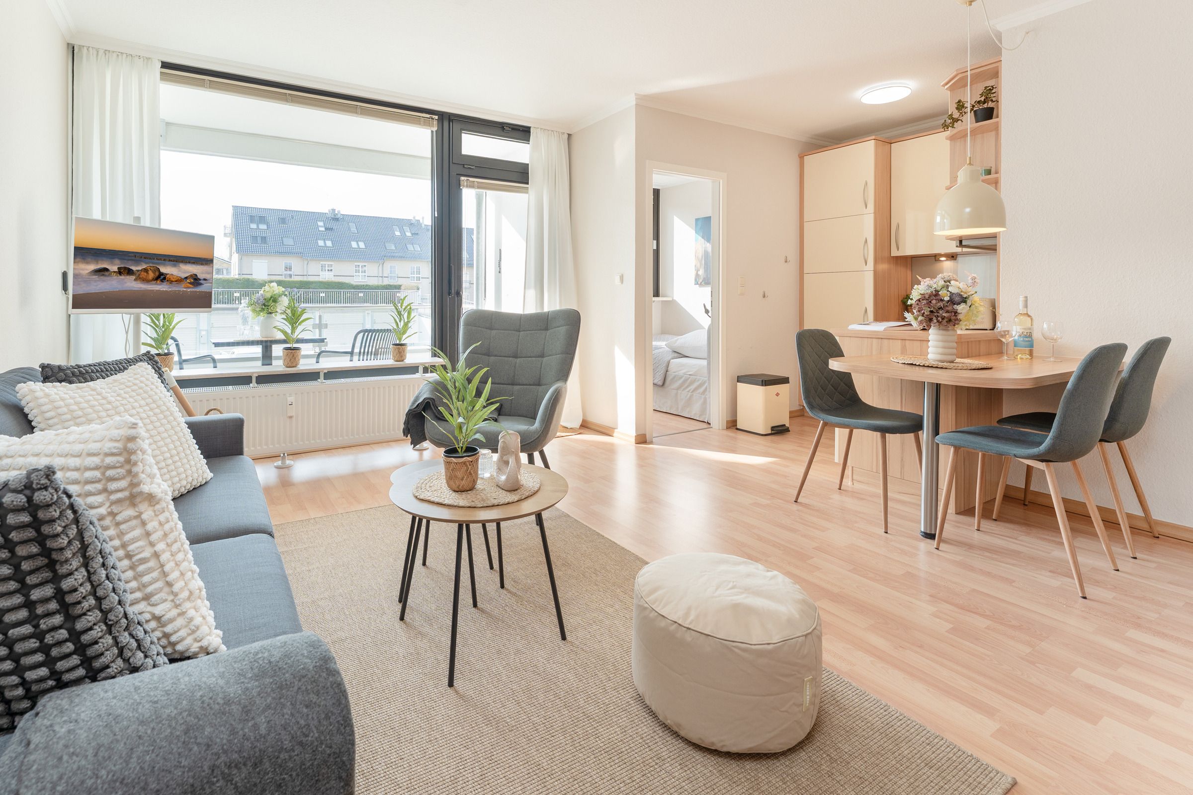 Der helle Wohnbereich bildet das Herzstück der Wohnung und lädt mit gemütlicher Sitzgelegenheit, TV und Radio zu entspannten Abenden nach einem Tag am nahegelegenem Strand ein. Von hier aus gelangen Sie auf den Balkon, auf dem Sie die frische Ostseeluft genießen können. Die moderne Küchenzeile ist bestens ausgestattet und verfügt u. a. über Cerankochfeld, Backofen, Geschirrspüler, Kühlschrank mit Gefrierfach, Kaffeemaschine (Filter und Senseo-Kapsel), Wasserkocher und Toaster. Ein Essbereich bietet Platz für gemeinsame Mahlzeiten. Das Schlafzimmer ist mit einem komfortablen Doppelbett ausgestattet, während im Wohnbereich eine weitere Schlafmöglichkeit zur Verfügung steht. Das moderne Badezimmer verfügt über eine Dusche, einen Haartrockner sowie einen beheizbaren Handtuchhalter. Ein Kinderhochstuhl kann bei Bedarf hinzugebucht werden.