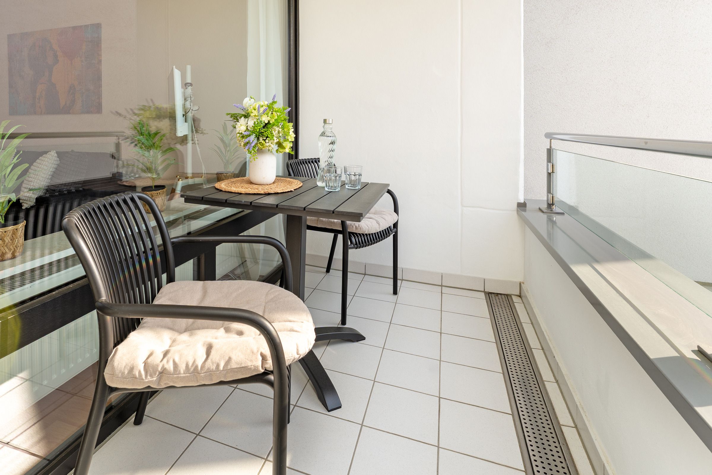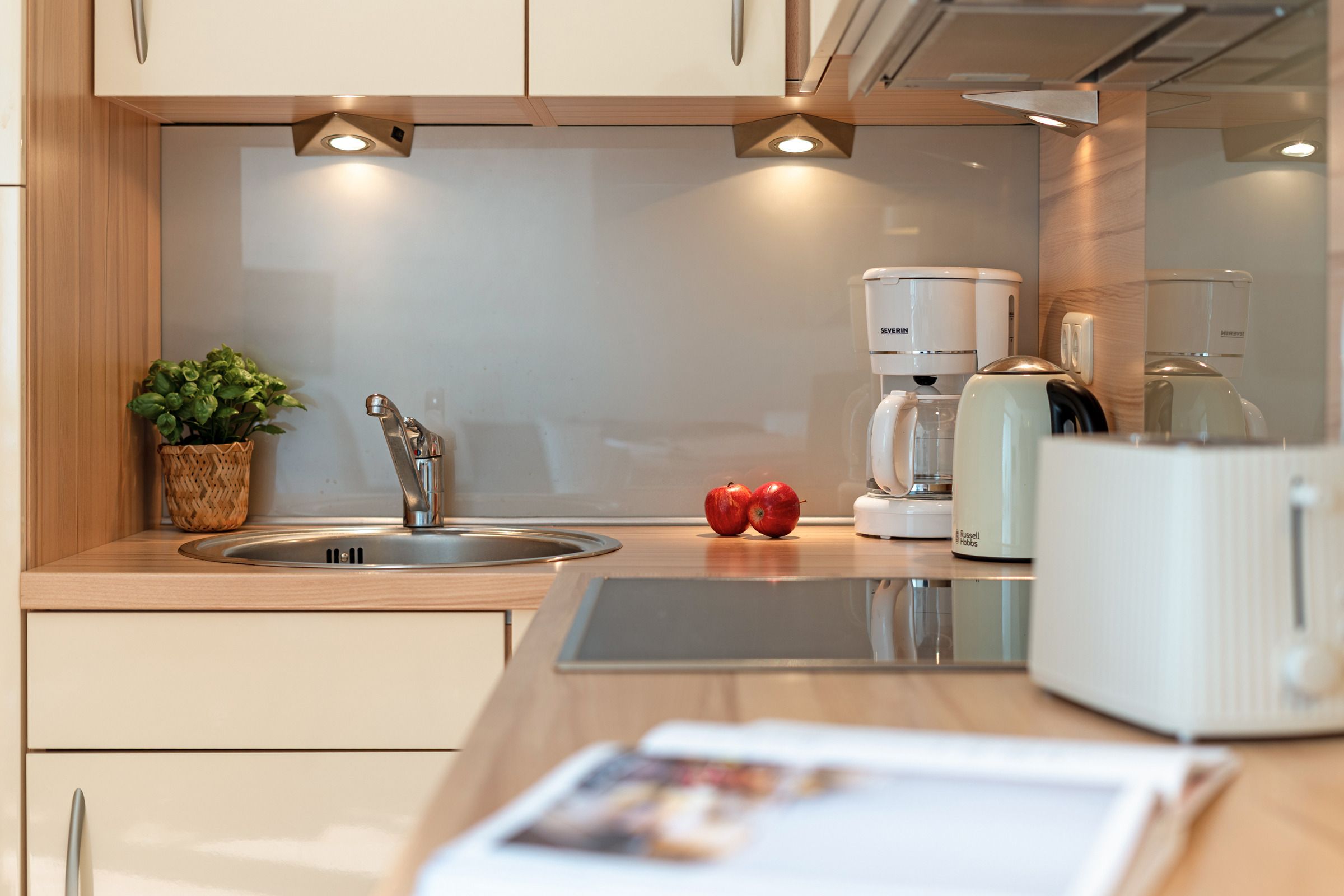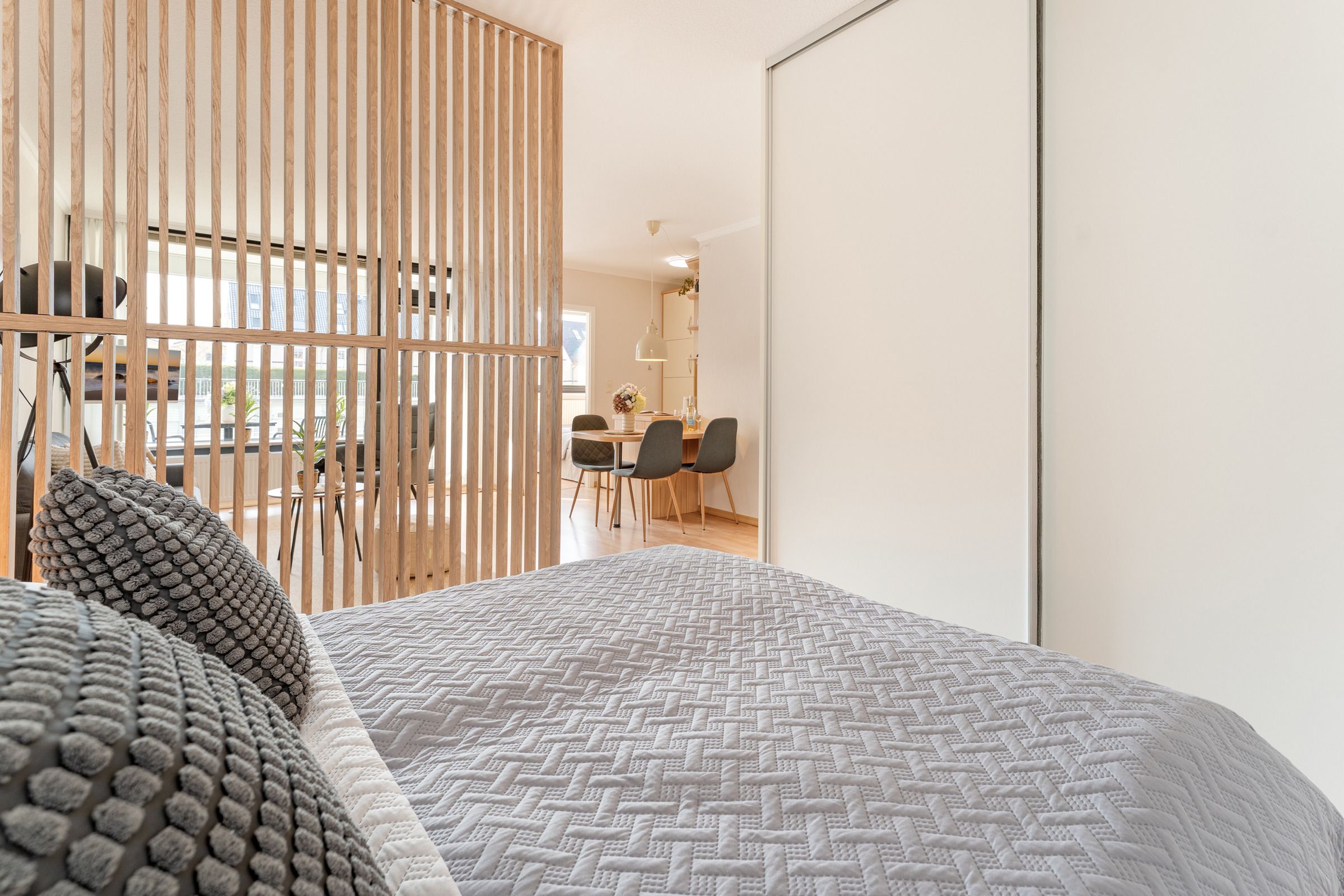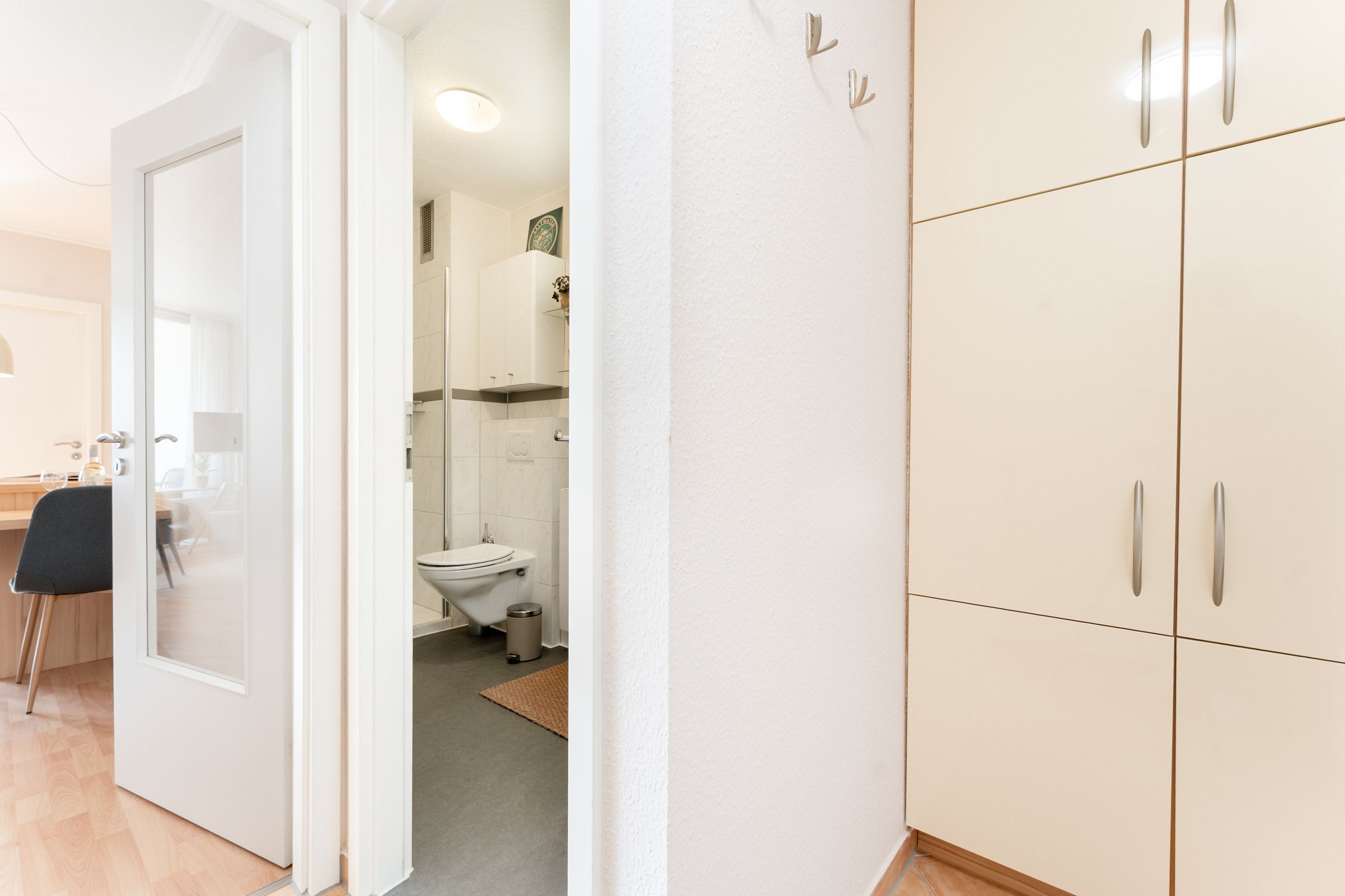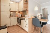 Der helle Wohnbereich bildet das Herzstück der Wohnung und lädt mit gemütlicher Sitzgelegenheit, TV und Radio zu entspannten Abenden nach einem Tag am nahegelegenem Strand ein. Von hier aus gelangen Sie auf den Balkon, auf dem Sie die frische Ostseeluft genießen können. Die moderne Küchenzeile ist bestens ausgestattet und verfügt u. a. über Cerankochfeld, Backofen, Geschirrspüler, Kühlschrank mit Gefrierfach, Kaffeemaschine (Filter und Senseo-Kapsel), Wasserkocher und Toaster. Ein Essbereich bietet Platz für gemeinsame Mahlzeiten. Das Schlafzimmer ist mit einem komfortablen Doppelbett ausgestattet, während im Wohnbereich eine weitere Schlafmöglichkeit zur Verfügung steht. Das moderne Badezimmer verfügt über eine Dusche, einen Haartrockner sowie einen beheizbaren Handtuchhalter. Ein Kinderhochstuhl kann bei Bedarf hinzugebucht werden.