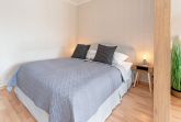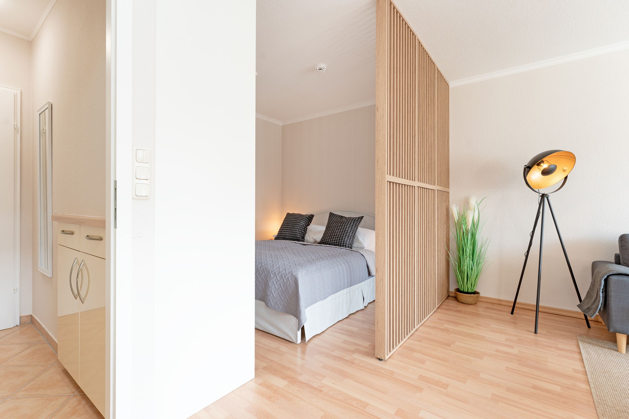 Wohn-Schlafzimmer: 1 Doppelbett (160 x 200 cm), Kleiderschrank, Verdunkelung: Vorhand und Jalousie, Smart-TV, kein Platz für ein Babybett vorhanden