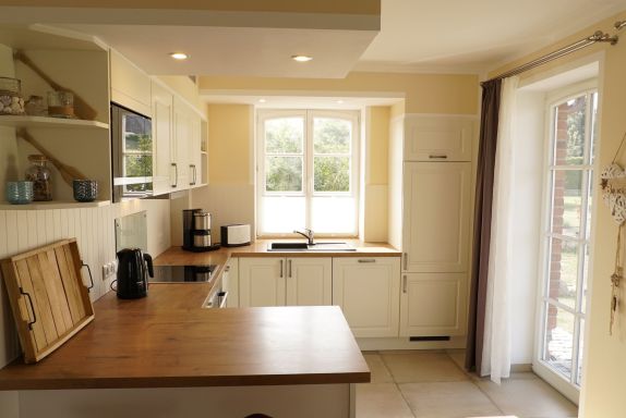 • Landhausküche mit schöner Sitzecke und Markengeräten