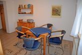 Im Erdgeschoss betritt man die Wohnung über einen Flur in den Aufenthaltsraum mit Esstisch mit Stühlen sowie einer Küchenzeile. Diese ist mit einem Herd, Wasserkocher, Kaffeemaschine, Toaster, Spülmaschine und Kühlschrank komplett ausgestattet.