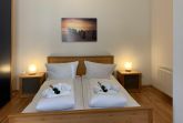 Das Schlafzimmer umfasst ein Doppelbett mit Nachttischen und Kleiderschrank sowie einen weiteren Balkon nach Süden.