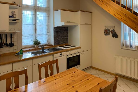 Über eine Treppe gelangt man hinunter ins Erdgeschoss mit Wohnküche und Bad. Die Einbauküche im Erdgeschoss ist komplett ausgestattet mit Kühlschrank, Elektroherd mit Backofen, Kaffeemaschine, Toaster, Wasserkocher, Geschirrspülmaschine sowie umfangreichem Geschirr. Der Esstisch bietet ausreichend Platz, um die kulinarischen Highlights der Insel 4 Personen servieren zu können.