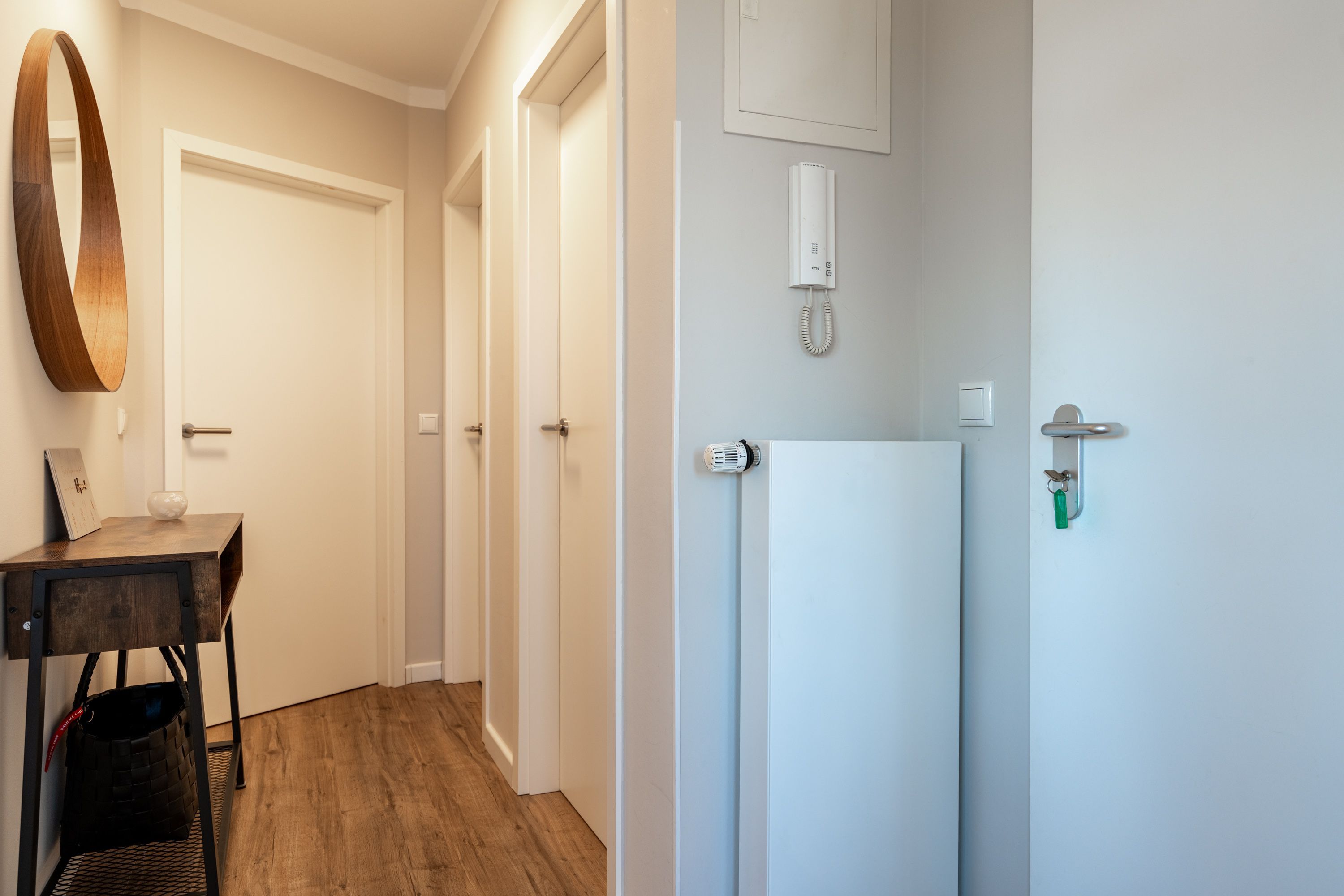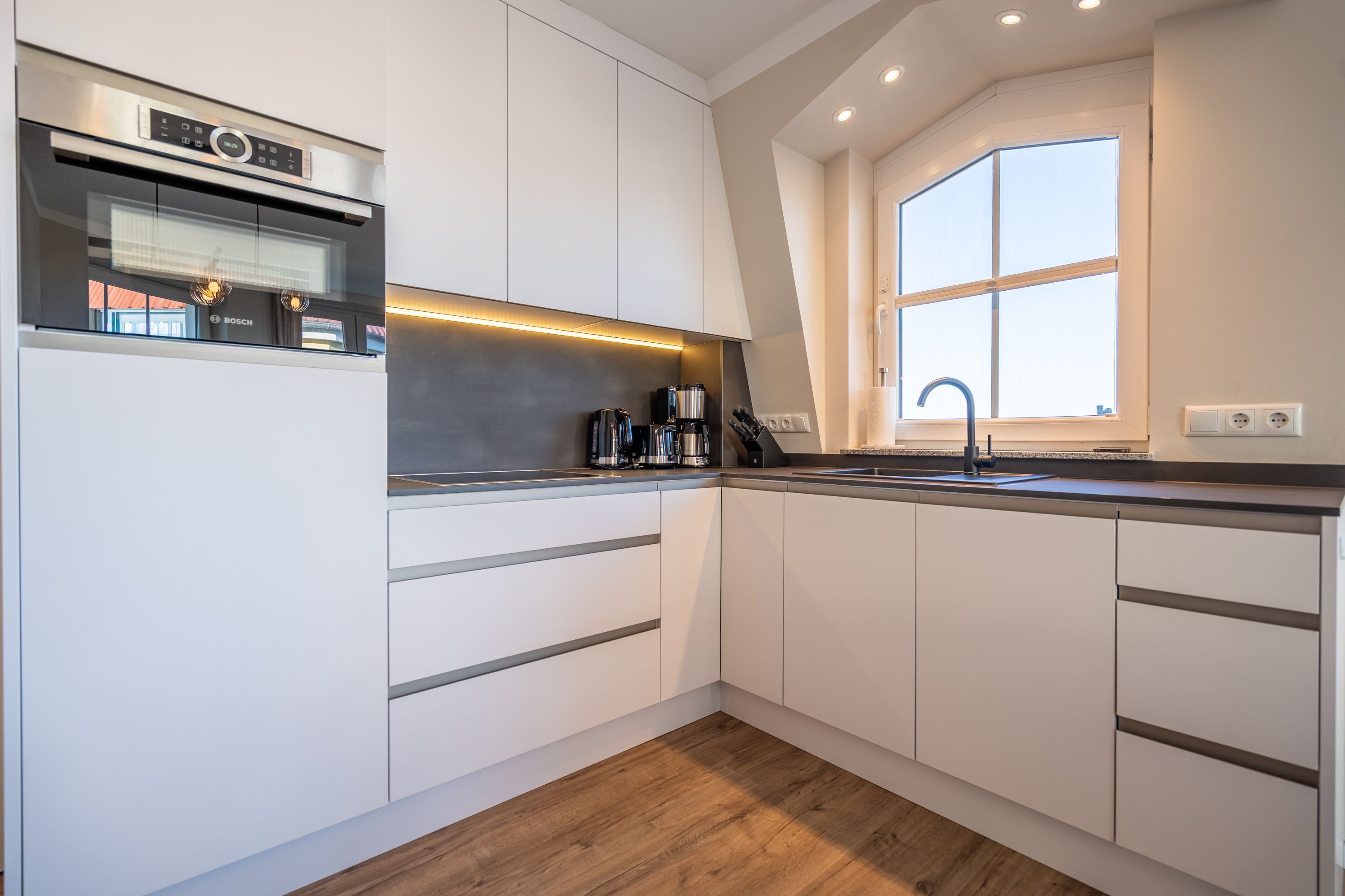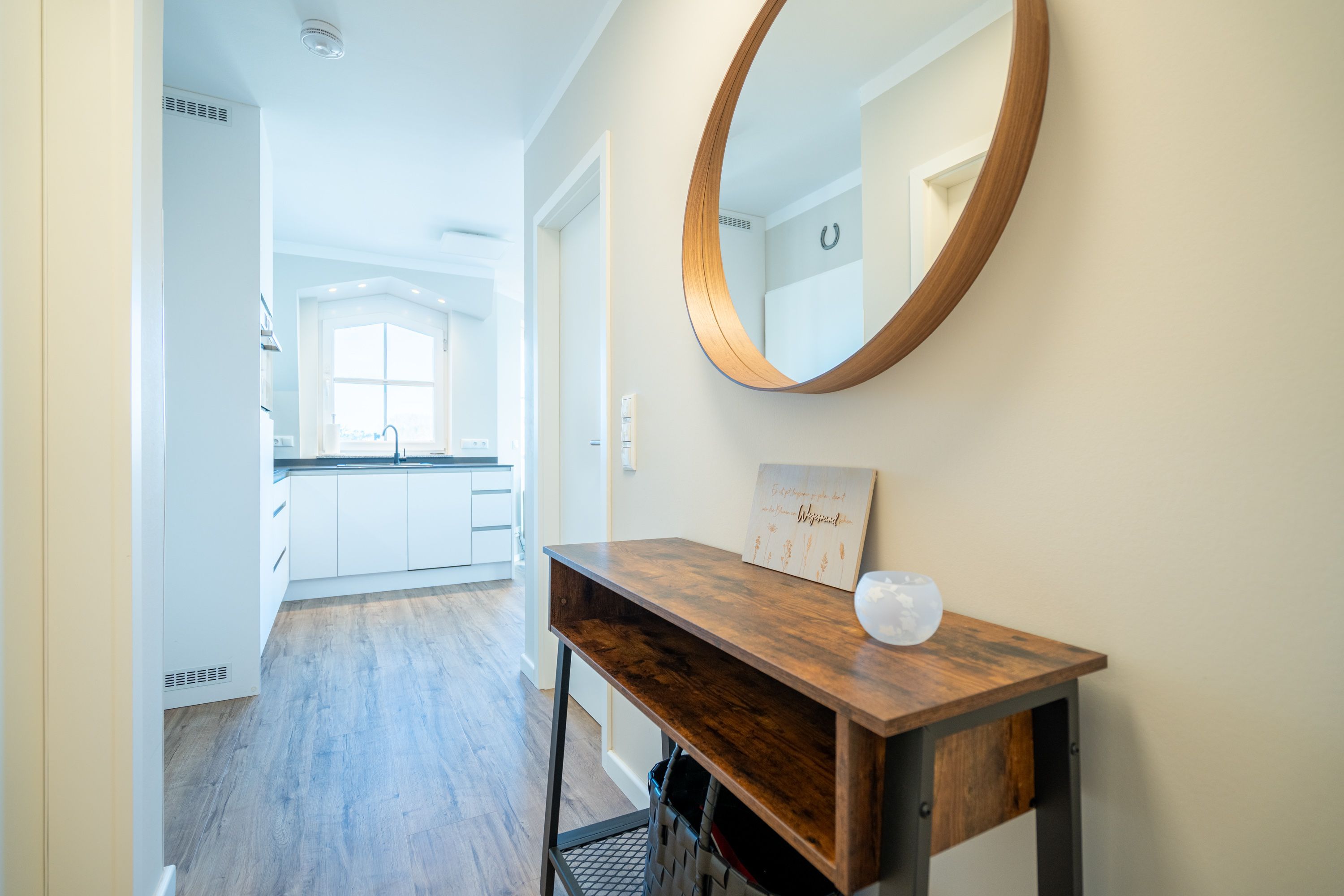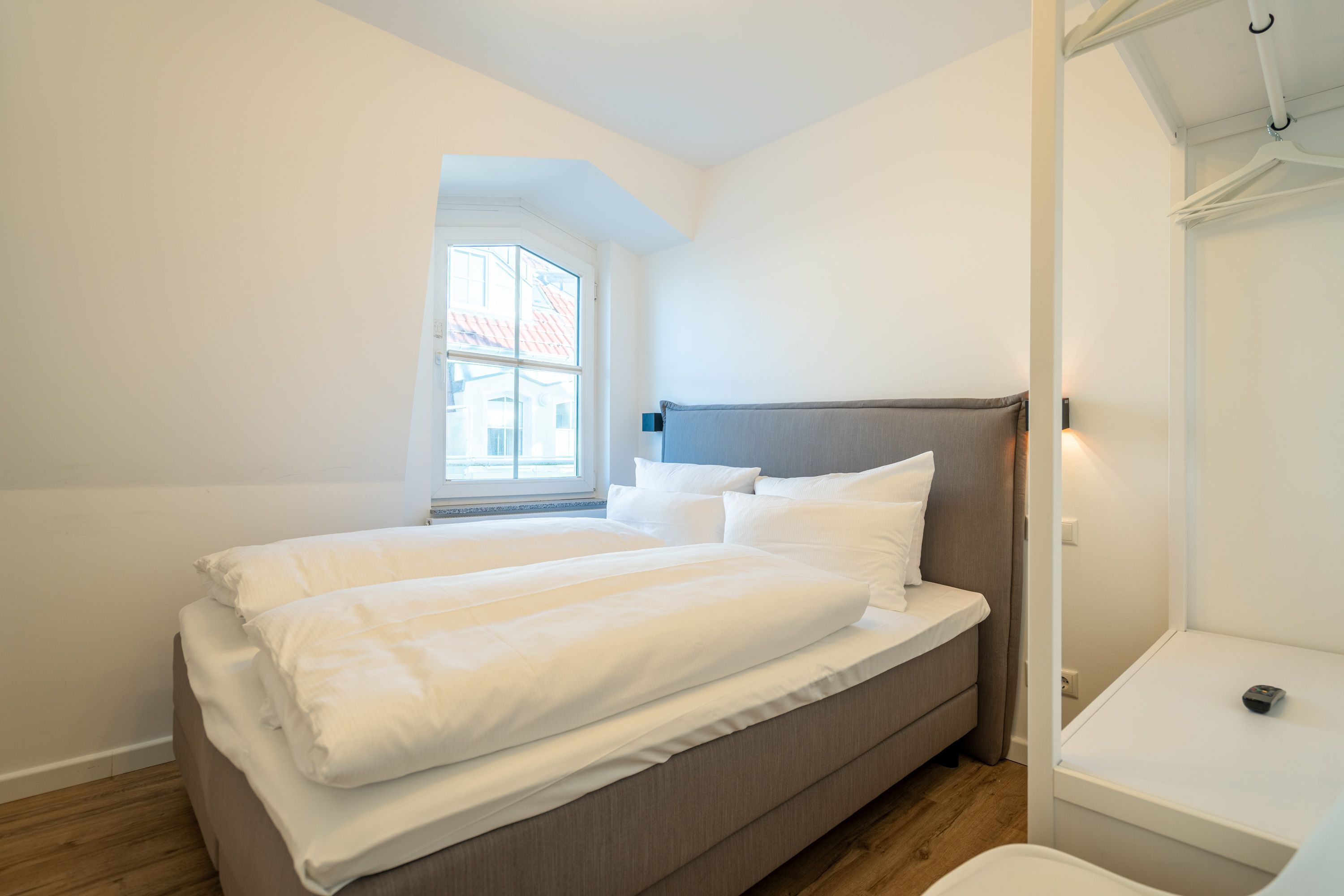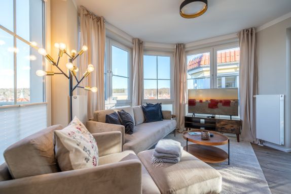 Dieses 3-Raum-Appartement bietet auf 53 qm Platz für bis zu vier Personen und ist ein angenehmer Rückzugsort für entspannte Urlaubstage am Meer. Der offen gestaltete Wohnbereich verbindet Wohnen, Kochen und Essen in einer freundlichen Atmosphäre. Die voll ausgestattete Küchenzeile verfügt unter anderem über Backofen, Induktionskochfeld, Geschirrspülmaschine sowie einen Kühlschrank mit Gefrierfach. Direkt daneben befindet sich der Essplatz für vier Personen. Die gemütliche Sitzgruppe mit Flat-TV lädt zum Entspannen ein. Für zusätzliche Wohlfühlatmosphäre sorgt ein Elektro-Kamin mit Fernbedienung. Vom Wohnbereich aus gelangen Sie auf beide Balkone des Appartements. Einer ist nach Nordwesten ausgerichtet und bietet einen schönen Meerblick. Der zweite Balkon liegt Richtung Süden. Das Appartement verfügt über zwei Schlafzimmer mit seitlichem Seeblick. Beide Räume sind mit komfortablen Doppelbetten ausgestattet, eines mit einer Breite von 1,80 m und das zweite mit 1,60 m. Ein Flat-TV gehört jeweils ebenfalls zur Ausstattung. Das Badezimmer bietet eine Dusche, einen Waschtisch und ein WC. Ein PKW-Stellplatz in der Tiefgarage kann genutzt werden.