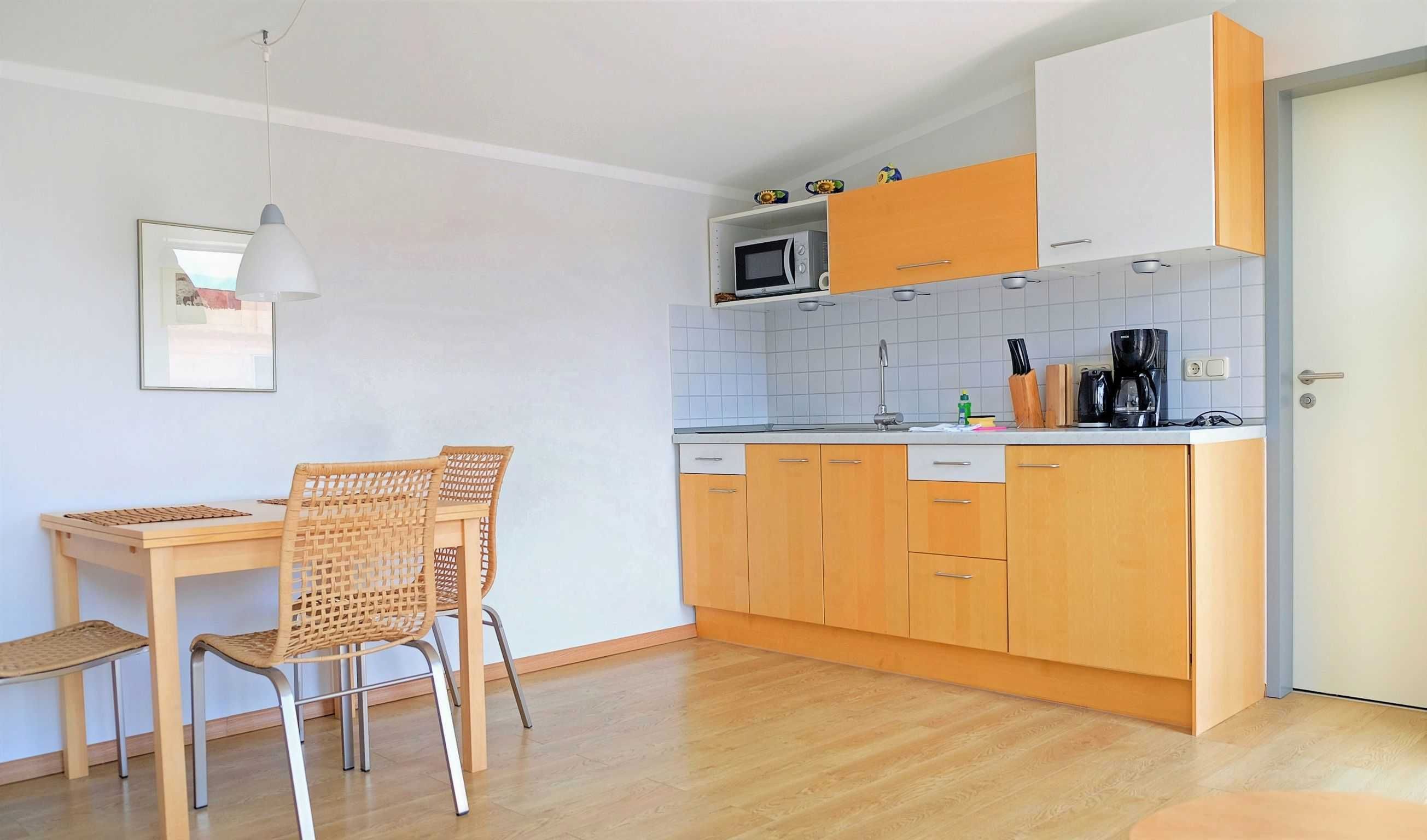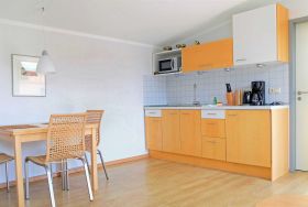 Die integrierte Küchenzeile ist komplett zur Selbstversorgung ausgestattet mit Kühlschrank, 2-Plattenherd, Spüle, Geschirrspülmaschine, Toaster und Kaffeemaschine sowie Geschirr und Besteck. Zur Wohnung gehört ein großer Balkon auf dem Sie bei schönem Wetter von morgens bis zum frühen Abend hin die Sonne genießen können.